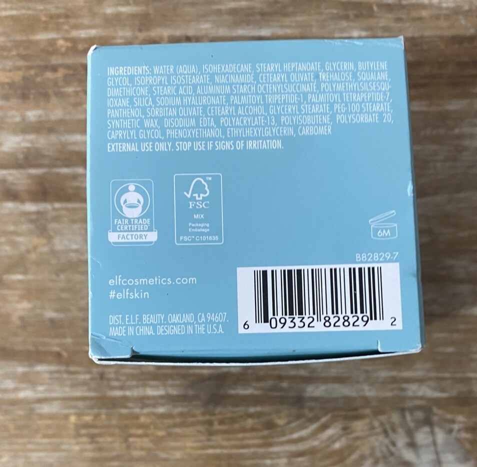 Active Ingredients: Hyaluronic Acid, Peptides, Niacinamide, Squalane, Vitamin B5 Formulation: Cream Volume: 1.76 Brand: ELF Type: Daily Use Color: White Ingredients: Hyaluronic Acid Size: Regular Body Area: Face Main Purpose: Moisturizer Period After Opening (PAO): 6M Features: Hydrating
