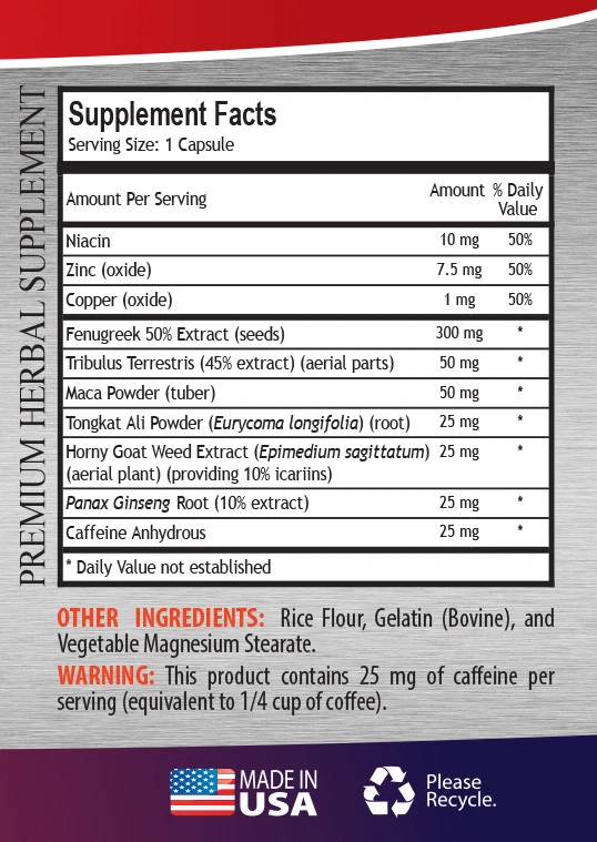 Best Testosterone Booster for Men With: Fenugreek 50% Extract, Tribulus, Maca, and Tongkat Ali All Natural Dietary Supplement Made in the United States (1 Bottle, 60 Capsules) Product Description. "Best Testosterone Booster" by Health Solution Prime consists of a blend of 100% safe and natural herbs from all over the world. These herbs are of top quality with maximum effectiveness and intended to be a fast acting male enhancement and energy boosting supplement. Benefits of Fenugreek Extract. One of the most common reasons men use fenugreek supplements is to boost testosterone. Some studies have found that it has beneficial effects, including increasing testosterone levels and boosting libido. In one study, researchers provided 500 mg of fenugreek per day and combined it with an 8-week weight lifting program. 30 college-aged men performed four training sessions per week, with half of them receiving the supplement. Compared to the non-supplement group who experienced a slight decline in testosterone, researchers found an increase in testosterone in the fenugreek group. This group also had a 2% reduction in body fat. When assessing changes in sexual function and libido, one 6-week study provided 30 men with 600 mg of fenugreek. The majority of participants reported increased strength and improved sexual function. Benefits of Tribulus Terrestris. Tribulus has long been used in traditional Chinese medicine, as well as in ayurveda to enhance athletic performance or increase libido. Tribulus is also said to raise your levels of certain hormones, including testosterone and estrogen, and is found in supplements claiming to increase testosterone levels. In addition, tribulus is purported to help a variety health issues such as high blood pressure, high cholesterol, kidney stones, sexual dysfunction, and act as a diuretic. Benefits of Peruvian Maca Root. Maca root as a strong testosterone support supplement due to the immense amount of nutrients and phytonutrients including some unique chemicals known as "alkylamides" which all help the body enter a state of homeostasis. Maca root may not directly increase testosterone but it does provide a rare set of nutrients which nourish the endocrine system and helps keep the body functioning properly so testosterone production can be maximized. Supplement Facts Serving Size: 1 Capsule Servings per Container: 60 Niacin - 10mg Zinc (oxide) - 7.5mg Copper (oxide) - 1mg Fenugreek 50% Extract (seeds) - 300mg Tribulus Terrestris (45% Extract)(aerial parts) - 50mg Maca Powder (tuber) - 50mg Tongkat Ali Powder (Eurycoma longifolia)(root) - 25mg Horny Goat Weed Extract (Epimedium sagittatum) - 25mg (aerial plant)(providing 10% icariins) - 25mg Panax Ginseng Root (10% Extract) - 25mg Caffeine Anhydrous - 25mg OTHER INGREDIENTS: Rice Flour, Gelatin(Bovine), and Vegetable Magnesium Stearate. WARNING: This product contains 25mg of caffeine per serving (equivalent to 1/4 cup of coffee). KEEP OUT OF REACH OF CHILDREN. DO NOT USE IF SAFETY SEAL IS DAMAGED OR MISSING. STORE IN A COOL, DRY PLACE. *These statements have not been evaluated by the FDA. This product is not intended to diagnose, , treat, or prevent any disease. PREMIUM QUALITY PRODUCT
