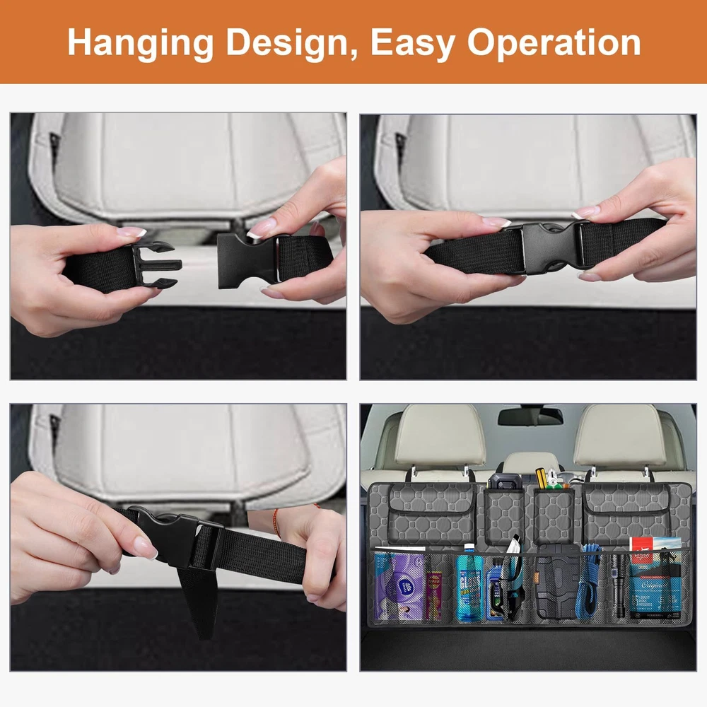 esouler Car Trunk Organizer, Super Capacity Car Organizer for SUV/Truck/MPV, Hanging Car Storage Organizer with 8 Pocekts - Grey Easy to install for car The car trunk organizer has 3 sturdy straps and snaps for easy installation in seconds. This hanging trunk organizer for SUVs, Jeeps, trunks, minivans and more is perfect for women's and men's car accessories. Waterproof Strengthen The collapsible car organizer is made of composite waterproof material, which is waterproof, splash-proof and easy to clean during daily use. Stricter sewing process requirements and durable materials make the product more load-bearing capacity, which can easily carry heavy sundries. size the car organizer has been improved and designed to fit a wider range of car models and storage needs. The size of the car organizer has been changed from approximately 30 inches to 44 inches, providing more storage space, four cloth pockets and four mesh pockets. Stability Design The car trunk organizer is designed with strong and stable buckle straps, you can adjust the length of the buckle straps according to your needs to make the product more stable and strong. Meanwhile, we also added four hook and loop straps on the back of the product to increase the stability of the product during trave Our suv trunk organizer of reinforcement strip are magic stick, suitable for seat back for felt material, not for leather, glossy, or suede. Shipping We offer FREE shipping on all orders! We ship within Three business days of payment, usually sooner. We use a selection of shipping services such as UPS, FedEx, USPS etc. We only ship to the lower 48 states, no APO/FPO addresses or PO Boxes allowed. Local pickups and combined shipping options are not provided at this time. Return You can return a product for up to 30 days from the date you purchased it. Any product you return must be in the same condition you received it and in the original packaging. Please keep the receipt. Feedback Customer satisfaction is very important to us. If you have any problem with your order, please contact us and we will do our best to make you satisfied. Contact Us If you have any queries, please contact us via ebay. We usually respond within 24 hours on weekdays. Please visit our eBay store to check out other items for sale! Thank you for shopping at our store.