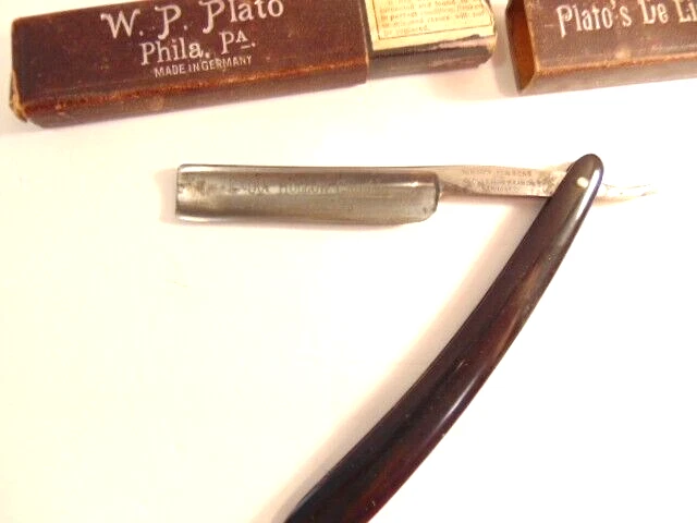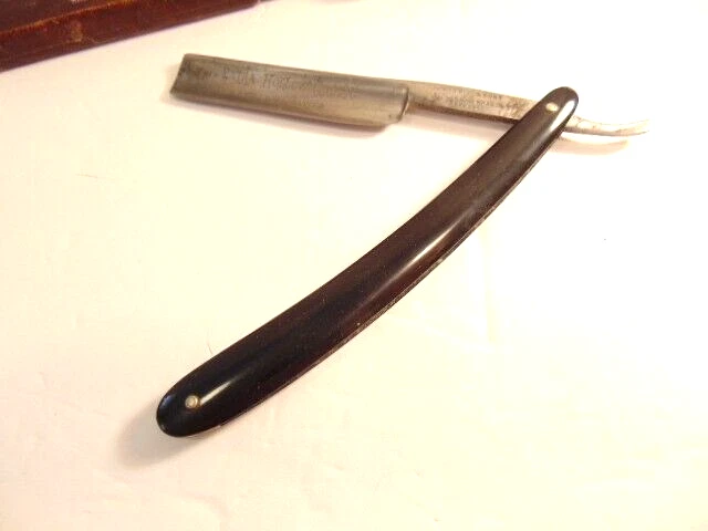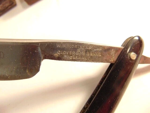 Here is an older extra Hollow Ground straight razor (etched on the face of the blade) and marker W.H. Morely & Sons, Clover Brand, Germany. The razor measures about 6 1/2 inches long. The blade itself measures 5 1/2 inches from tip to tip and is 5/8th inches wide. The razor shows signs of normal use with some wear, dirt scratches, and staining. There is some light wear on the handle, but no breaks or chips noted The box shows some wear and is not original to the razor. Please see the pictures and ask any questions. Thank you for looking. (Inv 23,421)