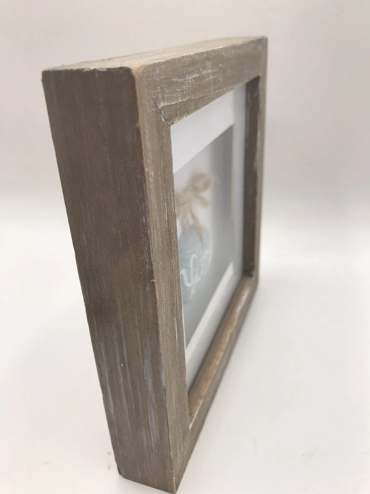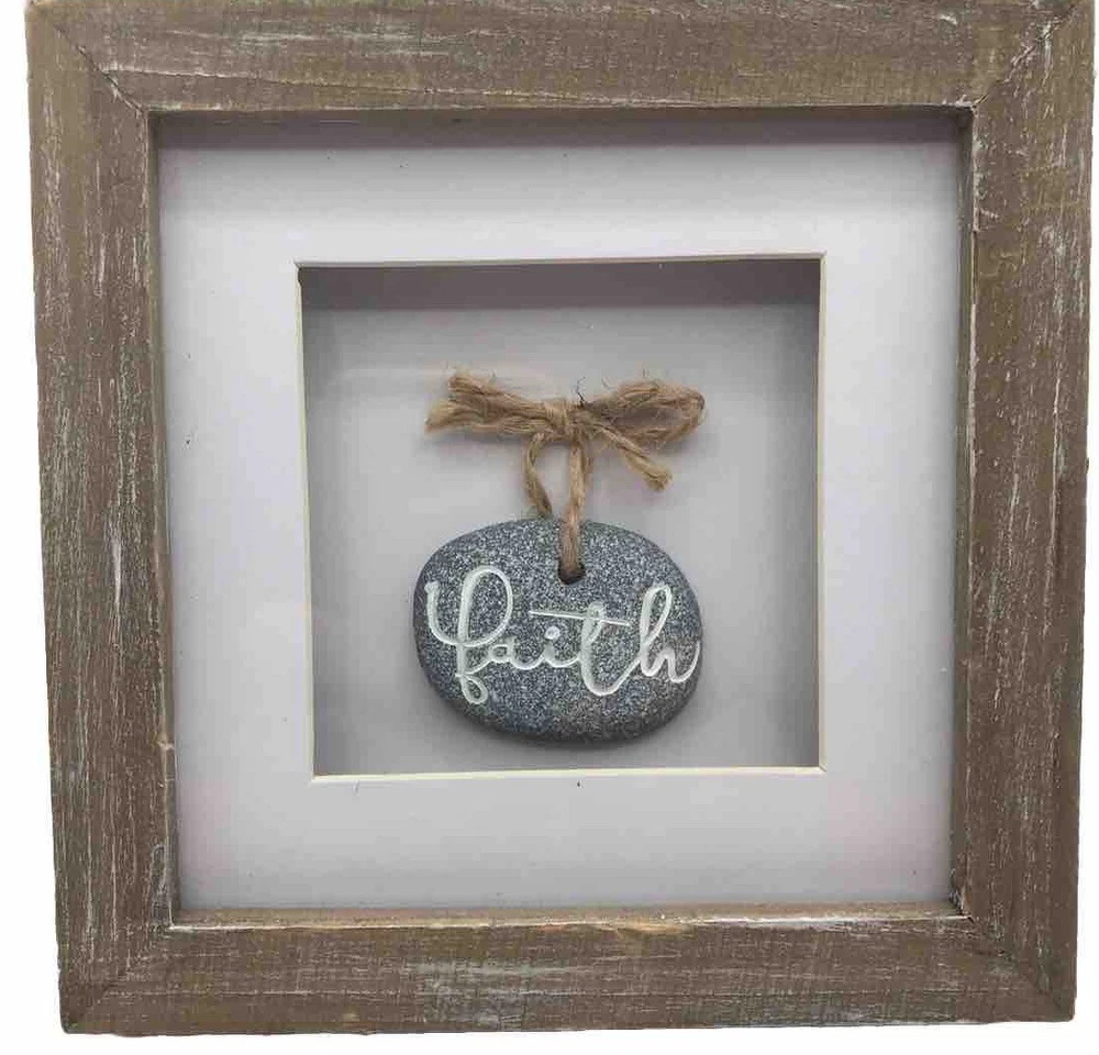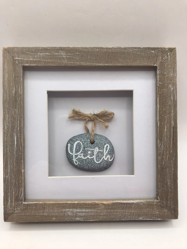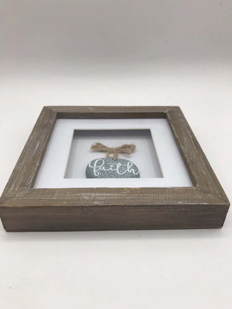 This vintage stone wall hanging/shadow box by New View Gifts is a small, square 6” plaque in great condition. It features a grey blue stone engraved with the word ‘faith’ in white cursive and framed in an aged grey wood shadow box frame. The matting is white. Measuring 6" in length and height, this vintage piece is engraved with the word 'faith' and weighs 7 oz. It can be mounted on the wall or placed on a surface, making it a versatile and meaningful addition to your home decor or home altar.
