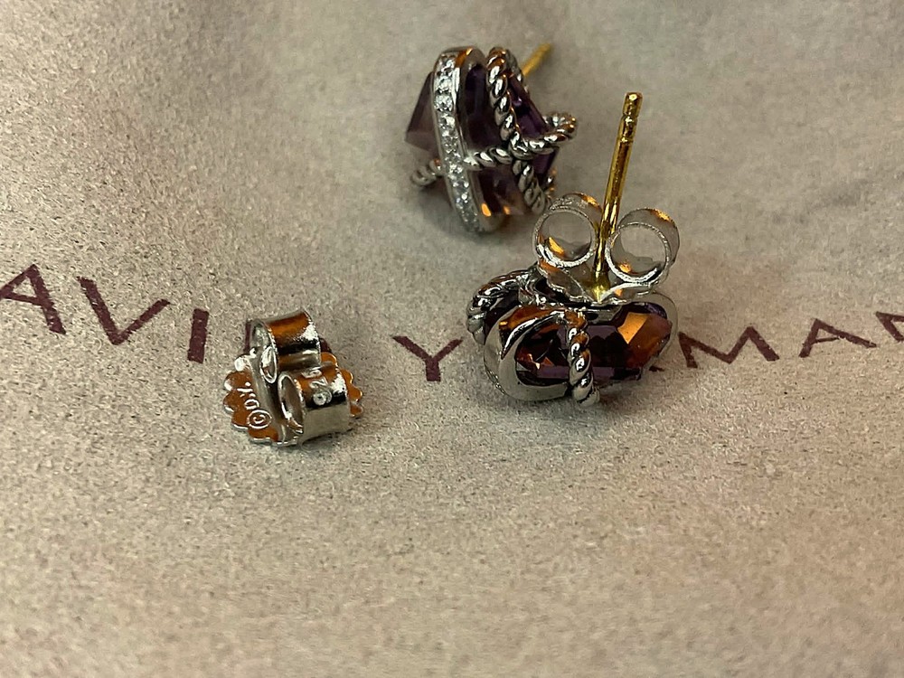Elevate your jewelry collection with a pair that effortlessly blends modern elegance and natural beauty — the David Yurman Amethyst Cable Wrap Earrings (10mm) in a stunning mint condition. These iconic earrings showcase David Yurman’s signature cable design, gracefully wrapped around radiant 10mm amethyst stones that catch the light with every movement. The rich, regal hue of the amethyst adds a touch of sophistication while remaining versatile enough for both everyday wear and special occasions. Carefully maintained and preserved, these earrings are in mint condition and come complete with their original care pouch , making them a perfect choice for collectors or anyone seeking a luxurious yet timeless accessory. Whether you're treating yourself or searching for a meaningful gift, this pair offers unmistakable craftsmanship, enduring style, and exceptional value — all in one beautiful package. Don’t miss the chance to own a classic piece that never goes out of style. Please has any questions before buying. Happy eBaying!!!!