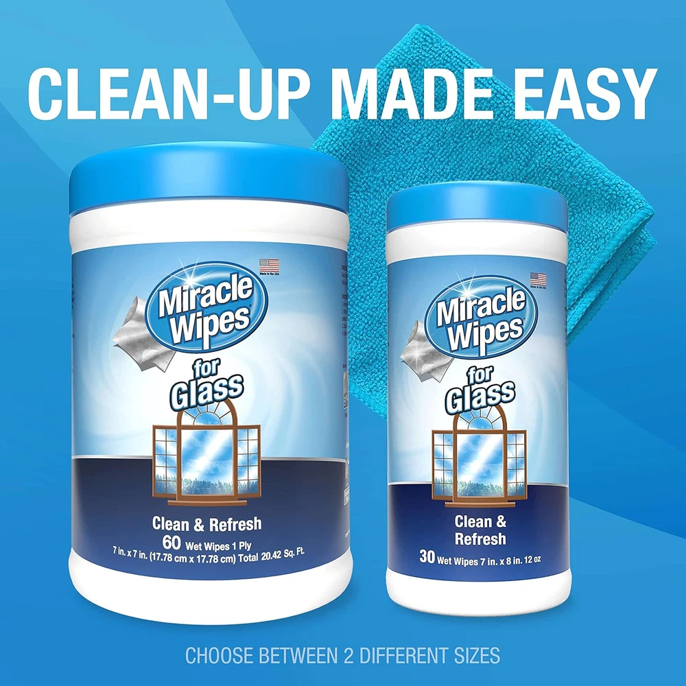All Purpose Glass Wipes – Our premium glass cleaner wipes can be used on a myriad projects including window, car, mirror, stove top, and screen cleaning, making this a fantastic go-to option for the home, office, kitchen or classroom. Beautiful Streak-Free Shine – These glass cleaning wipes effortlessly clean away messes while leaving behind a crystal clear surface for stunning clarity. Following wipes with a microfiber cloth is recommended to leave surfaces and appliances looking polished and brand new every time. Cleaner Glass and Surfaces – These wipes can be used to wipe away sticky fingerprints, smudges, dust and dirt, and other grimy buildup, making them a verstatile deep-cleaning option for any indoor or outdoor project. Pre-Moistened, Lightly Scented – Gentle on all surfaces, these glass wipes offer a lint-free finish and light, fresh scent to give you a safe, more refreshing clean. Quick Disposable Convenience – Our window and mirror wipes come in an easy-to-dispense container and can be thrown away when you’re done for a mess free finish. Do Not Flush Product Description No Finger Prints Easily clear tough fingerprints and hand markings from various glass surfaces, leaving them looking crystal clear and brand new. Quick-Dry Formula Our wipes dry quickly to ensure they don’t leave behind streaks or sticky residue, making them safe and effective for the many surfaces in your home or office. Surface-Safe Use MiracleWipes for Glass are designed to clean any glass area easily without causing damage, keeping the cleaning of these surfaces flawless and easy. Gentle and Ammonia-Free Protect your home by cleaning without the risk of damage that can come from other, harsher cleaning wipes.