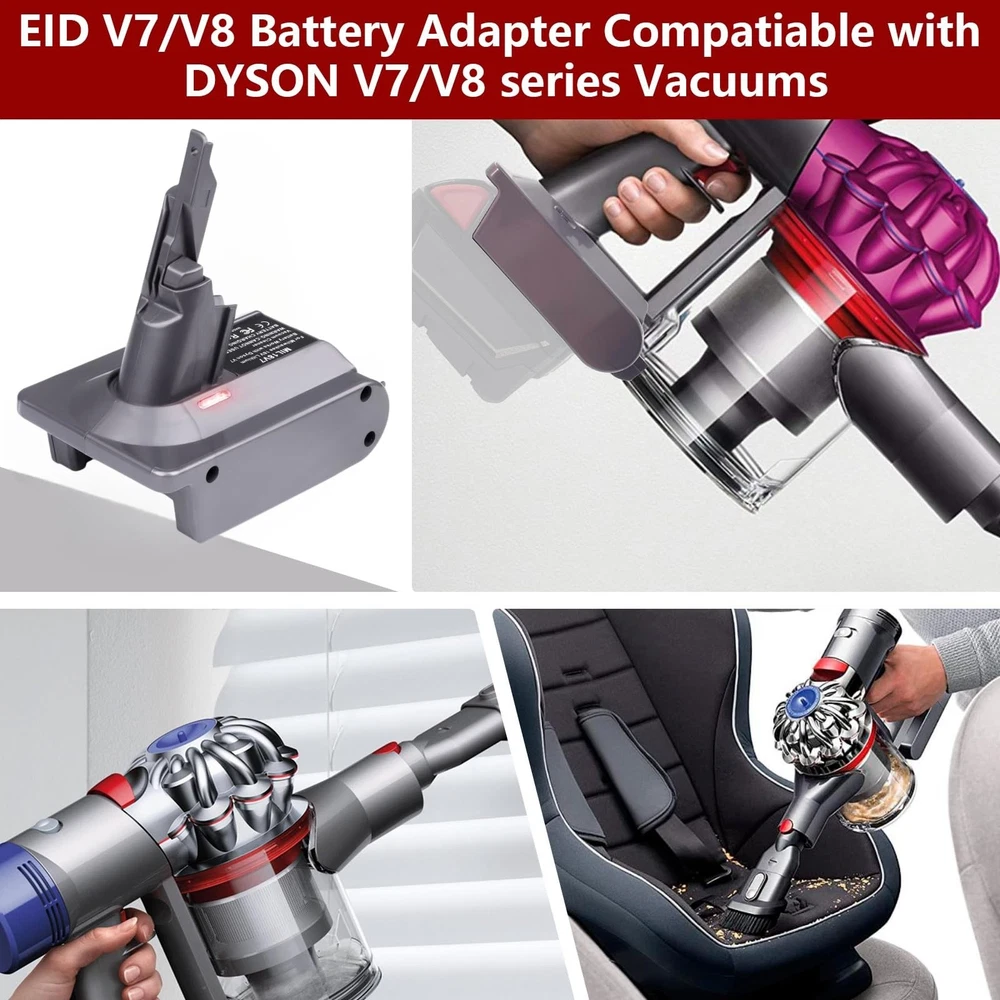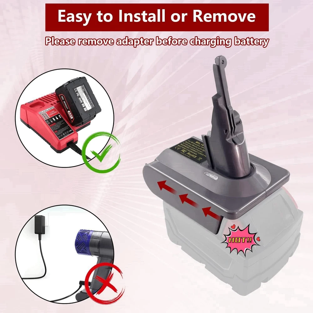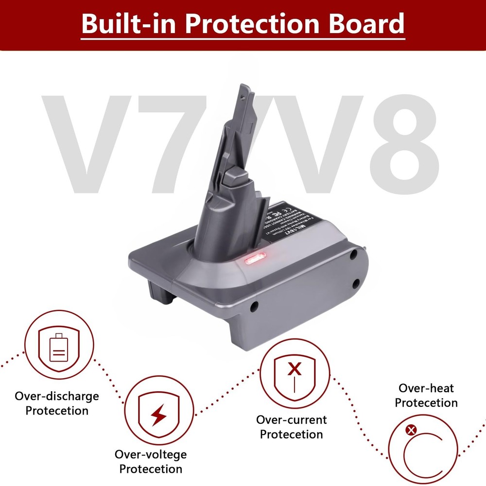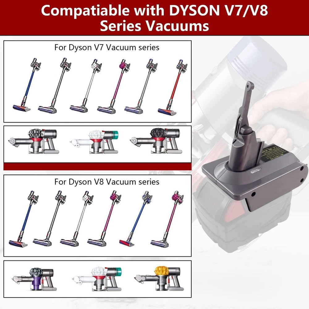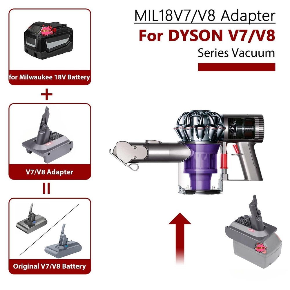 for Milwaukee Use for Dyson V7+V8 Vacuum Cleaner,for Milwaukee M18 18V Lithium Battery Fit for V7 V8 SV10 SV11 Animal Absolute Motorhead Trigger Stick Handheld Vacuum Cleaners Description Battery adapter Features: Adapter Compatible with Dyson V7 V8 Series VacuumOur V7/V8 battery converter's upper interface works with V7 and V8 Series Vacuum Cleaners, such as V7 Motorhead, V7 Fluffy, V7 Animal Pro+, V7 Trigger, V7 Trigger, V7 HEPA, V7 Car+boat, V7 Absolute..V8 Animal, V8 Absolute, V8 Fluffy, V8 Motorhead, V8 Carbon Fiber, V8 Slim, etc. Compatible with Dyson V7 and V8 SV10 Slim series cordless stick and handheld Vacuum Cleaner. Suitable for Milwaukee M18 18V batteryApplicable for Milwaukee M18 18 volt lithium-ion Compact and XC Cordless Tool Battery Packs 48-11-1862, 48-11-1850, 48-11-1840, 48-11-1835 etc High Output Battery. Recommend to use 4A and above batteries because of the high power for Dys0n vacuum. Easy to install or remove: Our 2-in-1 battery adapter can replace for V7 and V8 SV10 SV11 batteries, Reuse for your Milwaukee batteries and save your money on buy new V7 V8 replacement battery frequently. More powerful than original V7 V8 SV10 SV11 battery, provide longer running time. Smart Protection SystemThis adapter complies with FCC RoHS and CE security testing standards,Made of high quality ABS plastic, solid design; Built-in over-discharge, over-voltage, over-current, and over-temperature protection, safe and reliable. It is designed with an indicator light, when the light is Green, indicates normal work, and once the light turns into Red, it means that the battery is running out. Durable and safe, convenient to carry and easy to use. High-quality after-sales service 30 days free refund,12 months warranty and 24 hours good customer service. If you have any questions about your product, please feel free to contact us. Product Details: Brand: YNDZ Connector Type: Battery adapter Compatible Devices: V7 V8 series Vacuum Compatible Phone Models: Compatible MIL 18V M18 Li-ion Battery fit for V7 and V8 Included Components: Adapter+3screws Special Feature: Charging Indicator Color: GREY Wattage: 162 watts Number of Items: 1 Output Voltage: 18 Volts Package Dimensions: 5.59 x 4.88 x 3.7 inches Item Weight: 5.9 ounces Manufacturer: YNDZ Batteries: Lithium Ion batteries required. Batteries required: No Included Components: Adapter+3screws Handling We will ship all orders within 3 business days of payment. Delivery We do not ship outside of the Continental US. Feedback We take our reputation seriously, we buy and sell online, so we understand the value of trust. If you are unsatisfied with your order, please contact us and we will work with you to resolve it to your satisfaction.