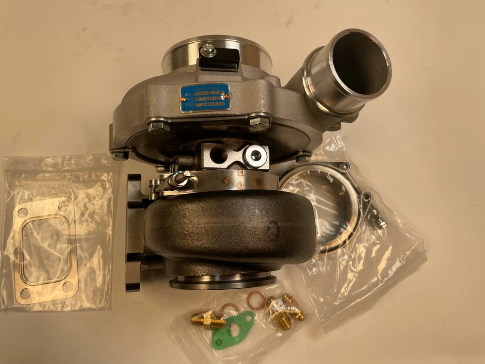 Turbo model for G-Series G35-900 G35-900 A/R.83.T3 horsepower:550-900HP Fit engine displacement 2.0-4.0L 9 blades Point billet compressor wheel bearing type:Ceramic Dual ball bearing cooled type:water and oil cooled oil restrictor & water fittings included Includes Oil Feed (1mm) Restrictor Fitting to -4AN Includes two Coolant Fittings to -6AN Includes Turbine Housing Outlet V-Band Clamps Compressor details a/r 0.72 anti-surge air inlet 4" air outlet 2.0" inducer 61.75mm exducer 76.60mm Compressor Trim: 65 Turbine details a/r .83 Turbine Housing Inlet: T3 flange Turbine Housing Outlet: 3.55 inch (90mm)O.D. w/81mm centering ring V-Band inducer 68.00mm exducer 62.30mm Turbine Trim: 84 ****************Very Important Points******************* 1.Please make sure to open the box immediately when taking delivery, to avoid any potential issues Do NOT sign for any damaged package and report it to the couriers immediately, let the couriers sign for damage, then Contact us please! We will work with the couriers to solve shipping issues. 2.we can accepet customized order!more products you order, the price will be nice.