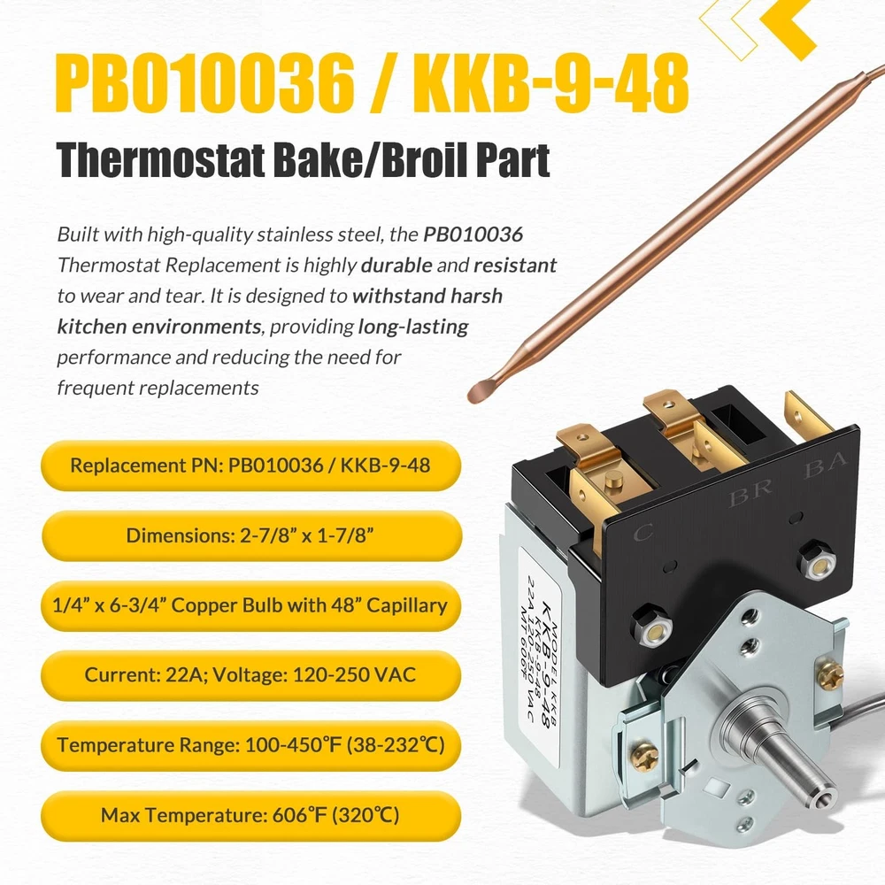 for Viking Range/Stove/Oven Bake/Broil Thermostat PB010036 Wide Compatibility: The PB010036 Bake/Broil Thermostat is used in a wide range of Viking Models — EVGIC365; EVGIC485; SVGIC305DSI; VGIC245; VGIC245G; EVGIC305; VGIC245K; VGIC245Q; VGIC305; VGIC305DSI; VGIC307; VGIC307DSI; VGIC365; VGIC367; VGIC485; VGIC487; VGIS300; VGIS360; VGIS480; VGRC365; VGRC485; VGRC605 (All VGR/VCM/VRT Units); VGSC300; VGSC305; VGSO165; VGSS300; VGSS360; VGSS480. Used on any non DSI ignition system. It is also fit for Awoco and other Range Stove Ovens, ensuring universal Product Specification: Replacement Part Number: PB010036 / KKB-9-48; Dimensions: 2-7/8” x 1-7/8”; Current: 22A; Voltage: 120-250 VAC; Temperature Range: 100-450℉ (38-232℃); Max Temperature: 606℉ (320℃); 1/4" x 6-3/4" copper bulb with 48" capillary. Please notice that don't bend too much or cut the capillary off the probe bulb, liquid or oil is inside Precise Temperature Control for Baking and Broiling: This thermostat offers precise control of oven temperatures up to 606℉ (320℃), ensuring consistent heat for both baking and broiling operations. It allows you to cook with accuracy, achieving perfect results every time, whether you’re baking delicate pastries or broiling meats Durable Stainless Steel Construction: Built with high-quality stainless steel, the PB010036 Thermostat Replacement is highly durable and resistant to wear and tear. It is designed to withstand harsh kitchen environments, providing long-lasting performance and reducing the need for frequent replacements Efficient Performance and Energy Saving: The KKB-9-48 PB010036 thermostat is engineered for efficient performance, helping your oven maintain the desired temperature with minimal energy consumption. This not only improves cooking efficiency but also reduces energy costs, making it an economical option for your kitchen Easy Installation for Quick Replacement: The KKB-9-48 PB010036 thermostat is designed for simple and quick installation. With its universal fit, it allows users to easily replace the old thermostat without needing too much professional help, saving time and effort Satisfaction Guarantee: If you're not satisfied with the tool, simply return it for a full refund in 60 days.If you have any questions, please feel free to contact us and we will reply you as soon as we can. RK-17MH Wall Hydrant Metal Handle Repair Kit Fits For Woodford Model 17 Faucets- 22.60 USD Free shipping For Briggs and Stratton Craftsman Pressure Washer Pump Valve Check Kit 190591GS 23.69 USD Free shipping For Mercruiser Gimbal Bearing Oil Seal Alpha One Gen 1,2/R/MR Housing #26-88416 9.60 USD Free shipping 621957 Burner Orifice Assembly Parts For Norcold N6 N8 Series RV Refrigerators- 19.76 USD Free shipping 23300 Small Engine Valve Spring Compressor Tool Fit 3/4" to 1-1/16" Valve Spring 30.80 USD Free shipping Z-LKR-OEM Locker Sensor Bypass Harness Fit Jeep Wrangler JL Gladiator JT Rubicon 89.59 USD Free shipping Aluminum Fish Finder Gimbal Mount with 1.5" / C Size Ball for Garmin / Lowrance 41.57 USD Free shipping Serpentine Belt Wrench Removal Installer Tool For Honda Acura Accord CR-V Civic- 41.50 USD Free shipping Water Pump Impeller Kit For Chrysler Force FK1069 75 85 90 100 105 115 125 140hp 33.01 USD Free shipping Transmission Shifter Seal Remover & Installer Tools Set with Seal For GM 4L60E 19.55 USD Free shipping Rear Wheel Axle Bearing Kit for Honda 2014-21 TRX420 SRA Rancher TRX500 Foreman 55.57 USD Free shipping High Pressure Oil Pump HPOP Master Service Kit for 94-03 Ford 7.3L Powerstroke 46.42 USD Free shipping Extended Run Fuel Gas Cap for Honda / Champion / Westinghouse Generator 16.80 USD Free shipping Washer Dryer Noise Anti Vibration Pads Washing Machine Reduction-4PCS 14.40 USD Free shipping 8PCS Door Hinge Nuts for Jeep 2007-2021 Wrangler JK JKU JL JLU Sports 2/4 -Door 20.59 USD Free shipping 64mm 14 Flutes Oil Filter Cap Wrench Removal Tool For Toyota, Lexus 2.5L-5.7L 6.99 USD Free shipping Oil Filter Cap Wrench Cup Socket Remover Tool For Toyota Lexus 64MM 14 Flutes/ 6.99 USD Free shipping For Pertronix 1181 Ignitor Electronic Ignition Conversion Kit Delco 8 Cylinder 44.91 USD Free shipping T-Handle Gear Shifter Knob for Jeep Dodge Challenger Compass Jeep Wrangler JK 24.70 USD Free shipping High Pressure Oil Rail O-Rings Kit Injector Seal&Nipple Cup Socket for Ford 6.0L 71.30 USD Free shipping Generator Cover Storage Pocket Waterproof for Honda EU2200i EU2000i Companion 19.80 USD Free shipping For WFCO WF-8955-AD-MBA Converter Lower Main Board Assembly 55A, 105-130VAC 950W 144.76 USD Free shipping for 010-11442-00 Garmin NMEA 2000 Starter Kit with Cable Terminator T-Connectors 82.69 USD Free shipping 4.5" Cable Boot for T-H Marine CB-4-DP Boat Motorwell Transom Steering Wire Boot 13.60 USD Free shipping 780044-1 UC H7 R2 Helix 7 Unit Cover Silicone for Humminbird Helix with 7 Series 33.13 USD Free shipping 740146-1 Gimbal Mounting Bracket Kit For Humminbird Helix-7 Series Fish Finders 29.80 USD Free shipping Universal A/C Hose & Fitting Kit 42810100 for Custom Air Conditioning Lines 122.99 USD Free shipping for Gallon Bottles Wide-Mouth Quart Bottl Hand Oil Transfer Pump Fluid Pump 30cc 17.59 USD Free shipping 14048000 1" Universal Extension Kit for Grohe Rapido SmartBox Rough-In Trim 25MM 51.91 USD Free shipping for Zodiac Jandy R0445400 Diffuser Kit ePump PlusHP WaterFall JEP SHPF PHPF MHPM 59.50 USD Free shipping 2 Pack Boat Truck Cargo Trailer RV Door Grab Handle Assist Bar Camper Gate Metal 30.09 USD Free shipping 010-11425-01 Threaded Transducer Power Cable for Garmin GLS 10 Sonar Module- 36.91 USD Free shipping 73995 Hot Tub Pressure Switch for Watkins Caldera,Hot Spot, Solona Hot Tub 2006+ 46.78 USD Free shipping for Watts 1/4"-1/2" 009 Total Relief Valve Repair Kit Assembly 0887298 RK 009 82.19 USD Free shipping Springs Kit &Parking Brake Pad Shims for Polaris Ranger 500 700 800 900 2203148 37.26 USD Free shipping Fryer Thermostat Pitco 