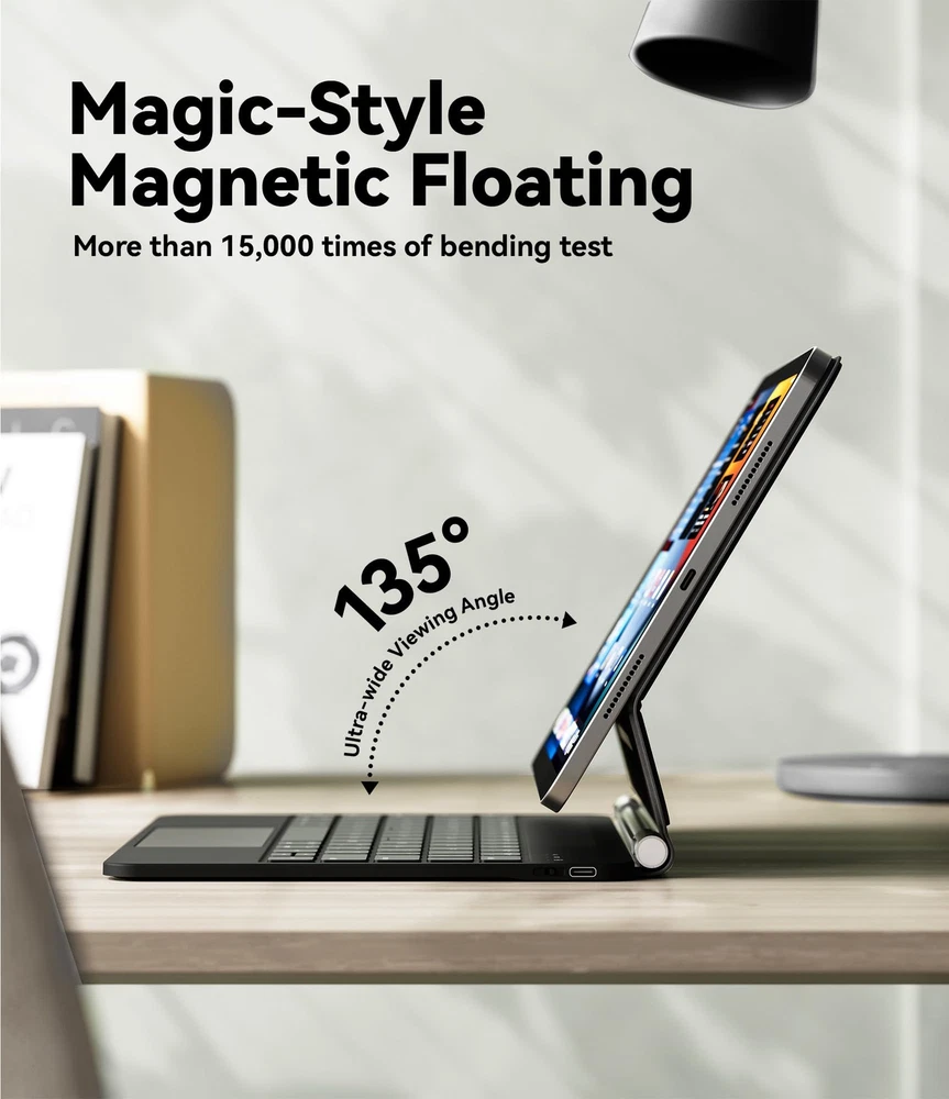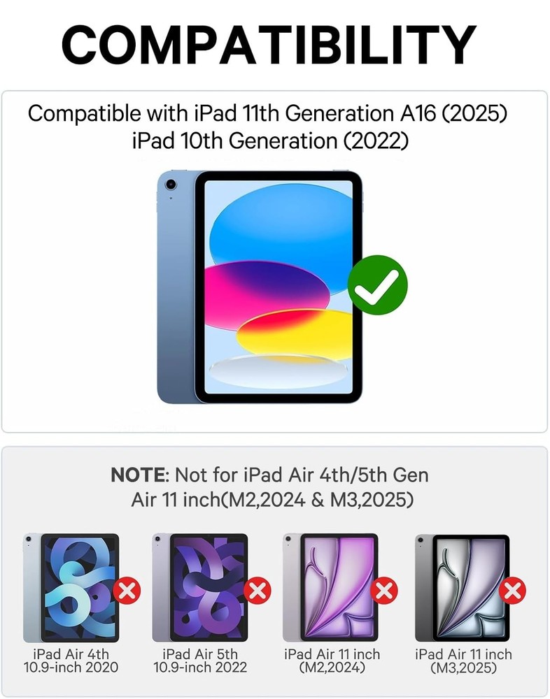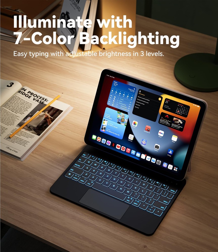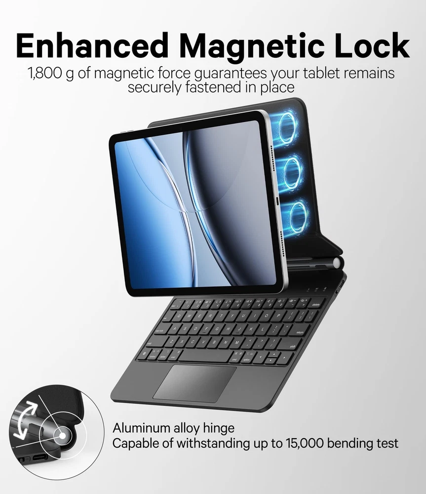 The Magnetic Floating Keyboard for iPad 11th(A16)/10th Generation offers the ultimate in convenience and protection by design. It features a built-in Bluetooth wireless keyboard for effortless text input and a magnetic closure that keeps iPad securely in place. The case also features a 7-color backlit keyboard for low-light use and a touchpad for easy iPad navigation. the case is made from a stain-resistant material that withstands everyday stains and is easy to clean. It also features a built-in -rechargeable battery that provides up to 200 hours of use on a single charge, so you can stay productive wherever you go. Compatibility: Designed for iPad 11th Generation(A16)2025 & iPad 10th Generation 2022 (Model: A2696/A2777/A2757). Not with 10.9-inch iPad 5th and 4th Generation. Please check your iPad model number on the back to ensure a perfect fit before purchasing. Quick-Set Magnetic Stand: Featuring a strong magnetic matrix of 31 magnets that provide up to 2600GS of holding power, the Quick-Set Magnetic Stand seamlessly integrates with your iPad A16 11th gen, allowing you to easily open the floating cantilever stand and adjust it to the perfect angle for typing or browsing. Stain Resistant Surface: SemiSi-tech technology is fused with PU leather to make it easy to wipe away surface stains. Experience a soft, sweat-resistant touch with a plush lining and no need to worry about scratching your iPad 10th generation. Bluetooth 5.2 Connectivity: Low-power Bluetooth stability is provided by the Bluetooth 5.2 chip. Simply pair your iPad A16 with the keyboard and enjoy the convenience of automatic reconnection in everyday use! Scissor-Switches: Each key springs back quickly, and with a comfortable 1-millimeter key travel, you can unleash the iPad 10th Generation typing experience for effortless productivity. Vibrant Backlight Customization: Infuse your workspace with personality the backlight selection. Unleash your creativity by choosing from 7 vivid colors across 3 brightness levels, empowering you to tailor the perfect ambiance for your typing experience case with keyboard for iPad 11th Generation. Elevate your keyboard aesthetics and create an atmosphere that complements your unique style, making every typing session a visually delightful experience. Intuitive Touchpad: Navigate effortlessly with our intuitive touchpad, supporting multi-touch gestures. Swipe to return to the main screen or switch between spaces, unlocking a new realm of control gestures for a seamless and efficient user experience. Power Management: The keyboard for iPad A16(2025) has a -touch wake-up function, charges via USB-, and utilizes battery management and sleep mode to ensure efficient power usage.