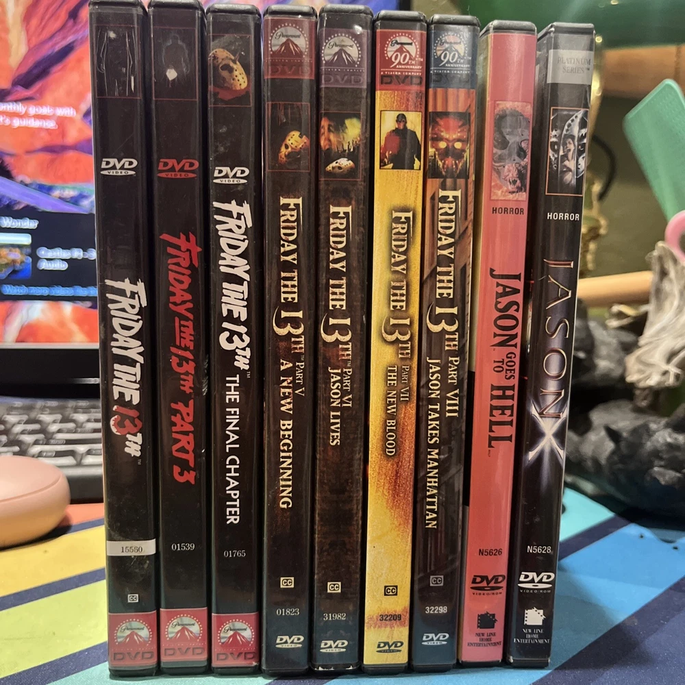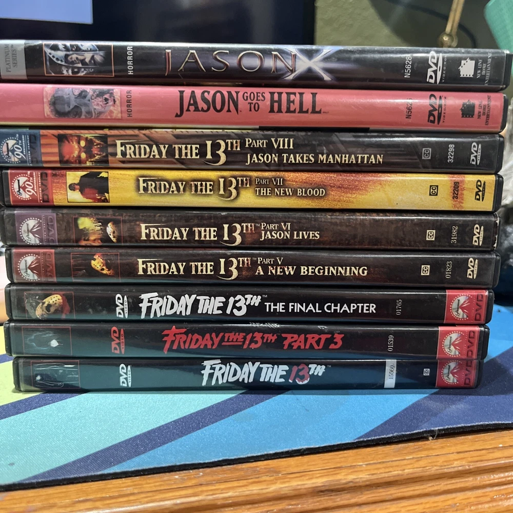 This Friday the 13th DVD lot is a must-have for any horror movie fan. Get ready to scream as you watch the iconic slasher film on DVD. With a storyline that follows a group of friends who stay at a summer camp on Friday the 13th and get killed one by one by a masked killer, this movie is a classic that will keep you on the edge of your seat. The lot includes multiple DVDs, so you can watch the movie over and over again. Add this to your horror movie collection today and experience the terror of Friday the 13th. This set includes Friday the 13th part one Friday the 13th part three Friday the 13th the final chapter Friday the 13th a new beginning Friday the 13th Jason lives Friday the 13th the new blood Friday the 13th. Jason takes Manhattan. Jason goes to hell Jason X.