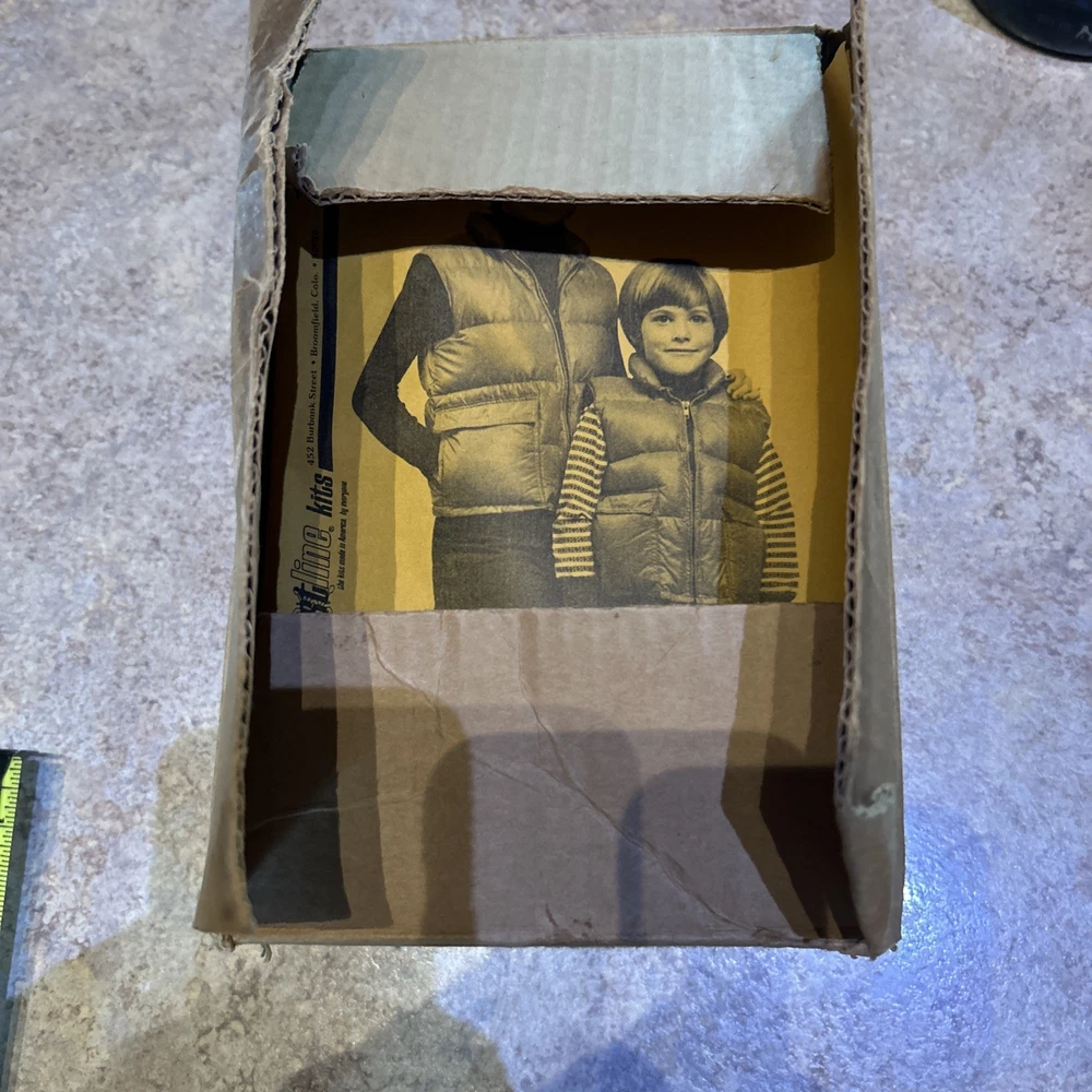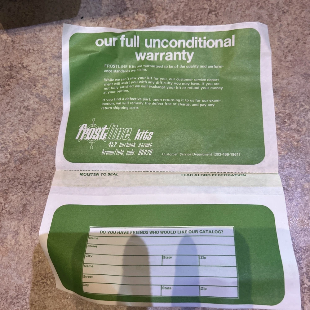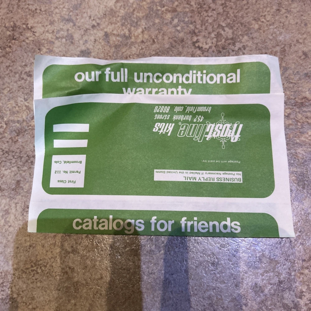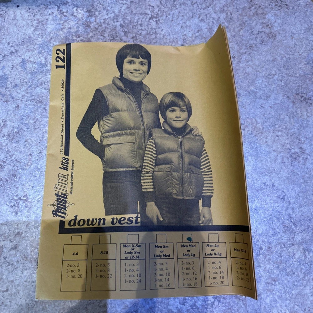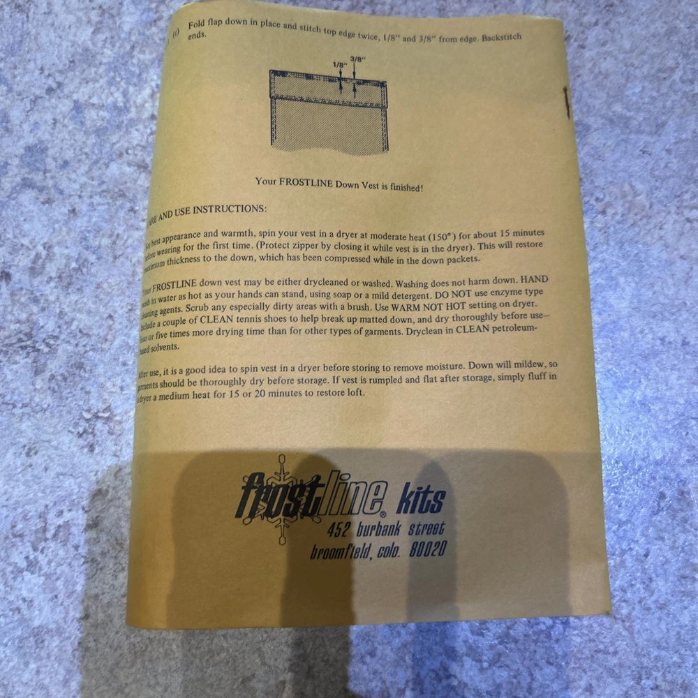 🧵 Vintage Frostline Kits Down Vest DIY Sewing Kit – Complete w/ Fabric, Goose Down & Original Box Description: Step back into outdoor history with this vintage Frostline Kits Down Vest sewing kit, made in Broomfield, Colorado, USA. Frostline was the pioneer of do-it-yourself outdoor gear in the 1960s–80s, letting customers sew their own high-quality down jackets, sleeping bags, and vests. This kit is complete and unused, including: • ✅ Pre-packaged goose down packets (still sealed) • ✅ Bright yellow ripstop nylon fabric • ✅ Full instruction booklet & pattern • ✅ Zipper, notions, labels (including Frostline logo patch) • ✅ Original shipping box with Frostline logo and classic slogan: “the kits made in America. by everyone.” A rare survivor in fantastic condition — perfect for collectors, retro sewing enthusiasts, or anyone who wants to make their own true vintage down vest. Size/Pattern: Unisex vest ⸻ Condition: • Unused kit, all components included. • Original down packets intact. • Instructions and pattern clear and complete. • Box shows light age/storage wear.