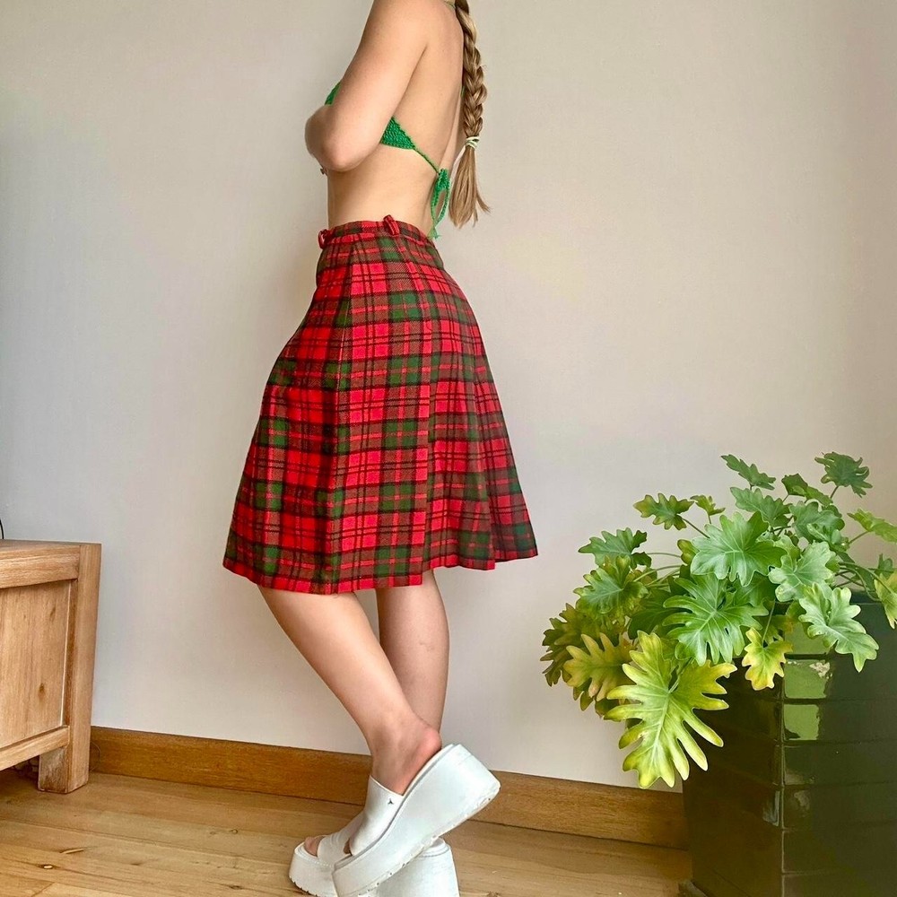 vintage red tartan gingham wool pleated midi skirt brand: glenleigh tartan by warrnambool no size but would fit sizes 6-8 flatlay measurement (cm) waist: 33 length: 62 one small hole shown in last image pure wool material instant buys are welcome international shipping available eco friendly packaging item modelled on a size 8 who is 159cm tall unpinned 1 .