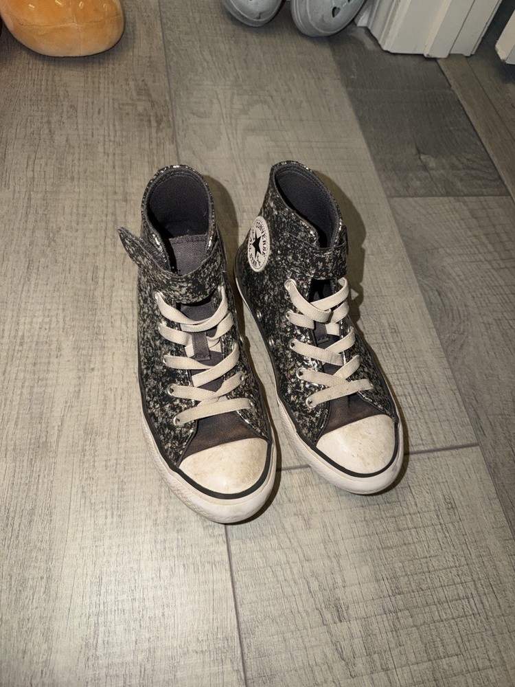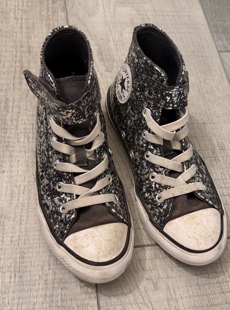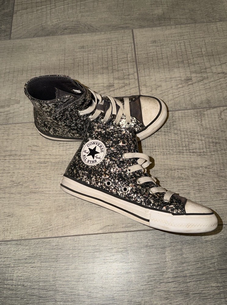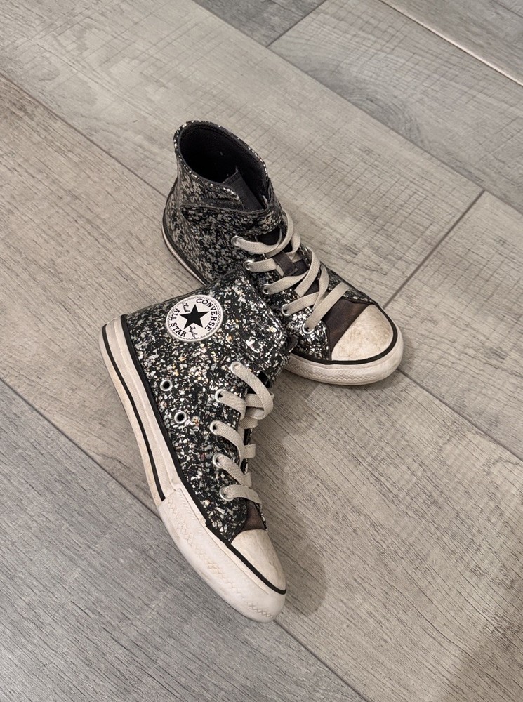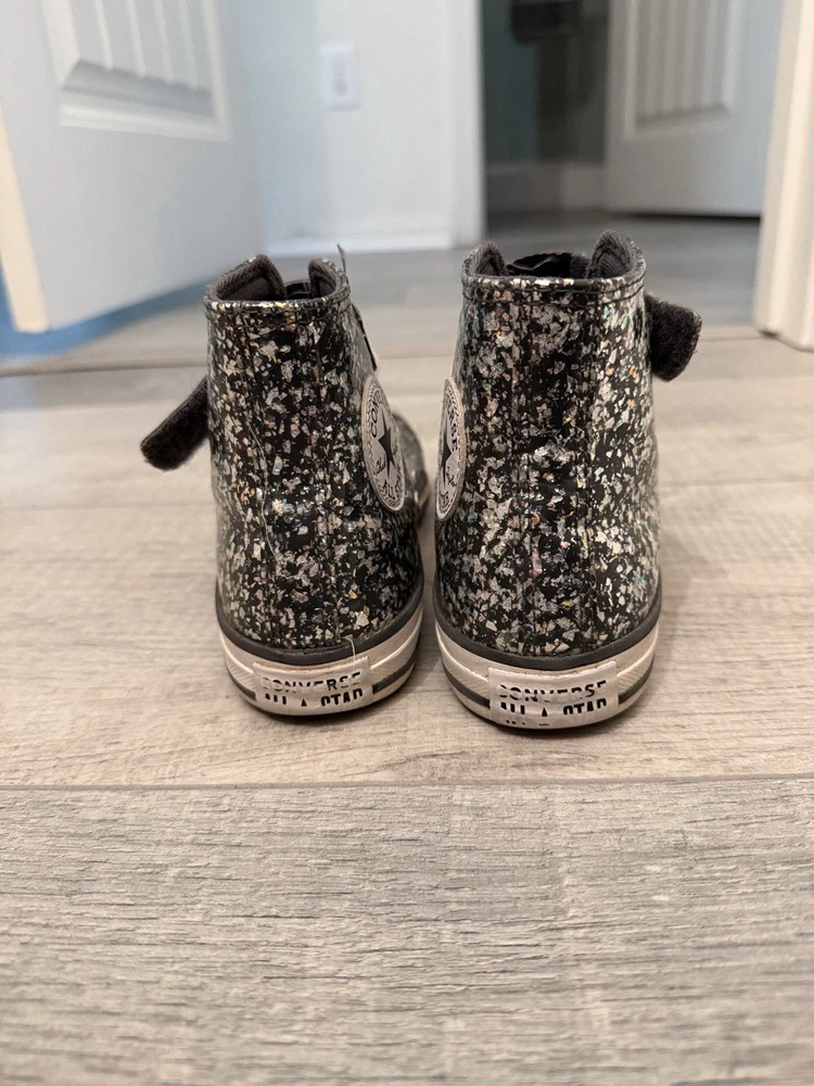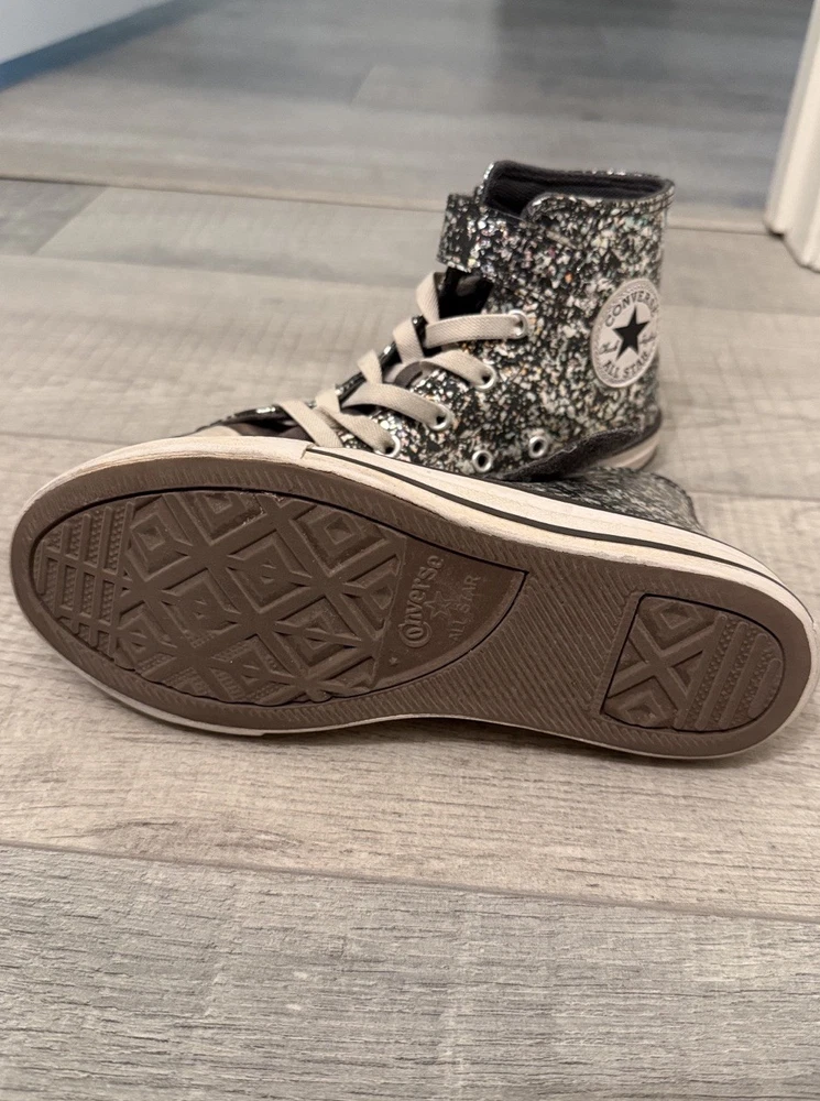 The glitter Converse All Star high top kids sneaker is a stylish and fun option for young girls. With a high top design, sneaker style, and star theme, these shoes offer both comfort and flair. The free shipping makes them even more appealing for parents looking to add a touch of sparkle to their child's wardrobe. Perfect for casual wear with a wipe down these sneakers are sure to be a hit with any young fashionista.