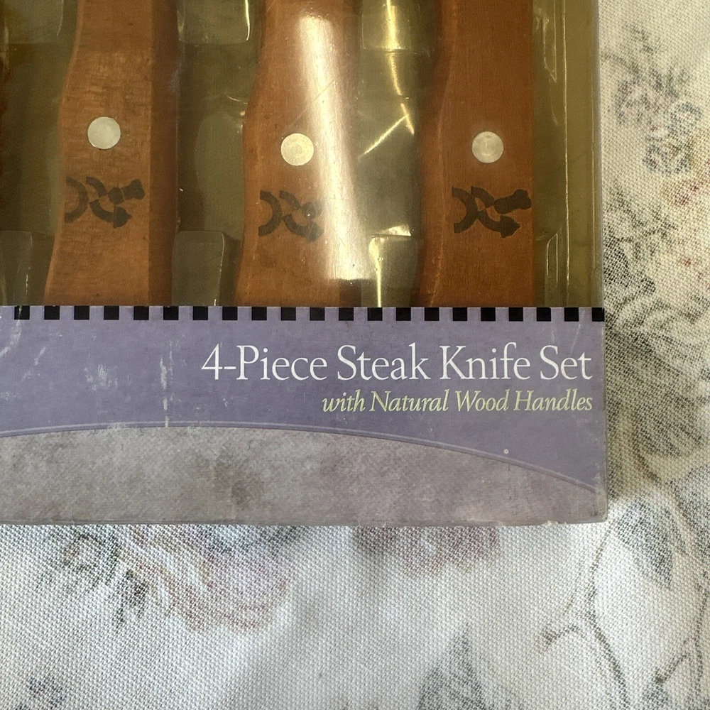 This 4 piece knife set is perfect for any meat lover. The set includes a steak knife, all crafted with a serrated blade edge for efficient cutting through any meat. The handles are made of a combination of wood and stainless steel, ensuring a sturdy and comfortable grip. The set is ideal for home or professional use, and is compatible with any type of meat. Add this Gourmet knife set to your collection today!
