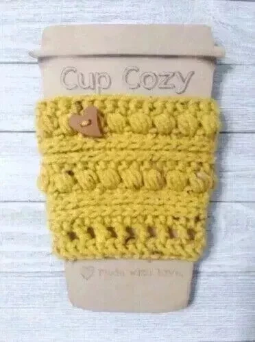 handmade crochet coffee cup cozy drink sleeve heart button mustard yellow