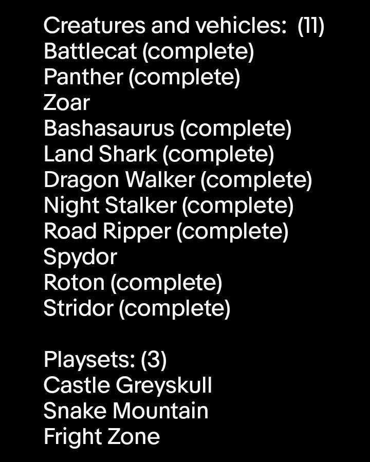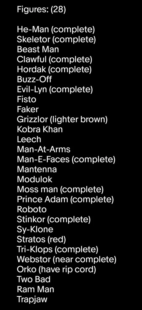 This is a massive lot of vintage He-man figures, creatures, vehicles, and playsets. I do not want to separate. Many things are complete or near complete. Those things are marked as such. Figures are in good condition from a smoke-free home. L ist of everything that is included in pictures, and to my best knowledge is accurate. Please ask any questions, I can provide additional pictures upon request. With the size of the lot I will probably have to ship in multiple boxes, my primary goal to to package them safley to preserve the condition of the toys.