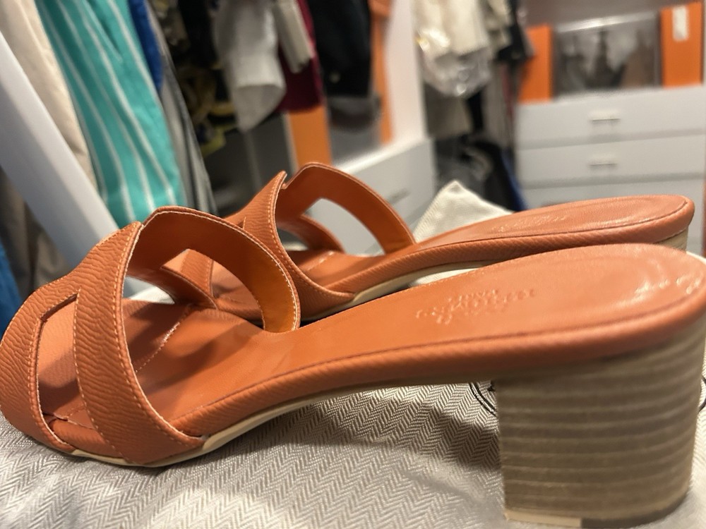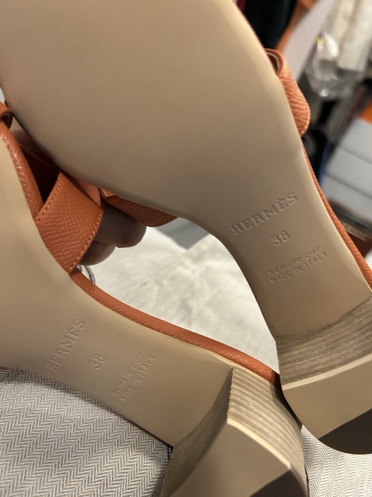 Purchased overseas by a relative, too small, these fit size 7 or 7.50, even though it says size 38. I am selling 2 pairs of sandals. One in orange and one pair in blue. The product is a pair of new Hermes sandals in blue, size 38 (US 7.5). They are slip-on sandals with a low heel and H cut-out style, featuring the brand's logo accents. Made of leather with a comfortable insole and outsole, these sandals are perfect for casual occasions in the summer and spring seasons. The design of the sandals is a cultural homage, adding a touch of quiet luxury to the wearer's ensemble.