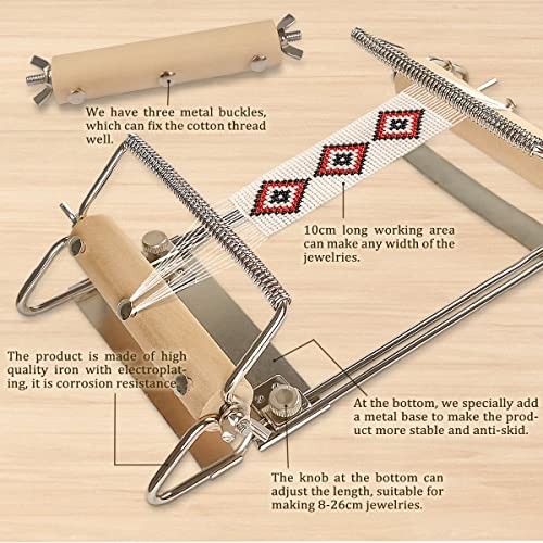 About This Item METAL BEAD LOOM KIT: 1Metal Bead Loom,1Needle Threader,1Cotton Thread,2Needles,1Bead Funnel Tray,1 bagSeed Beads,1Yarn Scissors,1Instruction Manual,2Lobster Clasps,10Open Jump Rings,4Clasp Tubes. SIZE: Metal Bead Loom,L 9.45-16.73 inches,(24-42.5 cm) W 4.17 inches(10.6 cm);Needle Threader 1.7 inches(4.4cm);Cotton Thread length 30 meters;Bead Funnel Tray 3.7L2.2W inches(9.55.5cm);Seed Beads,20g;Yarn Scissors 4.7L0.8W inches(122cm).Open Jump Rings,0.4/0.6mm. THE HOBBYWORKER METAL BEAD LOOM: This new beading loom, unlike the previous one, has a removable and retractable design at the bottom; you can adjust the beading length according to your own preferences. Made of iron plating, it can be reused for a long time, rust-proof and corrosion-resistant. The whole beading loom is light and delicate, portable, easy to operate and use, which is very suitable for novice and adult to make jewelry. BEAD TRAY: The pink bead funnel tray is made of plastic, the size is right, the surface is smooth, convenient, quick and practical; There is an opening with a lid on the front, and the lid is opened after pouring the beads in so that the beads don't get poured all over the place. Please close the lid when not in use to prevent loss. BEADING THREAD: This kit comes with a cotton thread bobbin with a length of 30 meters and a roll of 0.15mm beading thread, a must for jewelry kits. The beading thread is strong and durable, will not break, and provides enough material for jewelry making. BEADING NEEDLE: Two short needles for quick and easy threading, saving time, a needle threader for threading, simple and fast.The needles are all stainless steel, rust-proof and durable. YARN SCISSORS: Red, Blue, Purple,Pink,Grey ( Random Colour ).Material: Plastic + Steel. With cover to prevent scratches, light weight, high quality portable; ideal for cutting line, fishing line, fabric, Paper, etc., are widely used.