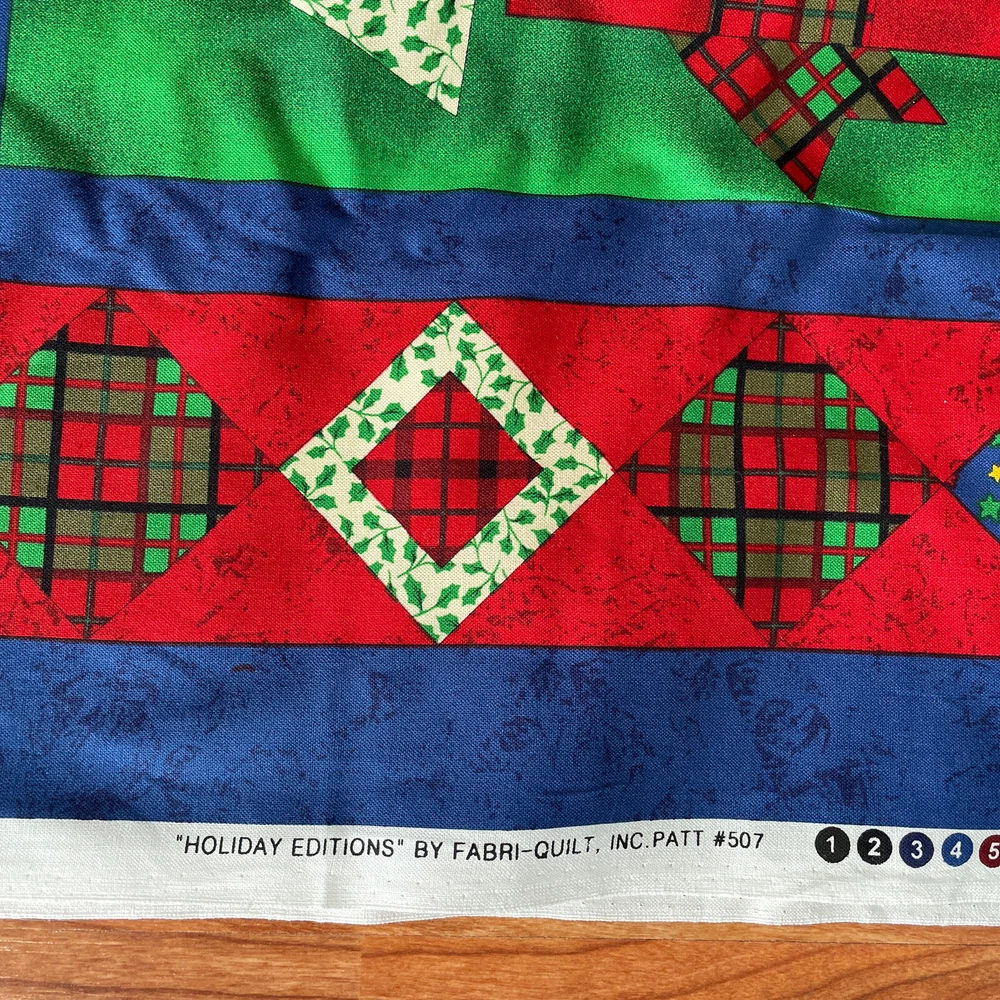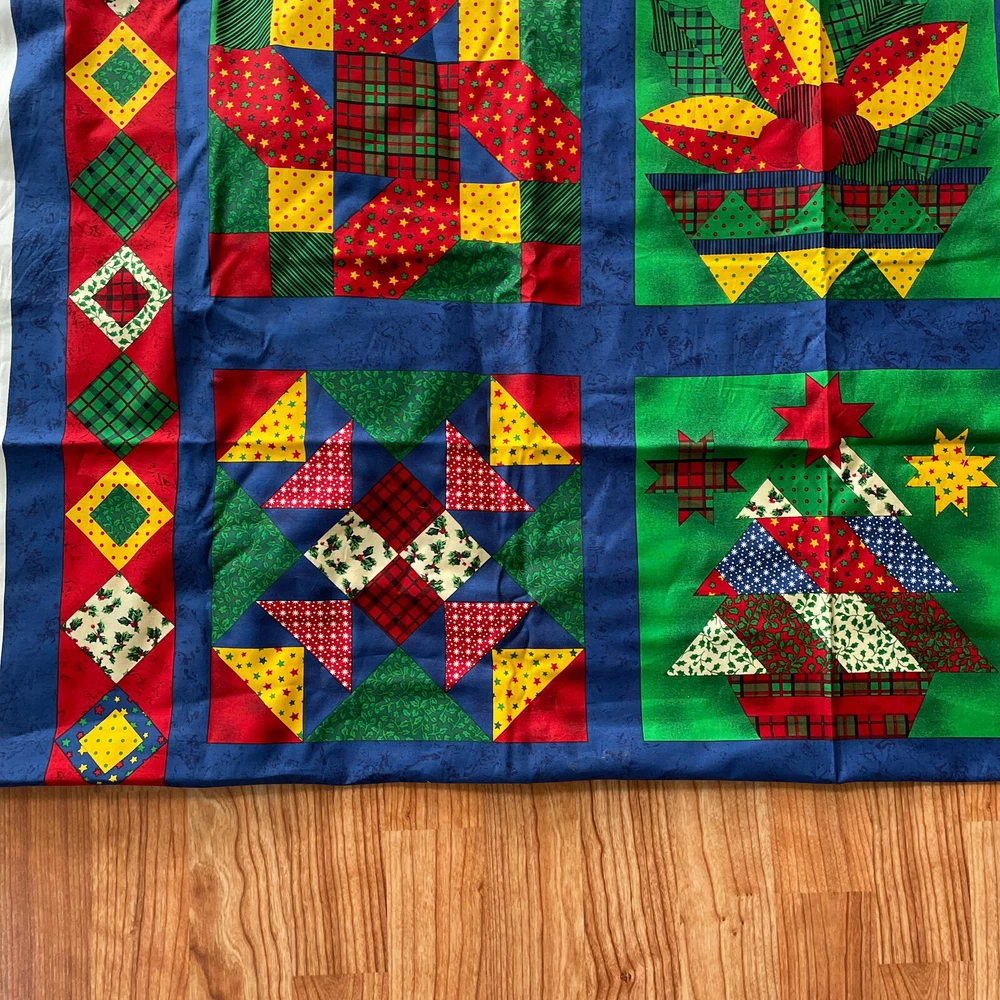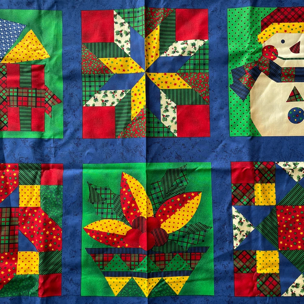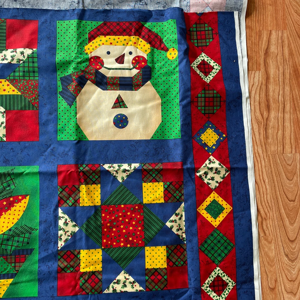 holiday editions Christmas Bright Snowman Present Tree Cheater Panel fabri quilt. Comes as shown. Each block measures about 10”x10”. Entire fabric measures about 35” long and 44” wide