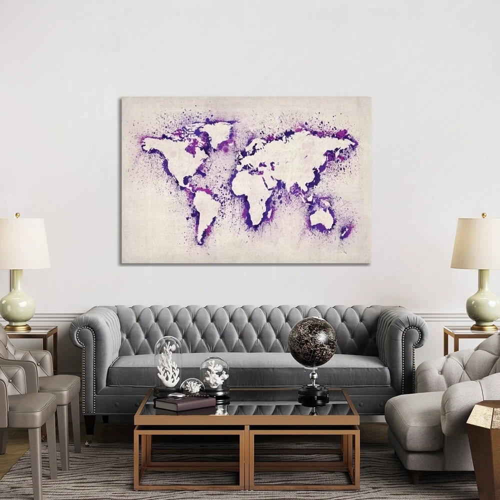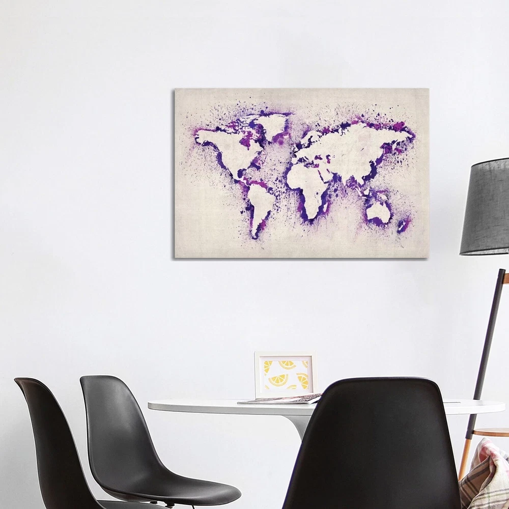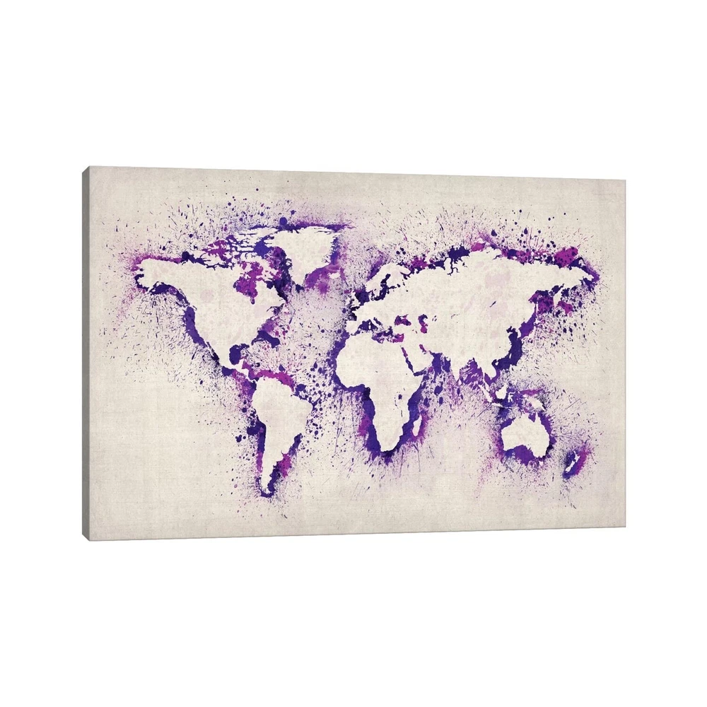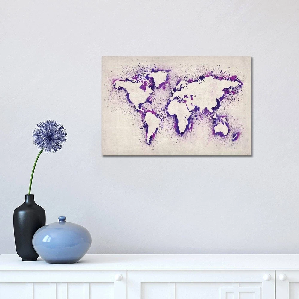 The artwork is crafted with 100-percent cotton artist-grade canvas, professionally hand-stretched and stapled over pine-wood bars in gallery wrap style - a method utilized by artists to present artwork in galleries. Fade-resistant archival inks guarantee perfect color reproduction that remains vibrant for decades even when exposed to strong light. Add brilliance in color and exceptional detail to your space with the contemporary and uncompromising style of iCanvasART. Artist:N/ATitle:Map Of The World (Purple) Paint Splashes by Michael Thompsett Canvas Print Wall ArtProduct Type: Gallery wrapped canvas artOuter dimensions:Small: 18X12x.75Medium: 26X18x.75Large: 40X26x.75NEW: Ready to be displayed right out of the box, including free Hanging Accessories and instructions for a quick & easy Free Shipping Over $49.99* Details iCanvas "Map of The World (Purple) Paint Splashes" by Michael Tompsett Canvas Product Description: The artwork is crafted with 100-percent cotton artist-grade canvas, professionally hand-stretched and stapled over pine-wood bars in gallery wrap style - a method utilized by artists to present artwork in galleries. Fade-resistant archival inks guarantee perfect color reproduction that remains vibrant for decades even when exposed to strong light. Add brilliance in color and exceptional detail to your space with the contemporary and uncompromising style of iCanvasART. Artist:N/A Title:Map Of The World (Purple) Paint Splashes by Michael Thompsett Canvas Print Wall Art Product TypeGallery wrapped canvas art Outer dimensions:Small18X12x.75Medium26X18x.75Large40X26x.75 NEWReady to be displayed right out of the box, including free Hanging Accessories and instructions for a quick & easy hanging process that achieves the best positioning results. Quality Wood BarsShrink-resistant wooden-bar frame with tensioning wedges that allow for tightening of the canvas from the reverse side. Dependent and FastProduced by the largest US canvas art supplier.