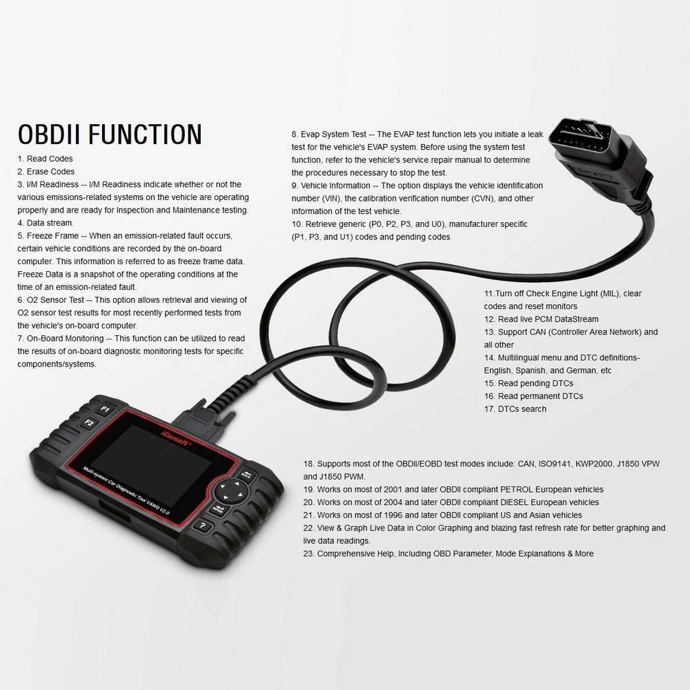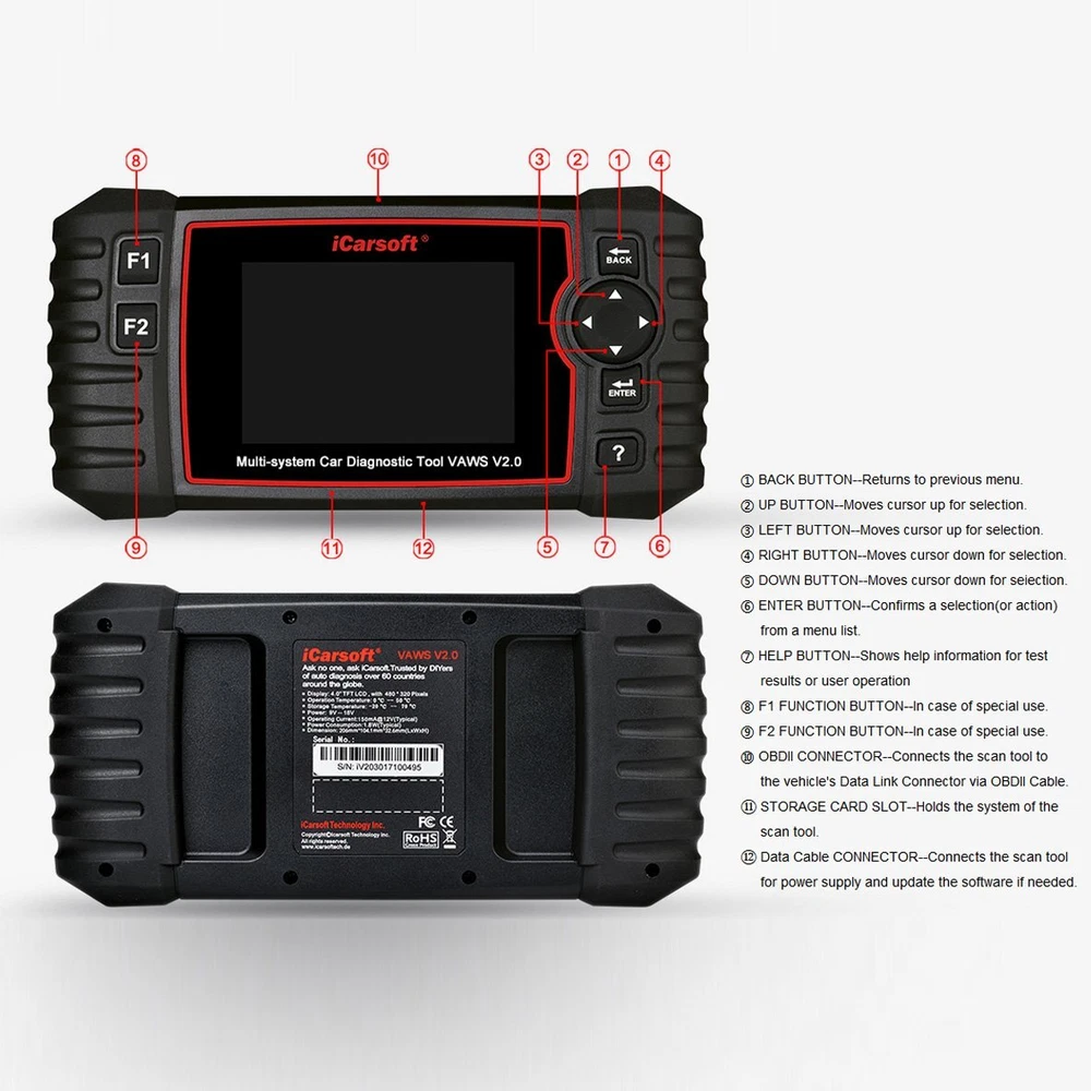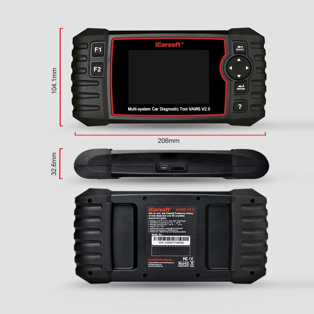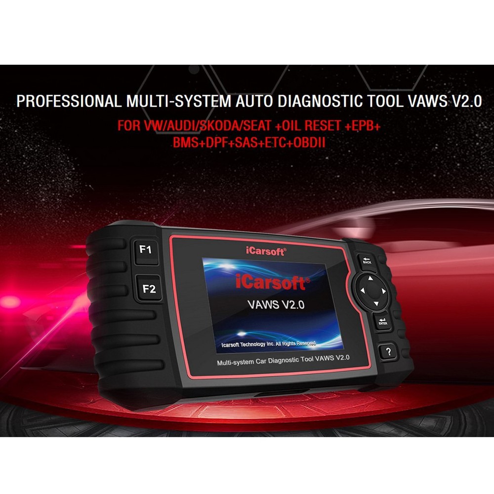 iCarsoft Professional Multi-System Auto Diagnostic Tool VAWS V2.0 for iCarsoft VAWS V2.0 is a Professional and powerful vehicle fault diagnosis tool developed by iCarsoft Technology Inc. With a 4.0À TFT LCD and unique diagnostic software, it features full ECU diagnosis of single vehicle brand and test modes mainly include: CANBUS, ISO9141, KWP2000, and J1850etc.Itenables technicians to accurately diagnose complex problems. Product Features: 1. iCarsoft VAWS V2.0 can do it all-reads and clears trouble codes on most of the systems such as engine, transmission, ABS and airbag etc. 2. Applies to the single Brand of most models of VAWS which equipped with OBDII-16 DLC 3. Support OBDII/EOBD Ten Modes of Operation 4. Full System Diagnosis 5. Read &Clear DTC 6. Read Live Data 7. Support Data Review 8. Support special functions: Oil reset, EPB, DPF, SAS, ETCs, BMS reset, Injector Coding 9. The Print Data function allows you printing out diagnostic data recorded by the scan tool or customized test reports. 10. Battery voltage test allows you getting the voltage of battery with OBD port by the scan tool when the engine starts. 11. DTC Library to lookup when user is operating this tool. 12. Easy To Use With Silicone Keys 13. Full Speed Upgrade Via USB2.0 14. 4.0ÀTFT LCD, 480*320 Pixels 15. Multi-language: English, German, Dutch, Spanish, French. SPCIFICATIONS: Display: 4.0ÀTFT LCD, 480*320 Pixels Operation Temperature: 0C ~ 50C Storage Temperature: -20C ~ 70C Operating Voltage: 9 ~ 18V Operating Current: 150mA@12V(Typical) Power Consumption: 1.8W(Typical) Dimension: 206*104.1*32.6 mm (L x W x H) CONTENTS: VAWS V2.0 Main Unit Main Cable USB Cable TF Card User Manual Nylon carry case Product Details Brand iCarsoft Technology Inc. Product Type Automative Tools Mpn 4 VAWS V2.0 can do it all-reads and clears trouble codes on all the systems such as engine, transmission, ABS and SRS etc. Support OBD II/EOBD ten modes of operation full ecu diagnosis Oil light/service reset, EPB reset, Steering Angle Sensor (SAS) Calibration, Diesel Particulate Filter (DPF) Regeneration Control System, Electronic Throttle Control system (ETC) reset, Battery Management System (BMS) reset Support data review and print, support battery voltage test OBD II function for all OBD II/EOBD compliant vehicles: I/M Readiness, Data Stream, Freeze Frame, O2 Sensor Test, Turn off Check Engine Light (MIL)... Lifetime free update Full Speed upgrade via PC one year warranty Support Multi-language NEW FUNCTIONS: Injector coding (some vehicle models do not enjoy the two functions) ABS Bleeding, release the air to restore ABS Brake sensitivity, or relearn while ABS replaced. Injector coding, relearn the injector control parameter while the injector renewed or replaced - Powered by