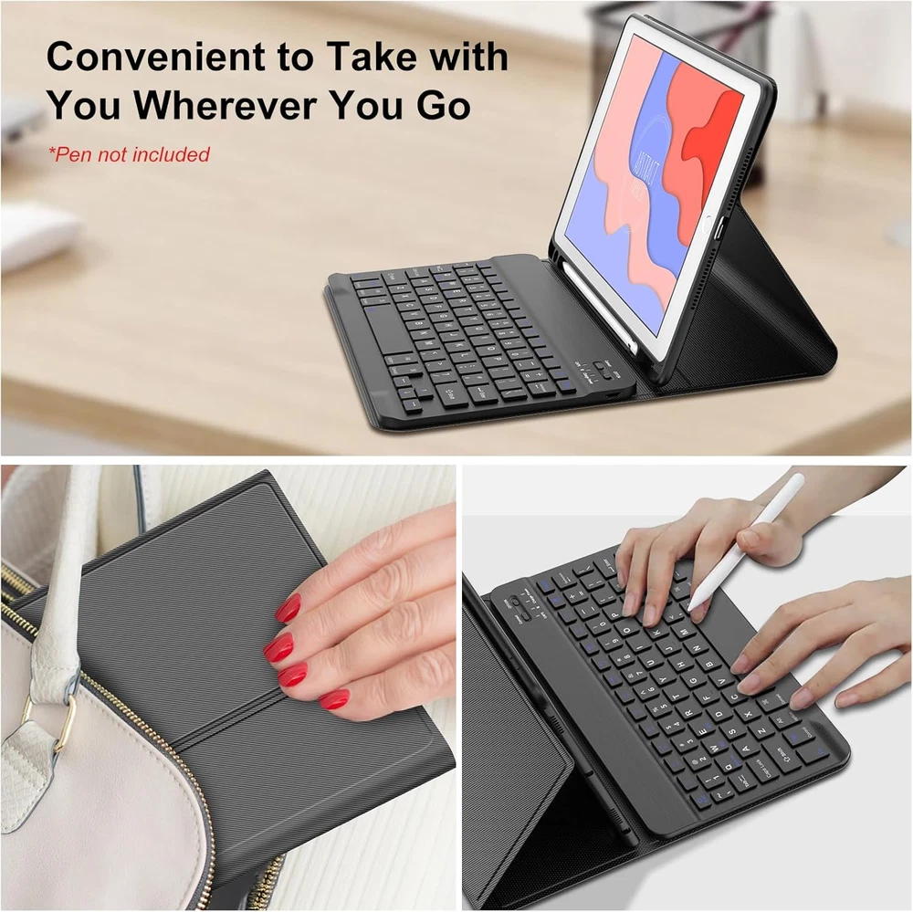 ☎【Compatible Devices】:iPad 9th Generation 2021 (Model: A2602/A2603/A2604/A2605), iPad 8th Generation 2020 (A2430/A2270/A2428/A2429), iPad 7th Generation 2019 (A2197/A2198/A2200), iPad Air 3 10.5 inch 2019 (A2152/A2123/A2153/A2154), iPad Pro 10.5-inch 2017 (A1701/A1709/A1852).Make sure you check the back of iPad to confirm the model.(The package does not contain iPad and iPad pencil). ☎【Multiple Viewing Angles】: The iPad 9th generation case with keyboard features a sleek and elegant design that turns your iPad into a laptop in a second. Three notches on the case support your tablet in landscape mode, creating three different viewing angles. Perfect for working, writing or watching videos. ☎【Detachable Magnetic Keyboard】:The iPad 9th generation keyboard with a magnetic detachable design, the iPad can be attached to the case for a firm hold without fear of falling. Equipped with useful shortcut keys for multimedia and others, 10.2-inch iPad wireless keyboard puts you at your fingertips. ☎【All Round Protection & Pencil Holder】: The iPad 9th generation case is made of high quality vegan outer synthetic leather and soft non-slip lining, providing 360°all-around protection for your tablet on the front and back, preventing from accidental scratches. iPad 9th Generation case comes with a built-in pen holder, which is thoughtfully designed to hold an Apple pen or stylus, preventing it from being lost or getting in the way. ☎【Auto sleep/Wake Function & Precise Cutout】: It automatically wakes up or sleeps when iPad is turned on or off, saving a lot of power for iPad. Precise cutouts are designed to easily connect all ports, camera, speakers, headphone jack and volume control. ☎【Stain Resistant Case】Stain Resistant Case, even accidentally spilled ink, coffee, food stains, etc., can be easily wiped in a short time, to achieve excellent quality of anti-stain, and anti-yellow, so that the cover can keep smooth. ☎【Rechargeable Keyboard with Long Battery Life 】:Using the USB-C charging, it can be charged quickly and can be fully charged in 2.5 hours. It can be used for 70 hours on a single charge, no need to worry about running out of power when traveling, and it is easy to carry. The box contains a Type-C charging cable. ☎【Laptop-Like Typing】Large, well-spaced keyboard containing a full row of shortcut keys lets you type comfortably with speed and accuracy. ☎【Package & Warranty】: 1 x iPad 10.2 9th/8th/7th Gen & iPad Pro 10.5-inch Keyboard Case, 1 x Micro USB Charging Cable, 1 x User Manual. ☎【100% Satisfaction】Once you purchase our 9th gen ipad case with keyboard, we will provide you with a 1-year worry-free warranty and 30-day money back guarantee! If you have any questions about our products. Please contact us, we will reply you within 24 hours and provide you with a satisfactory solution. Customer satisfaction is our top priority! Product Description