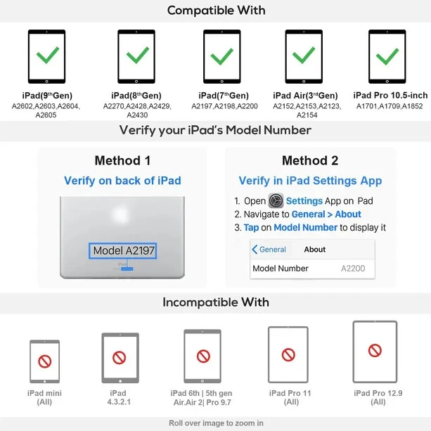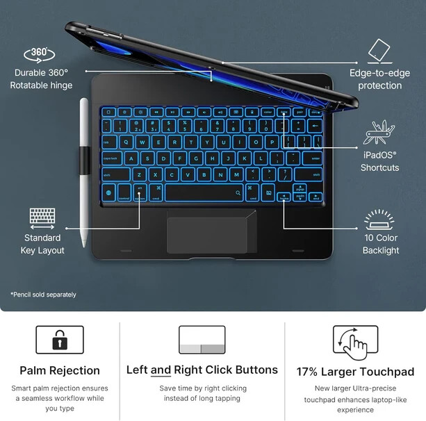 Compatibility - New iPad 9th Gen (2021, 10.2"), iPad 8th Gen (2020, 10.2"), iPad 7th Gen (2019, 10.2"), iPad Air 3rd Gen (2019, 10.5") & iPad Pro (2017, 10.5") including models A1701, A1709, A2123, A2152, A2153, A2154, A2197, A2198, A2199, A2200, A2270, A2428, A2429. Precision Trackpad - Navigate iPad in a whole new way with multi-gesture controls that redefine productivity; edit documents, browse the web and build presentations with unparalleled speed. Illuminated Typing - Type quickly and accurately on a laptop-like keyboard with a full row of iPadOS shortcuts and laser-etched keys that allow an adjustable 10-color RGB LED backlight to shine through. 7 Use Modes - A patented 360° hinge (20,000-cycle stress tested) lets you comfortably use iPad for any task from typing notes to watching videos to using iPad in its native form in tablet mode. Smart Features - Premium hard-shell design protects all sides of your iPad; auto sleep/wake initiates when keyboard case is opened & closed to conserve battery life; holder for Apple Pencil so it won't get lost or in the way.