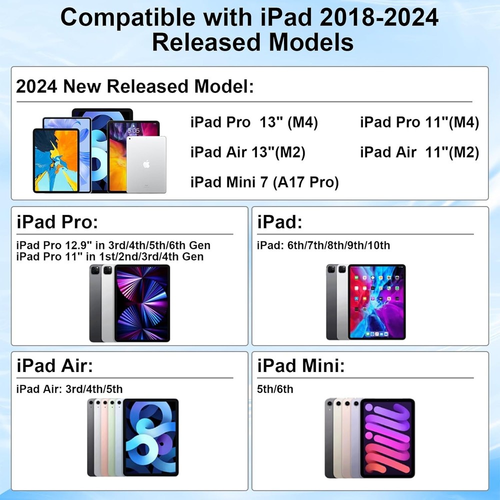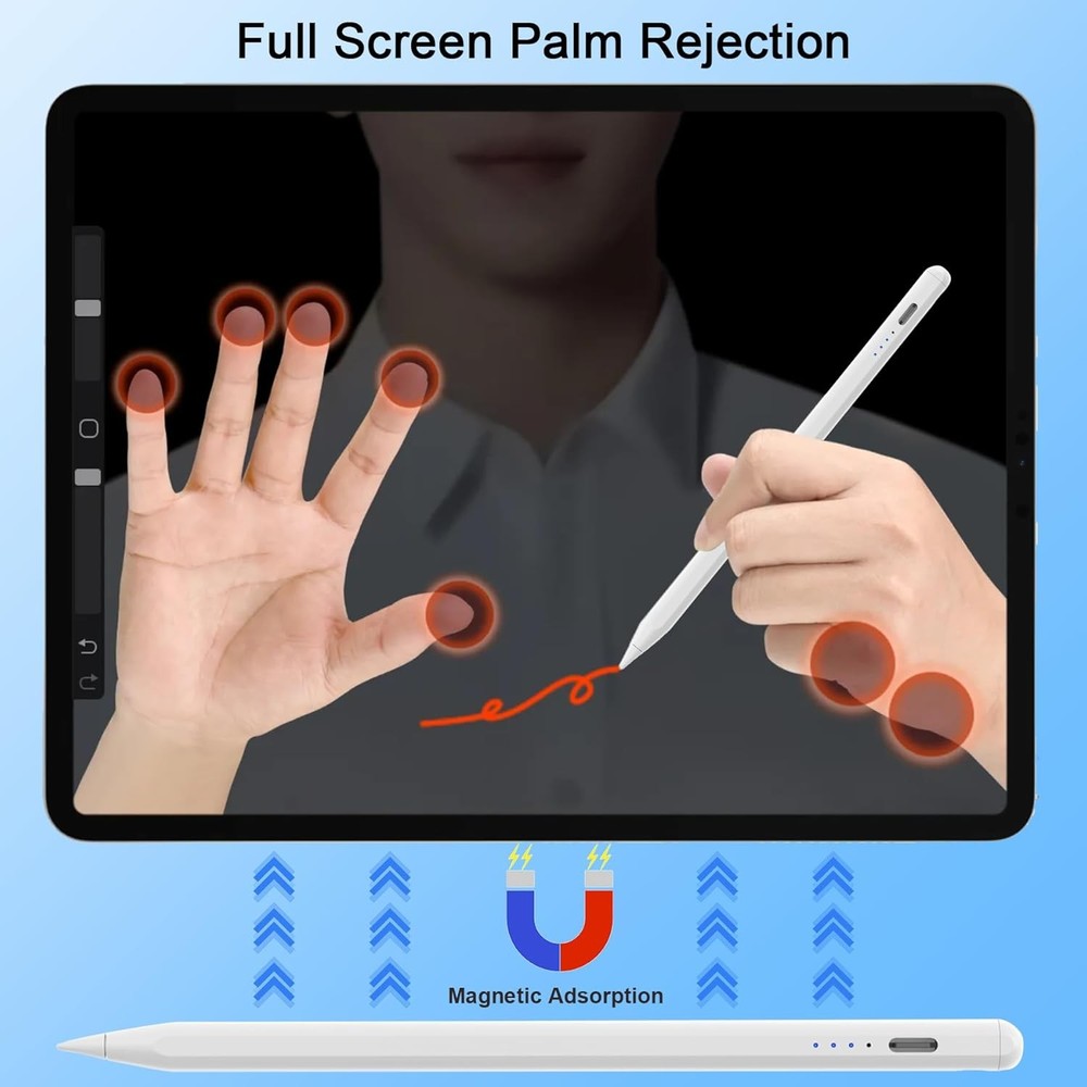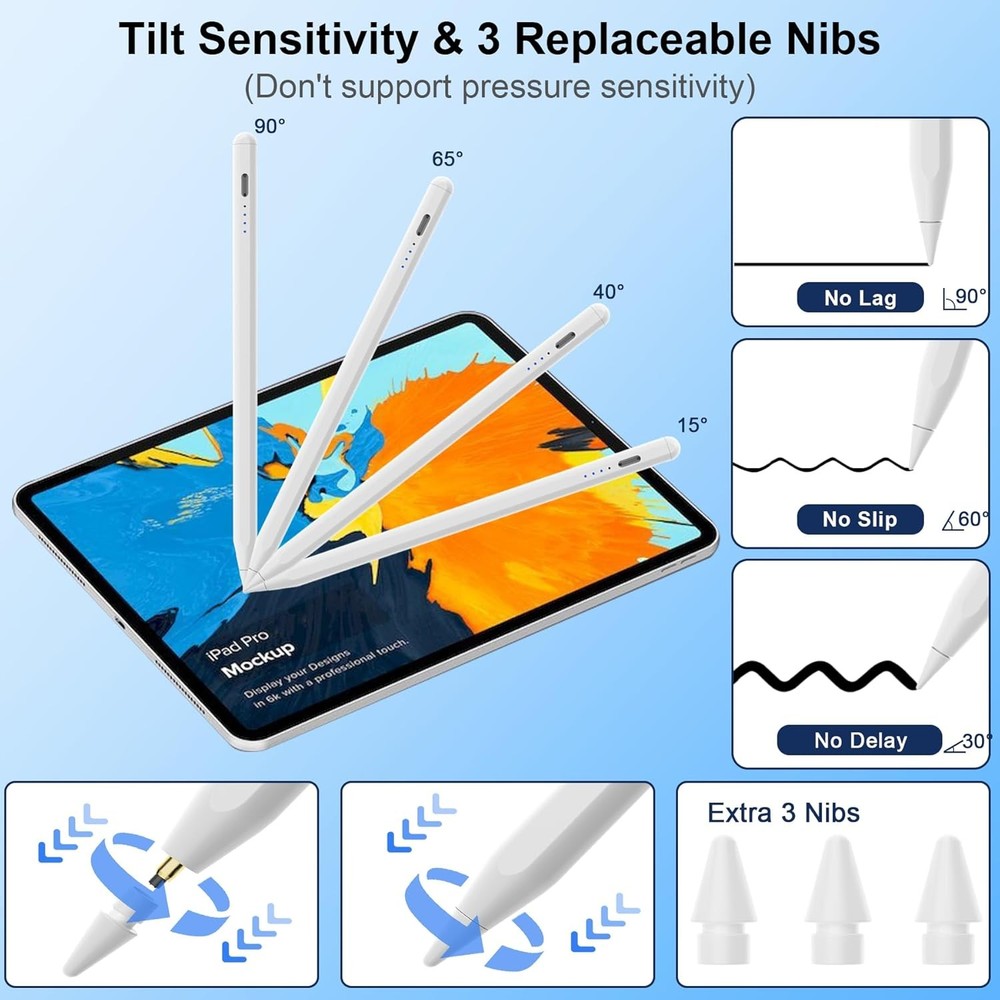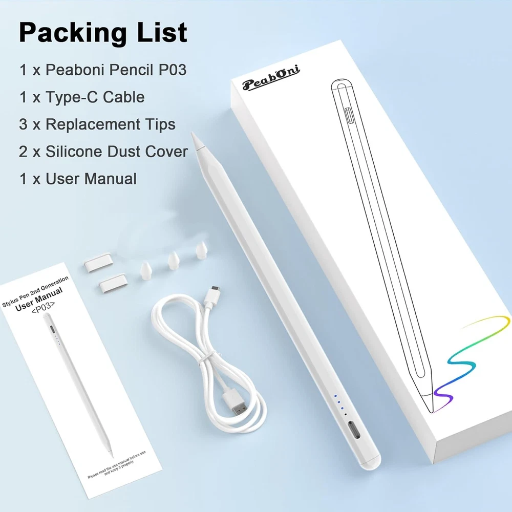 Free eBay listing template designed by dewiso.com Stylus Pen for iPad 2018-2024 Released Model 15 Mins Fast Charge Pencil 2nd Generation Compatible with iPad Pro 11"/12.9"/M4, Air 3/4/5/M2,Mini 7(A17 Pro)/6/5 Gen, iPad 10/9/8/7/6 White FREE AND FAST SHIPPING! About this item Compatible With iPad 2018-2024 Model: Peaboni upgrade 2nd generation pencil compatible with iPad 2018-2024 released models: iPad Pro 11"/12.9"/13”(M4), iPad Air 3/4/5/6(M2),iPad Mini 7(A17 Pro)/6/5 Gen, iPad 10th/9th/8th/7th/6th Gen. Please confirm your iPad model before placing order. NOT Compatible with other iPad models or any other brand touchscreen devices 15 Mins Fast Charging: Peaboni ipad pencil 2nd generation can be fully charging in 15 minutes and up to 11 hours of continuous use. It will auto power-off after 5 minutes of inactivity to save power,flashing in the last minute of the 5-minute sleep mode and stops when picked up.(Please remove the white silicone dust cover when charge) Power Display: Peaboni pencil for ipad pro 2nd generation is equipped with a built-in indicator light that provides a clear and convenient power display, ensuring you can easily and clearly see the remaining power in any situation and alleviating concerns about battery life. Power display: Four power lights Blue:100% Power;Three power lights Blue:75% Power; Two power lights Blue:50% Power;One power light Blue:25% Power and the blue light flashes when on charging Palm Rejection and Magnetic Adsorption: With palm rejection,the stylus pen for iPad 10th gen allowing you to rest your hand on the screen without worrying about accidental touches. The apple pencil can be firmly attached to the side of the iPad by super strong magnetic force, without the risk of rolling or falling off, Firmly attaches to Your iPad ( Kindly Note: Don’t support Wireless Charging) Tilt Sensitivity and 3 Replaceable Nibs: Peaboni stylus pen for iPad 9th generation is equipped with 1.5mm POM nib gives high sensitivity and accuracy, with no lag, no skipping, no scratches and no delays. Built-in tilt-sensing technology, allowing tilt the stylus at different angles to precisely control and change line thickness and shading,making writing and drawing more free.(Doesn't support pressure sensitivity) And we also provide 4 replacement Nibs,you can use long lasting Product We offer a 30-Day Return Policy on items which you are not completely satisfied with. You have the option for a full-refund or an exchange of the item. No returns are available on items shipped outside of the US . Shipping We offer Free Shipping to the US and ship within 2 business days of payment, usually sooner. We use UPS express shipping. That's why your products are usually delivered within 3 days . Contact We try our very best to make sure every customer is completely satisfied. If there's a problem , message us! We're happy to help. 24/7 live chat available.