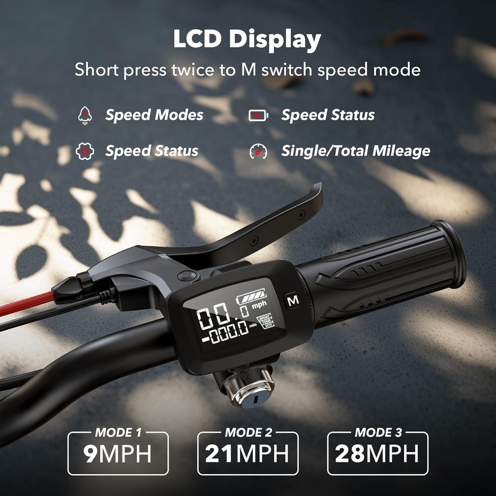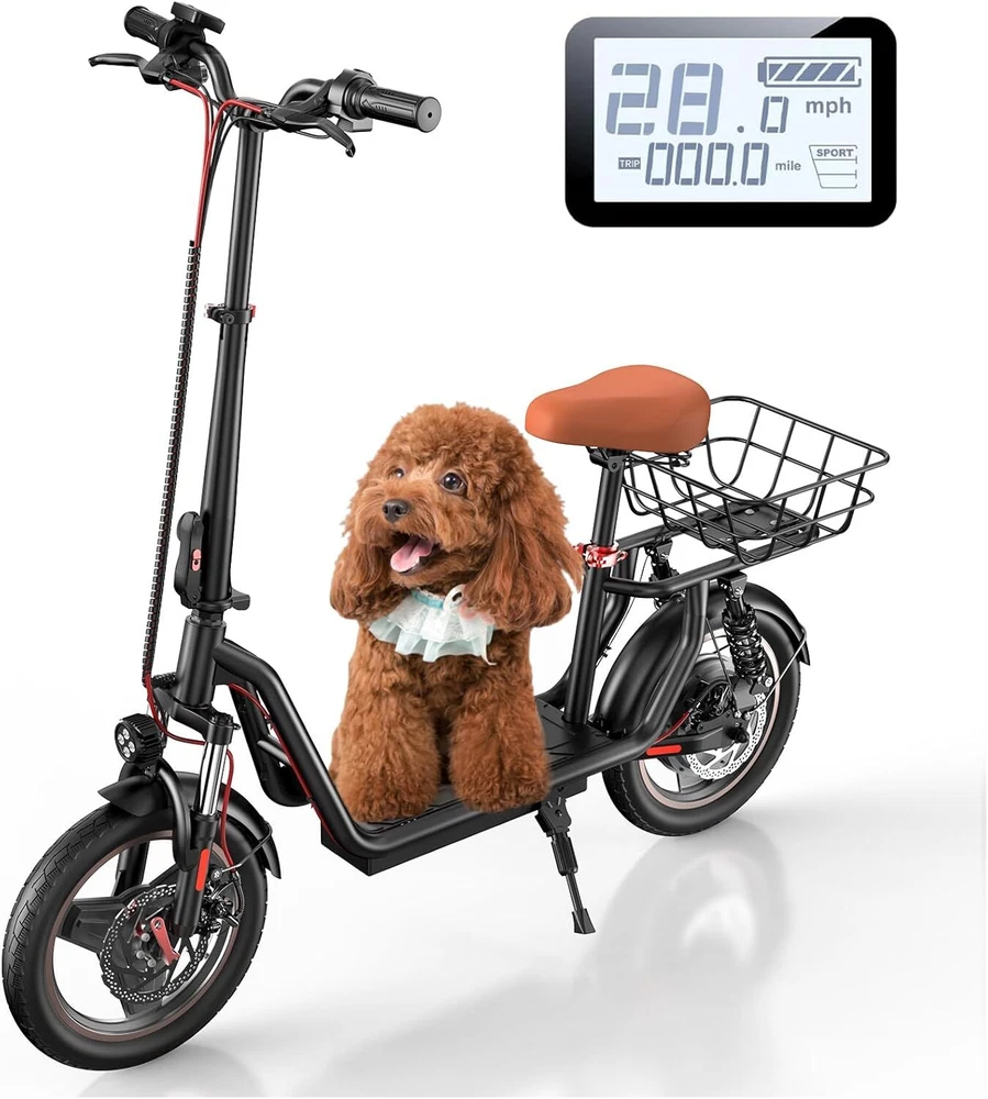 Specification: i14 Parameters Model i14 Max Speed 21 MPH Max Range 34miles/55km Charging Time 6-7h Max Slope 15% Net Weight 64 lbs Motor 800W Battery 48V 10Ah Foldable Yes Brake Dual Disc Brake Charger 54.6V2A Lights Front white light and red tail light, turn signal Suspension Type ‎Front and rear dual suspensions Drive Type Rear Wheel Drive Wheel Size 14 inches Wheel Type Pneumatic Wheel Material Rubber Age Range 14+ Max Load 264 lbs Unfolded Dimensions LxWxH 51.2*23.7*48.4 inches Folding Dimensions LxWxH 51.2*23.7*25.6 inches Main features: 【2024 New Releases Electric Scooter】 Equipped with an 800W motor and adjustable seat, iScooter electric scooter adults offers a smooth and customizable ride. The 14” pneumatic tires and 3 speed (9/15/21Mph) mdoes settings ensure excellent performance across various terrains, while the 264 lbs weight capacity accommodates a wide range of users. Please notes: Short press twice to M switch between speed mode: ECO, TOUR and SPORT 【Long-Lasting Range & Extensive Storage】 Scooter for adults features a 48V/10.4AH battery that provides up to 34 maximum miles of range on a single charge. Equipped with a convenient removable basket for carrying groceries or personal items and the wider pedals to enhance riding comfort, electric scooter with seat it's a great choice for everyday travel. 【Safety to Ride】 For enhanced safety, adult electric scooter comes with front and rear lights that increase visibility during night rides. The electric lock and front and rear disc brakes provide reliable stopping power. Scooter electric is UL2272 certified, ensuring it meets high safety standards. Perfect for city commuting, campus travel, and office commutes. 【Comfort & Portability】 Featuring front and rear suspension for a smooth ride, iScooter electric scooter for adults handles rough surfaces with ease. It effortlessly handles 15% inclines while ensuring a smooth and comfortable ride, even on bumpy terrain. Scooters for adults adopt one-step folding mechanism Weighing just 65 lbs, it fits conveniently in the trunk of your car. 【Quality Assurance by iScooter】 We stand behind our products with a 12-month or 180-day warranty on various parts. Our dedicated customer support team is always available to address any queries or concerns. Your satisfaction is our top priority. Elevate your lifestyle with iScooter's Folding Electric Scooter today! The package includes: 1 x i14 Electric scooter 1 x Charger 1 x Wrench 1 x Manual
