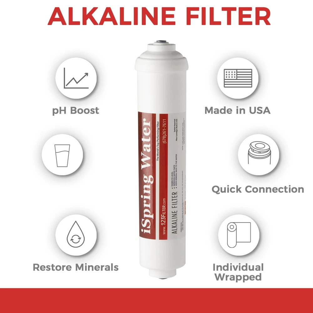 Individually wrapped, universal sized, alkaline filter replacement cartridge for iSpring PH100 and most industry standard 10" 6-stage reverse osmosis RO systems. This alkaline remineralization filter restores minerals and produces balanced alkalinity. This filter is option add-on filter to compliment any existing or new reverse osmosis RO water filtration systems. iSpring FA15US Alkaline Filter is built with a secure push-fit quick connection on both sides. Comes with 1/4" and 3/8" both size quick connection fittings. If you have trouble installing the filters please either refer to the user manual or contact us directly. Average Filter Life: 6 -12 months, depending on your source water and usage. We offer tech and customer service support by phone or email from our Georgia, USA Free Shipping Over $49.99* Details iSpring Alkaline Replacement Water Filter Cartridge for RO System, pH Product Description: Individually wrapped, universal sized, alkaline filter replacement cartridge for iSpring PH100 and most industry standard 10" 6-stage reverse osmosis RO systems. This alkaline remineralization filter restores minerals and produces balanced alkalinity. This filter is option add-on filter to compliment any existing or new reverse osmosis RO water filtration systems. iSpring FA15US Alkaline Filter is built with a secure push-fit quick connection on both sides. Comes with 1/4" and 3/8" both size quick connection fittings. If you have trouble installing the filters please either refer to the user manual or contact us directly. Average Filter Life6 -12 months, depending on your source water and usage. We offer tech and customer service support by phone or email from our Georgia, USA location. Contact our knowledgeable team for help with product selection that fits your specific water filtration needs and after-sale support to simplify your user experience. We are happy to be here to support our customers now and in the years to come.