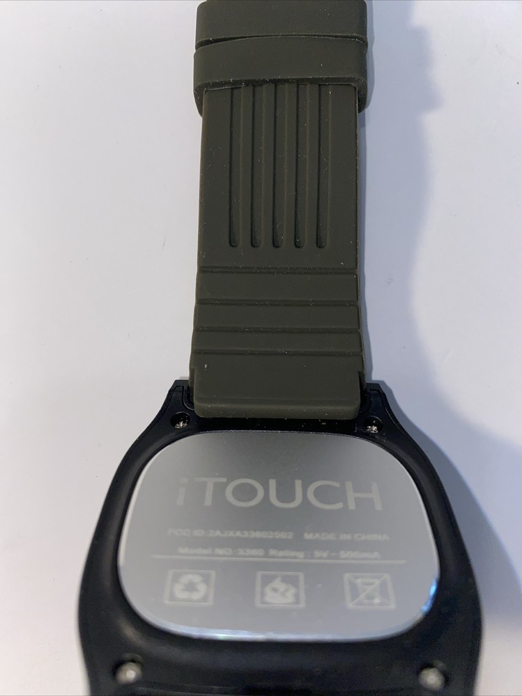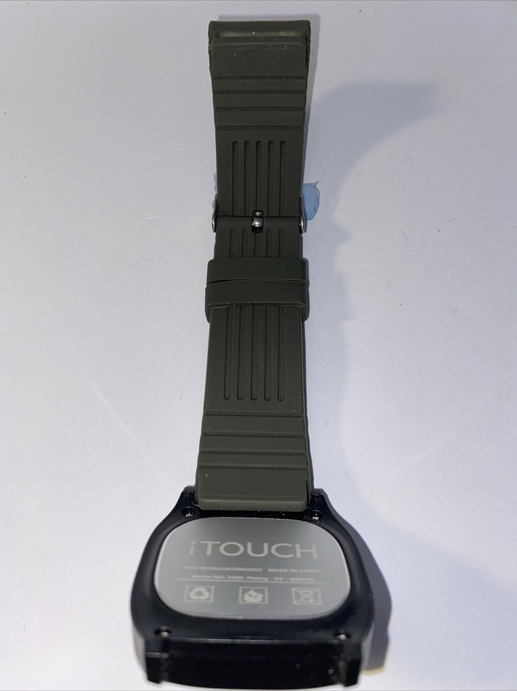 This iTOUCH Smart Watch Model 3360 is the perfect accessory for fitness enthusiasts. The watch features a gunmetal bronze case color with a black silicone band that complements any style. It is compatible with both iOS and Android operating systems, making it versatile and accessible. The watch is designed with a 46 mm case size and is made with stainless steel case material. It includes a fitness tracker feature that allows you to keep track of your daily activities. This smartwatch is ideal for those who are always on the go and want to stay fit. Silicon wristband broken needs to be replaced No charger Sold as is