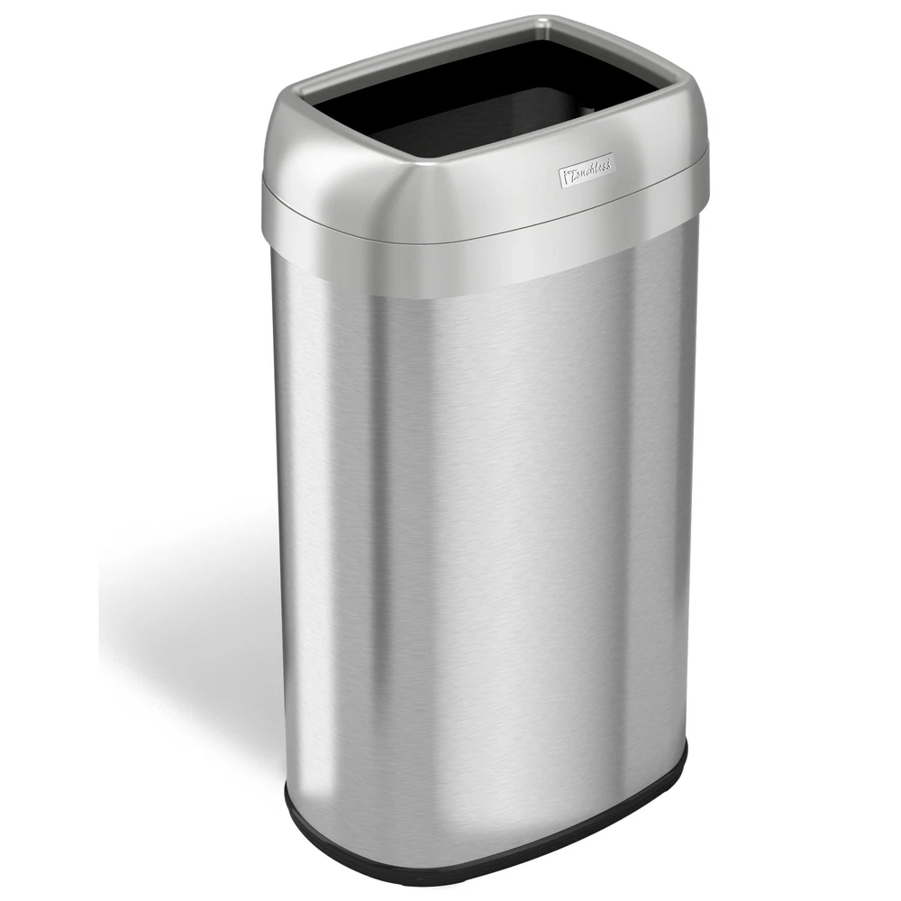 The new iTouchless Open Top Stainless Steel Garage Can features a versatile flat-oval and lid-free design with a brushed stainless steel finish. In order to keep odors out of its surrounding environment, the garbage can features two heavy-duty carbon filter deodorizers. The two filters are located inside on each side of the trash can and guarantee 100-percent odor absorption. The open top design provides convenience and is also hygienic and contributes to the elimination of build-up. Features:Open-top design eliminates build-up of germsBrushed stainless steel design makes for an elegant fit in any spaceVersatile flat oval design can fit any type of environmentDimension: 16 W x 11.5 D x 28.5 HDual heavy duty deodorizers to keep odors in the trash canEasy to clean design with a smooth Free Shipping Over $49.99* Details iTouchless 16 Gal Stainless Steel Oval Open Top Trash Can with Filters Product Description: The new iTouchless Open Top Stainless Steel Garage Can features a versatile flat-oval and lid-free design with a brushed stainless steel finish. In order to keep odors out of its surrounding environment, the garbage can features two heavy-duty carbon filter deodorizers. The two filters are located inside on each side of the trash can and guarantee 100-percent odor absorption. The open top design provides convenience and is also hygienic and contributes to the elimination of build-up. Features: Open-top design eliminates build-up of germs Brushed stainless steel design makes for an elegant fit in any space Versatile flat oval design can fit any type of environment Dimension16 W x 11.5 D x 28.5 H Dual heavy duty deodorizers to keep odors in the trash can Easy to clean design with a smooth finish Carrying handle allows for quick and easy transportation No batteries required 1 year limited warranty ShapeOval TypeOpen Lid Product FeaturesFiltered, Fingerprint Proof, Removable Liner MaterialStainless Steel Size15+ Gallons Exact ColorSilver ColorSilver