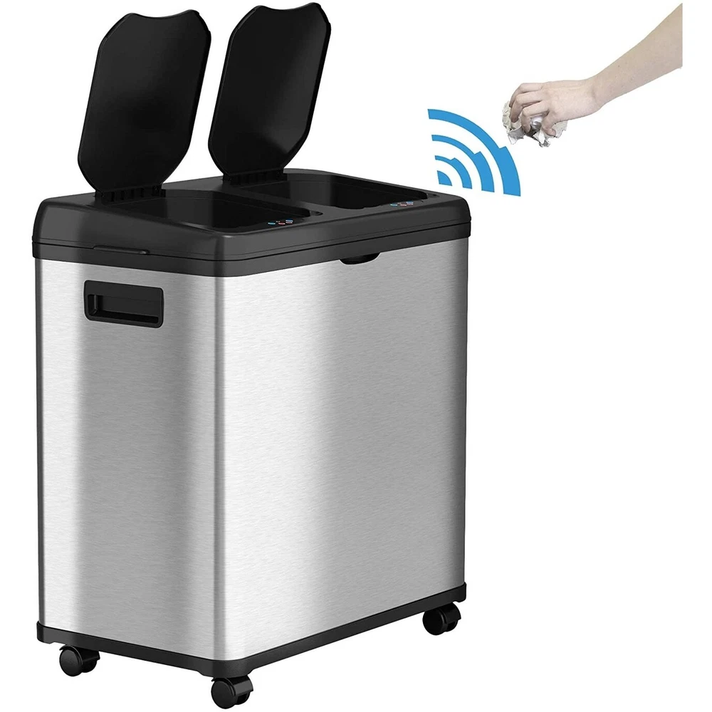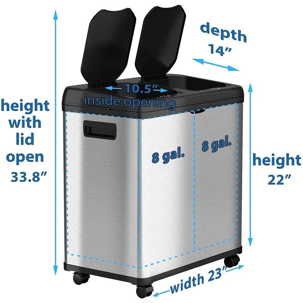 This stainless steel commercial grade 16 gallon touchless Recycle/Trash Can has two separate 8 gallon lidded compartments. One compartment for trash and one for recycle, or one for paper and one for bottles and cans. It uses the latest sensor technology, simply place your hand or debris about 6 inches away from one of two infrared sensors on top of the trash can and the lids will open automatically independent of each other. Each lid will remain open if debris or your hand is within the 6 inch range of the infrared sensor. It will close automatically 3 seconds after debris has been released and your hand has been moved away. There are two sets of buttons to open and close each lid manually, and a power switch to turn on/off the recycle can. You can also lift the lids manually without Free Shipping Over $49.99* Details iTouchless 16 Gallon Stainless Steel Dual-Compartment (8 Gal each) Sensor Trash Product Description: This stainless steel commercial grade 16 gallon touchless Recycle/Trash Can has two separate 8 gallon lidded compartments. One compartment for trash and one for recycle, or one for paper and one for bottles and cans. It uses the latest sensor technology, simply place your hand or debris about 6 inches away from one of two infrared sensors on top of the trash can and the lids will open automatically independent of each other. Each lid will remain open if debris or your hand is within the 6 inch range of the infrared sensor. It will close automatically 3 seconds after debris has been released and your hand has been moved away. There are two sets of buttons to open and close each lid manually, and a power switch to turn on/off the recycle can. You can also lift the lids manually without using the battery. Fits any regular 8 to 13 gallon size trash bags in each compartment or just use the two included inner plastic buckets.