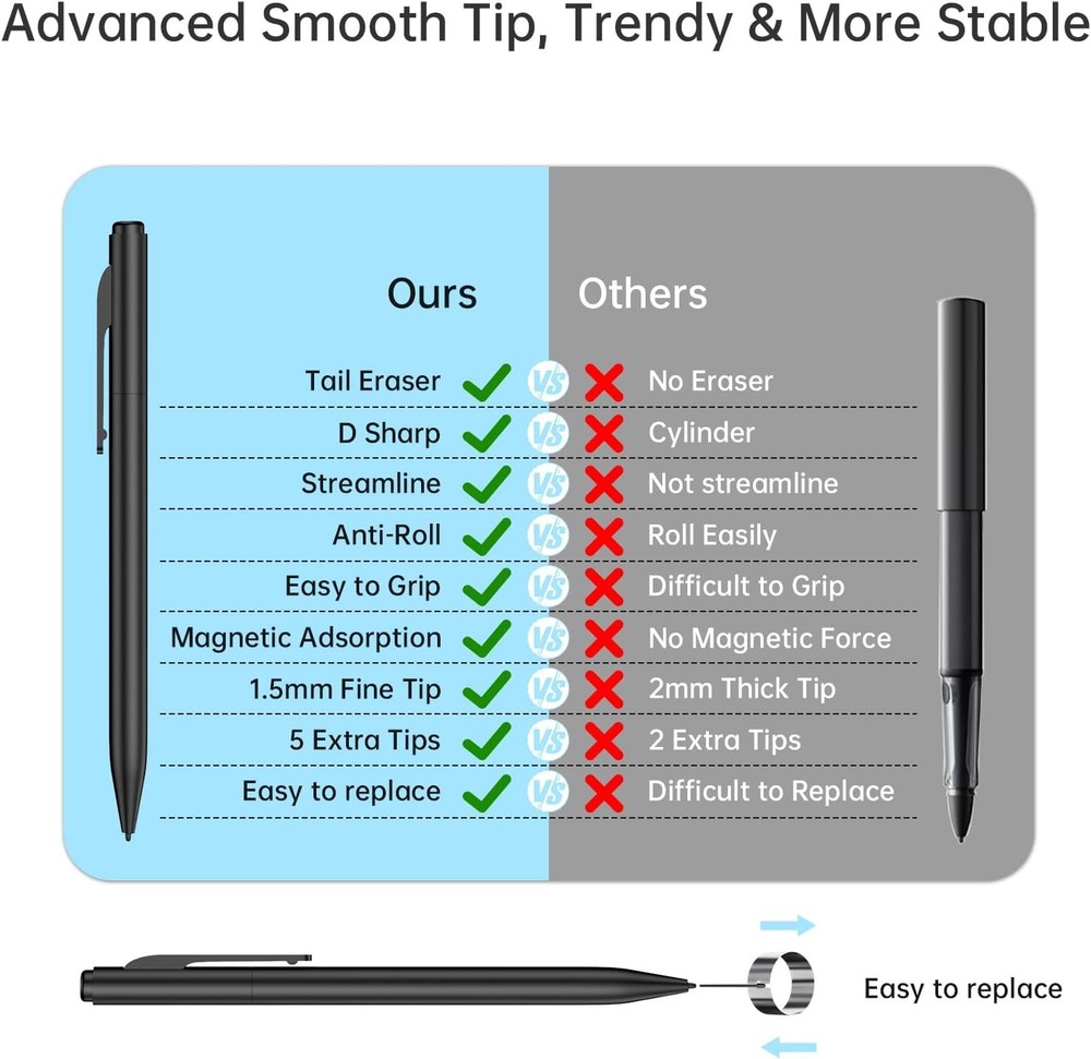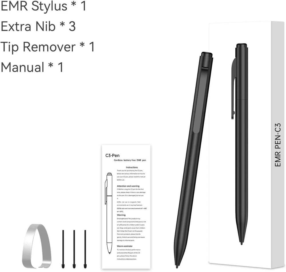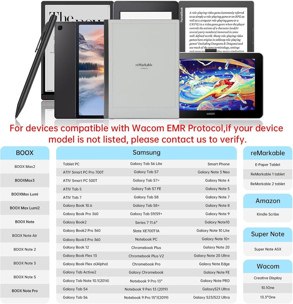 iafer Galaxy Pen with Eraser, EMR Stylus Tilt, Palm Rejection, Black Product Details Product Dimensions: 6.1 x 0.35 x 0.35 inches Item Weight: 0.634 ounces Item model number: Galaxy pen Manufacturer: iafer Color: Black Brand: iafer Material: Plastic Compatible Devices: Galaxy Tablet, Kindle Scribe Tablet, Boox Note Tablet, Wacom Drawing Tablet, HP EMR Devices, Sam-sung Notebook 9, Galaxy Note, Galaxy Book, Samsung, Galaxy Tab S6+/S7+/S8+/S9+. EMR devices that have EMR technology built into the display of the devices Galaxy Tablet, Kindle Scribe Tablet, Boox Note Tablet, Wacom Drawing Tablet, HP EMR Devices, Sam-sung Notebook 9, Galaxy Note, Galaxy Book, Samsung, Galaxy Tab S6+/S7+/S8+/S9+. EMR devices that have EMR technology built into the display of the devicesGalaxy Tablet, Kindle Scribe Tablet, Boox Note Tablet, Wacom Drawing Tablet, HP EMR Devices, Sam-sung Notebook 9, Galaxy Note, Galaxy Book, Samsung, Galaxy Tab S6+/S7+/S8+/S9+. EMR devices that have EMR technology built into the display of the devices See more Item dimensions L x W x H: 6.1 x 0.35 x 0.35 inches Are Batteries Included: No Batteries Required?: No Item Diameter: 9 Millimeters 【4096 Pressure Sensitivity & Tail Eraser】Galaxy Pen fine control with 4096 pressure points, iafer Galaxy pen ink flows out from a 1.5mm tip in real-time with no lag or latency. The erase on the tail end rubs away your mistakes quickly, you can erase lines and letters simply flipping the pen upside down, just like using your graphite pencil. 【Tilt Function & Palm Rejection】The tilt-to-thicken feature lets your Galaxy S Pen adapt to different angles for natural, expressive strokes. With advanced palm rejection, rest your hand comfortably on the Galaxy tablet screen while drawing—no accidental touches. 【Advanced Smooth Tip & Premium Feel】The Galaxy S Pen features an advanced smooth nib crafted from premium ABS+PC material, offering a natural pencil-like glide while protecting your Galaxy tablet screen. Effortlessly replaceable—simply use the clip to gently swap nibs for uninterrupted creativity. 【Wide Compatibility】iafer EMR stylus pen specially designed for EMR devices that have EMR technology built into the display of the device like Galaxy, Kindle Scribe, Most Sam-sung devices: Galaxy Tab, Galaxy Note, Galaxy Book, BOOX, Wa-com One etc. For more compatible models, please contact us to check if it is compatible