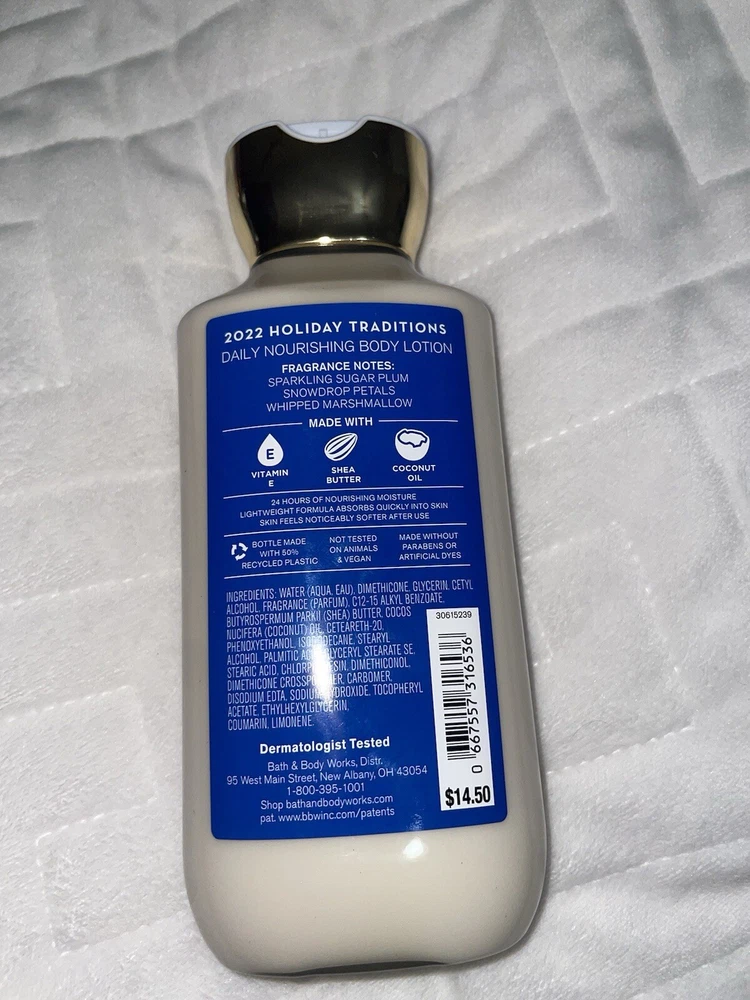 Ingredients: Shea Butter Size: Regular Features: Hydrating Volume: 8 fl oz Color: Beige Type: Daily Use Formulation: Lotion Body Area: Full Body Product Line: bath and body works Main Purpose: Moisturizer, Stress Relief Brand: Sugar Scent: Plum Active Ingredients: Aloe Vera