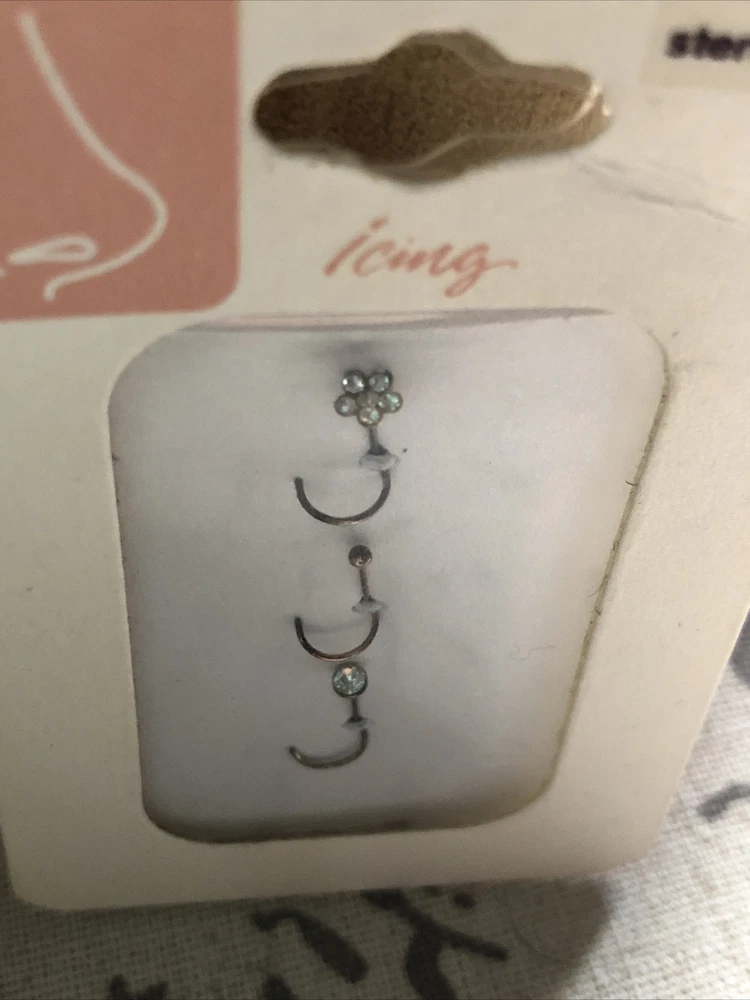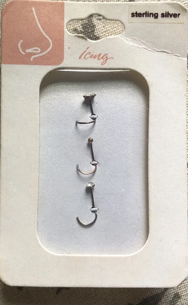 Spice up your look with this three-pack of sterling silver nose rings from icing. Perfect for any occasion, these nose rings are stylish and unique. Made from high-quality silver, they are durable and will last for a long time. Featuring a beautiful silver color and a delicate design, these nose rings are perfect for those who want to add a touch of elegance to their style. With the icing brand, you can trust that you are getting a quality product that is stylish and reliable icing Sterling Silver Nose Ring 3 pack ( Flower, Ball & Rhinstone stud) Brand New in original packaging! Paid $9.50