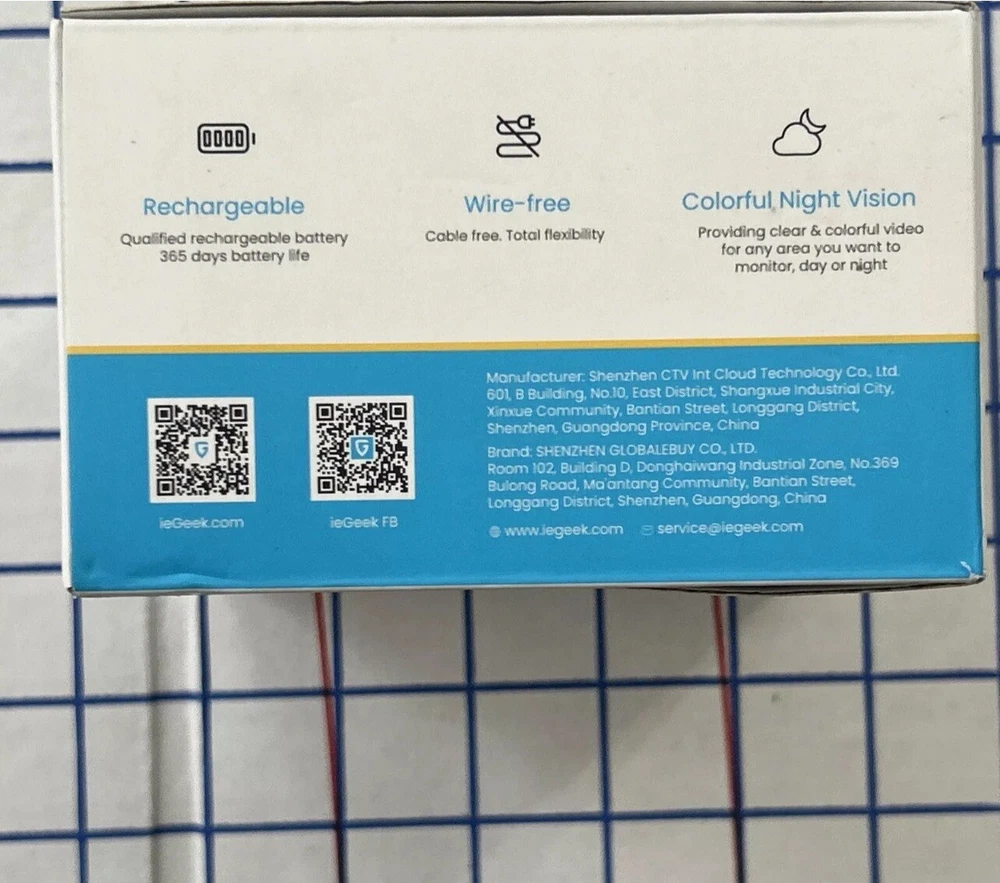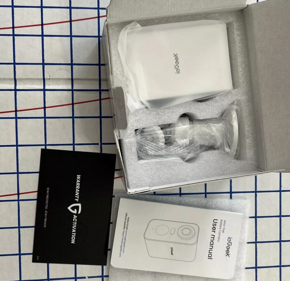 Condition: New Open Box Brand: ieGeek Included: Camera USB Cable Features: - 3 Alarm Modes: There are 3 alarm modes(sound alarm/light alarm/sound and light alarm) to ensure safety. - WiFi Wireless Camera: Built-in 3dBi wifi antenna, this camera provides a powerful and stable WiFi connection. - 2K HD camera: This 2K camera captures clear images and supports color night vision.- Motion Detection: This camera offers motion detection, humanoid detection and precise alarm, supporting micro SD card (up to 128 GB) storage and cloud storage. - Multifunctional: This security camera supports two-way audio, Android/iOS system mobile devices, and remote real-time monitoring. Features: - 3 Alarm Modes: There are 3 alarm modes(sound alarm/light alarm/sound and light alarm) to ensure safety. - WiFi Wireless Camera: Built-in 3dBi wifi antenna, this camera provides a powerful and stable WiFi connection. - 2K HD camera: This 2K camera captures clear images and supports color night vision. - Motion Detection: This camera offers motion detection, humanoid detection and precise alarm, supporting micro SD card (up to 128 GB) storage and cloud storage. - Multifunctional: This security camera supports two-way audio, Android/iOS system mobile devices, and remote real-time monitoring. Easy to install in 1 minute,100% wireless and rechargeable - ieGeek Wireless outdoor security cameras with professional rechargeable batteries and compact design, no cable to connect, are very convenient, easy to install, easy to install in 1 minute, connect in 10 seconds, and can be used indoors and outdoors. 5GHz wifi is not supported.  2K QHD video and 33-foot color night vision - the ieGeek ZS-GX3S camera delivers high-resolution 3MP image quality with 1.5 times more detail than traditional 1080p cameras. With 2 PIR leds and 2 white lights, a 130-degree wide-angle lens and a 33-foot night vision range, you can monitor farther, wider, and clearer environments day or night. AI & PIR Motion Detection and real-time alarm notifications - The latest wifi camera AI/PIR quick response mechanism identifies people and sends alert notifications (0.2-3 seconds). When movement is detected, it sends instant alert notifications, records alert video and audio, and activates alert sounds and spotlights to block unwanted visitors. 100% features free,IP65 waterproof - all features of the "ieGeek Cam" app are free, no subscription fee, lots of custom features,