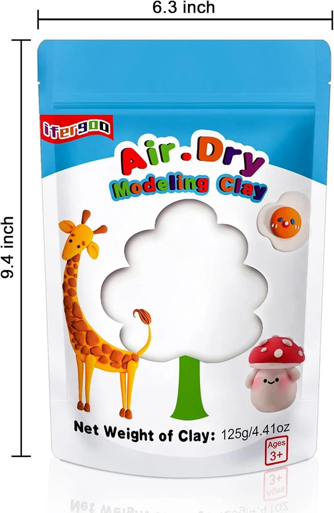 ifergoo Modeling Clay, 24/36 Colors Air Dry Clay Best Gift for White Color Product Details Brand: ifergoo Color: White Color Age Range (Description): Kid Material: Clay Item Weight: 4.45 Ounces Number of Items: 1 Recommended Uses For Product: Playing, Modeling Special Feature: Non Toxic Included Components: 24 Colors Molding Clay Set, Project Booklet in English Educational Objective: Creative Skill Model Name: ifergoo Modeling Clay Item dimensions L x W x H: 7.09 x 4.72 x 0.59 inches Product Dimensions: 7.09 x 4.72 x 0.59 inches Item Weight: 4.5 ounces Item model number: NT-01 Manufacturer: ifergoo AIR DRY & NO BAKING- No need baking, just leave the clay work in air for 18-48 hours, it will be dry. NON TOXIC & NON SMELL- 100% safe for Children. Wheat, tree nut or peanut-free, ASTM F963-17, CPSIA & EN71 certified. Kid-friendly and parent approved! LARGE AMOUNTS REFILL CLAY - One large package equals 10 small packets. Gives you plenty of clay to work with big clay project MULTIPLE USED -Air Dry Clay for Cosplay and Costumes, Moldable Creative clay used for Arts ,Crafts ,Create detailed ornaments and pieces . DEVELOPS IMAGINATION - ifergoo air dry clay will help your kids develop their imagination and enhance confidence.