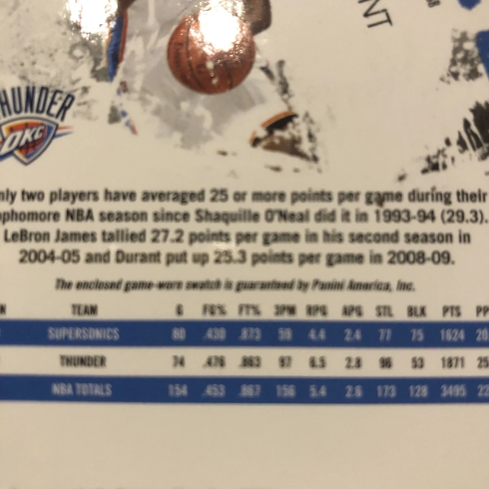 Card is in excellent condition suitable for grading with a nice swatch of game worn jersey (See pics). Very cool rare early career memorabilia card limited to only 250 total copies produced and when Panini’s swatches were still game worn. Always a good time to invest in the all time greats of the game like first ballot Hall of Famer Durant. I will combine shipping for multiple items so please check out my other listings!