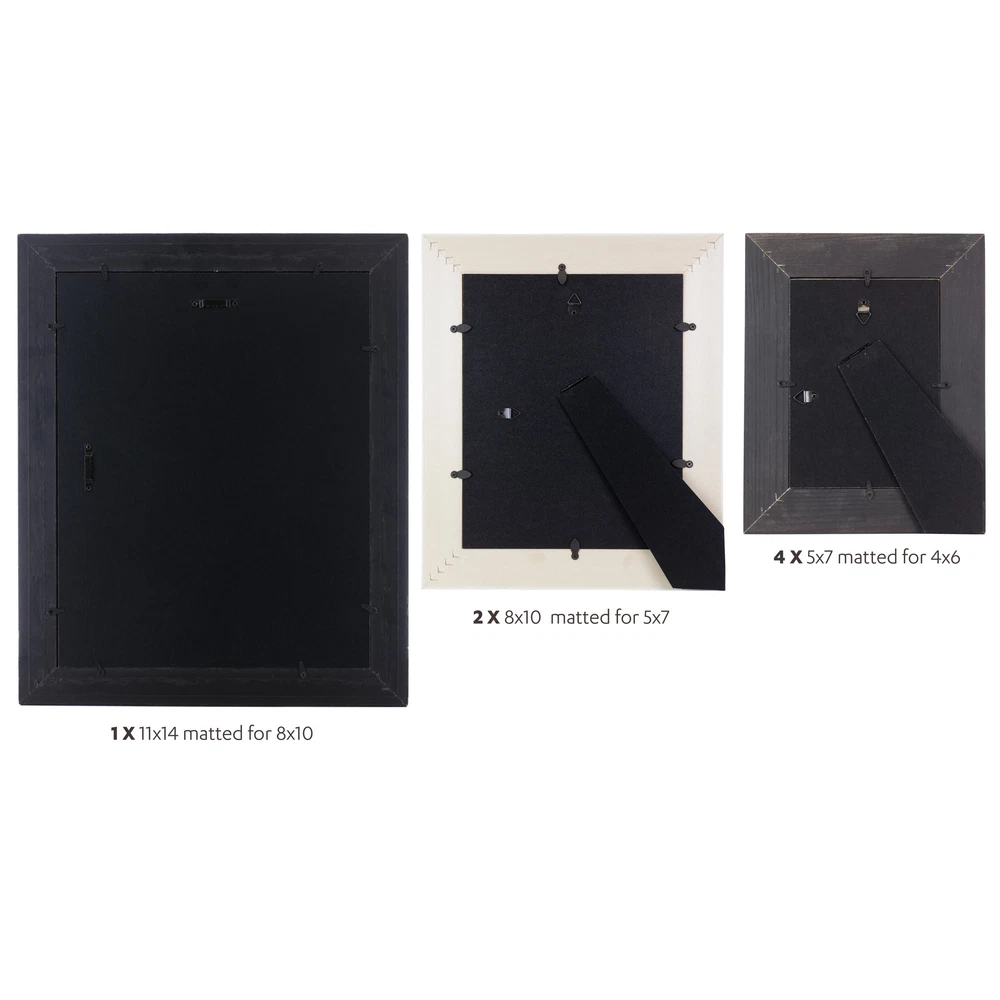 The KG Mixed Farmhouse Gallery Set allows you to display an array of photos in minutes, making an easy addition to your décor. Each set included 4 Raymond Frames, sized 5x7" matted for 4x6", 2 Gary Frames, sized 8x10" matted for 5x7", and 1 Jean frame, sized 11x14" matted for 8x10". Blending a homespun edge with a touch of gold-effect, this mixed grey gallery is a gorgeous home for your memories.SET OF 7 STYLISH, ELEGANT FRAMES - Make an instant photo display! You'll love the Farmhouse Gallery Frame set. Combining rustic styles, this set is great for creating a beautiful group of photos. FOUR RAYMOND FRAMES - Grey, bevelled, worn-look wood frame! The Raymond measures 7"W X 9"H X 0.5"D. The frame opening is 4" x 6". With an easel back and hangers, this frame has a multitude of display Free Shipping Over $49.99* Details kieragrace KG Farmhouse Gallery Set of 7 Product Description: The KG Mixed Farmhouse Gallery Set allows you to display an array of photos in minutes, making an easy addition to your décor. Each set included 4 Raymond Frames, sized 5x7" matted for 4x6", 2 Gary Frames, sized 8x10" matted for 5x7", and 1 Jean frame, sized 11x14" matted for 8x10". Blending a homespun edge with a touch of gold-effect, this mixed grey gallery is a gorgeous home for your memories.SET OF 7 STYLISH, ELEGANT FRAMES - Make an instant photo display! You'll love the Farmhouse Gallery Frame set. Combining rustic styles, this set is great for creating a beautiful group of photos. FOUR RAYMOND FRAMES - Grey, bevelled, worn-look wood frame! The Raymond measures 7"W X 9"H X 0.5"D. The frame opening is 4" x 6". With an easel back and hangers, this frame has a multitude of display options. TWO GARY FRAMES - Grey wood frame with a brushed gold finish! The Gary measures 8"W X 10"H X 0.5"D. The frame opening is 5" x 7" and is matted for 4" x 6" with an acid-free mat.With an easel back and hangers, this frame has a multitude of display options. ONE JEAN FRAME - Gorgeous distressed metal-effect finish resin frame! The Jean measures 12"W X 17"H X 1"D. The frame opening is 11" x 14" and is matted for 8" x 10" with an acid-free mat. With sawtooth hangers it's easy to hang.HORIZONTAL AND VERTICAL TRIANGLE HANGERS - The Raymond and Gary feature triangle hangers. Don't know what picture you are going to use this frame for? No problem! Lightweight, easy to place triangle hangers make the frame versatile; use these frames for horizontal or vertical images.