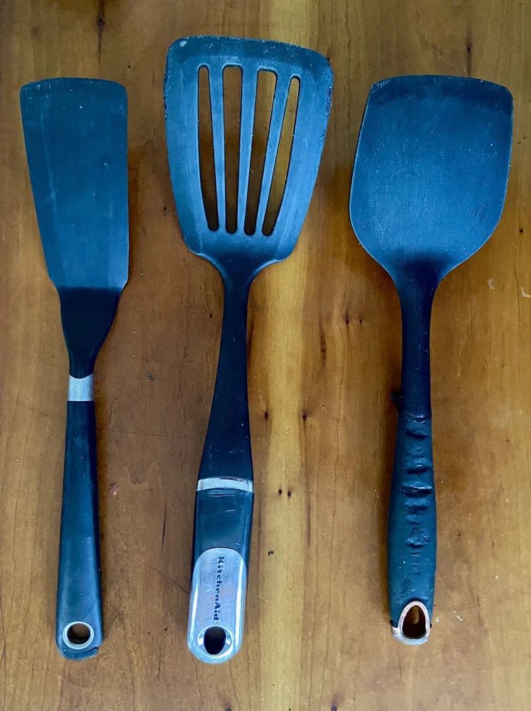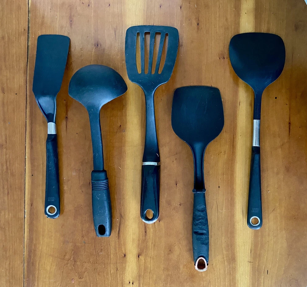 5 used kitchen utensils in good condition. Some handles show some wear but the tools are in good shape.