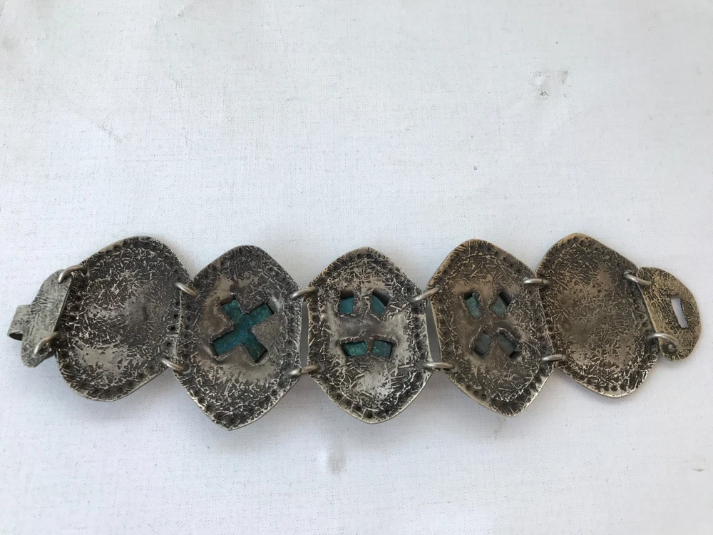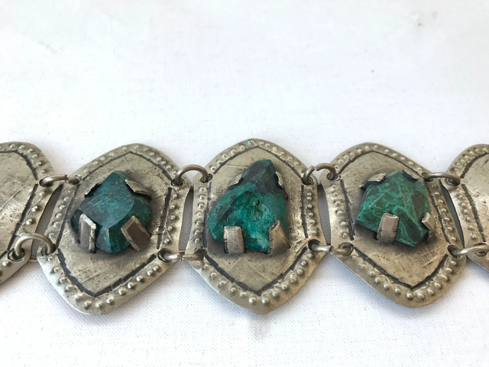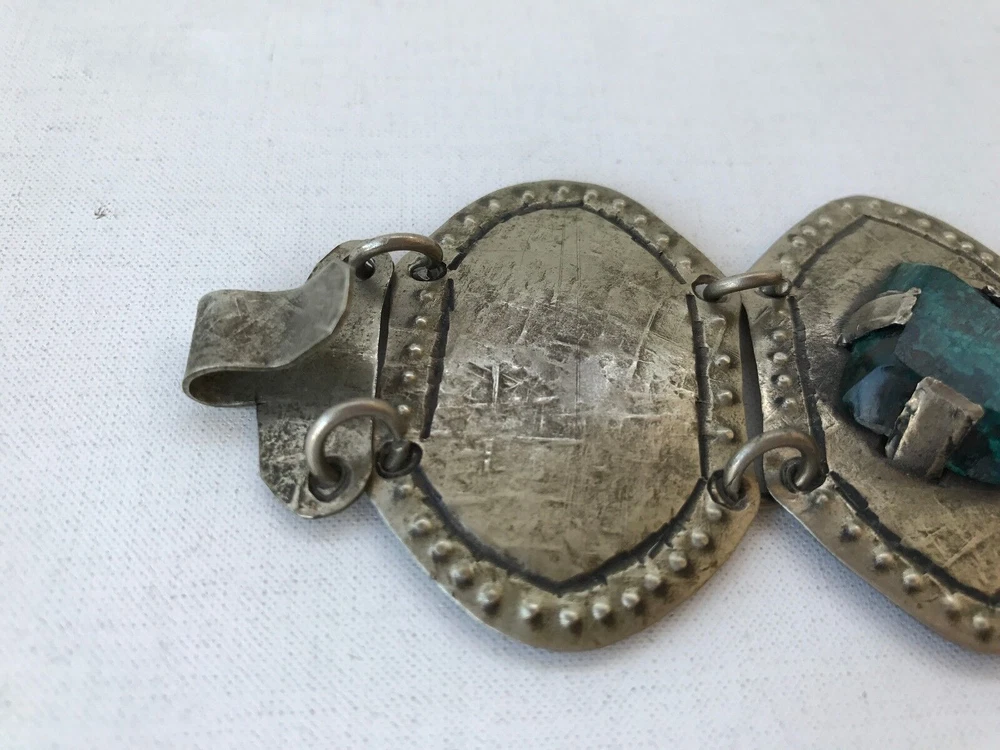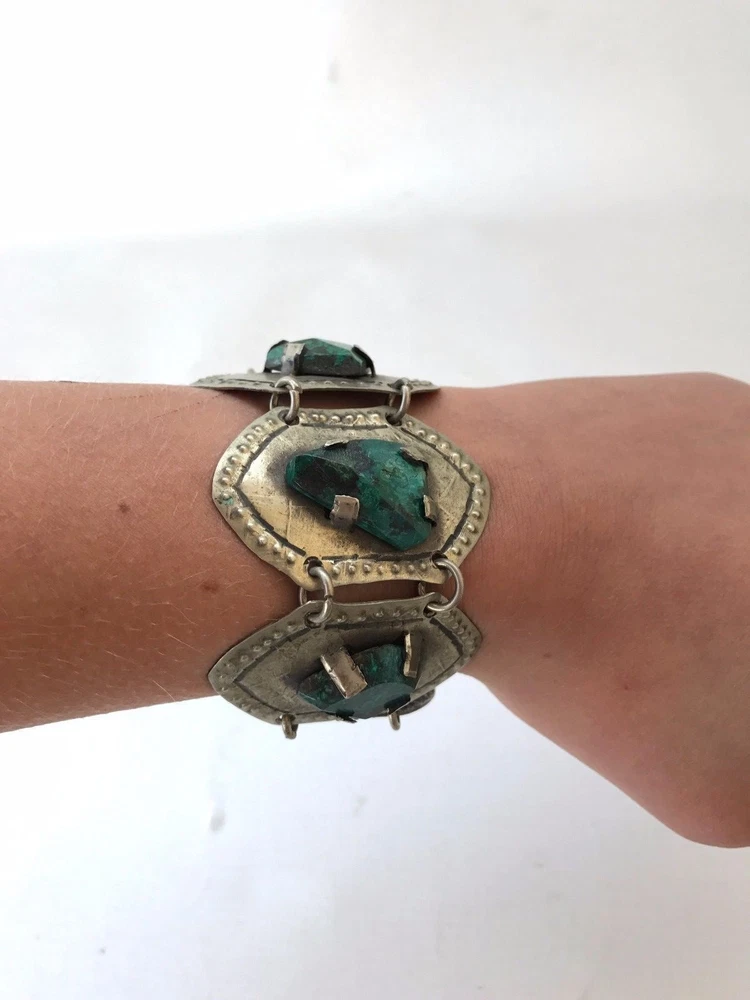 large Rustic looking 5 panel metal bracelet 3 center green marble colour stones in good condition 19cm long from end to end including the clasp