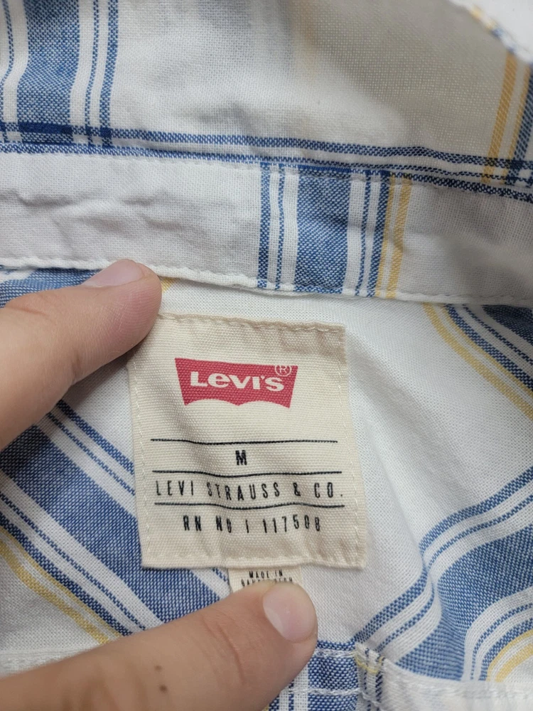 This is a Levi's casual button-up dress shirt for men with a plaid pattern in blue and white. It has long sleeves, a button-down collar, and is suitable for casual occasions. The shirt is in size M.