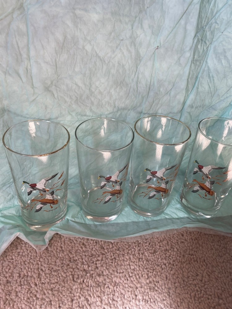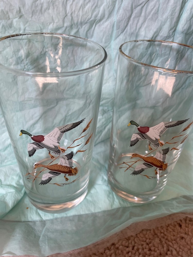 This is a vintage Libbey Mallard Duck highball glass, likely from the mid-20th century. It's a drinking glass featuring a painted design of mallard ducks in flight, often collected for its retro aesthetic .