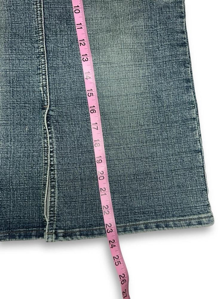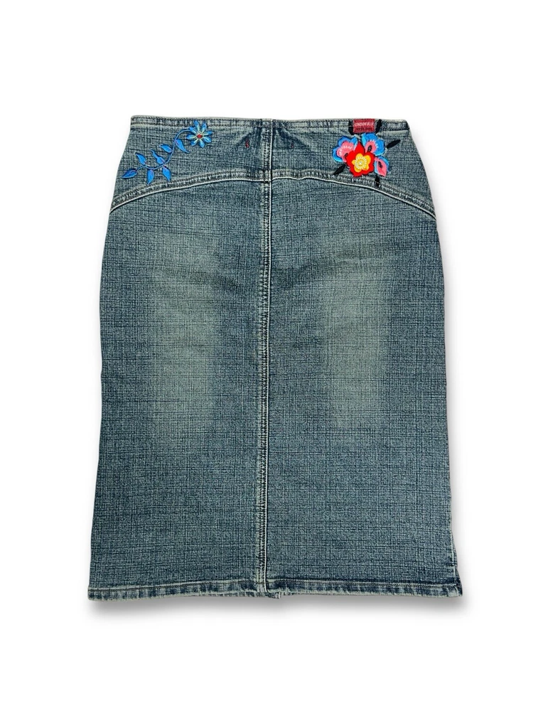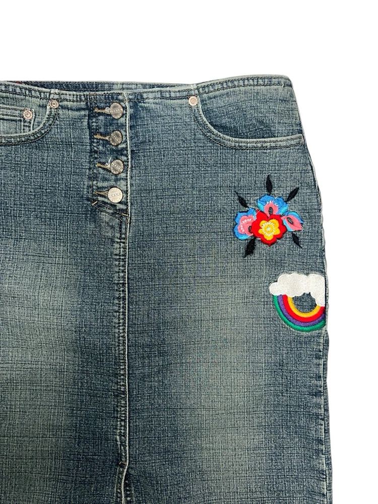 Vintage Y2K funky embroidered jean skirt by London Blue Vigoss Jeans. Four button buttonfly closure. Rainbow and flower embroidery on the left side and additional flowers on the back near waist. Two front pockets and no belt loops. Tag says size M (see measurements) 70% cotton and has some stretch to it.
