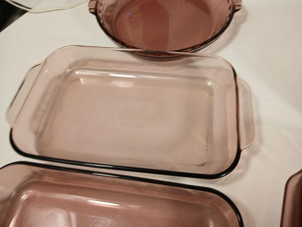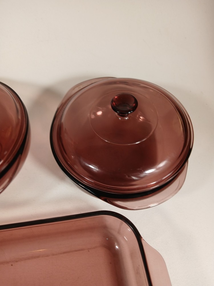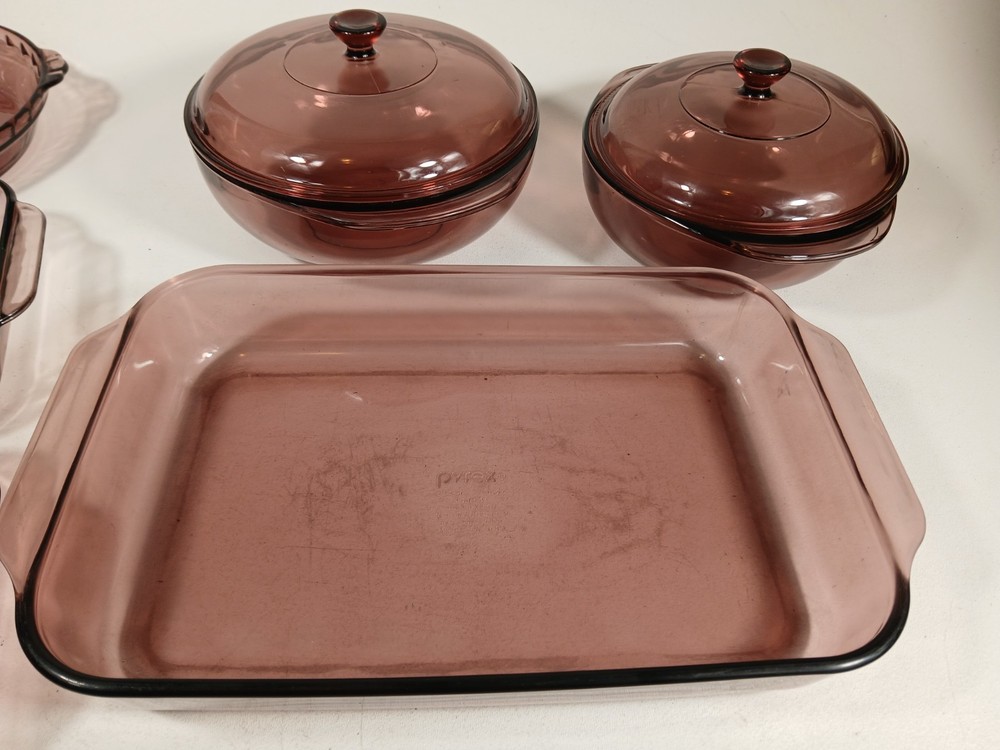024 - 2l - heavy scratches and wear, few knicks - 624c lid - a few light scratches and knicks 023 - 1.5L - light scratches and wear, few knicks - 623c lid - a few light scratches and knicks pie dish - 229 - 23cm - light scratches and wear, few knicks 232-r - 2qt - 2l casserole pan - light scratches and wear, few knicks 232-r - 2qt - 2l casserole pan - this is a little lighter shade than other pans - light scratches and wear, few knicks 233-r - 3 qt - 3l -casserole pan - heavy scratches and wear, few knicks