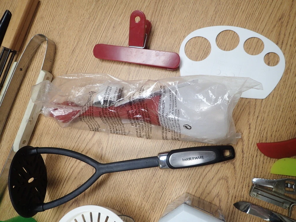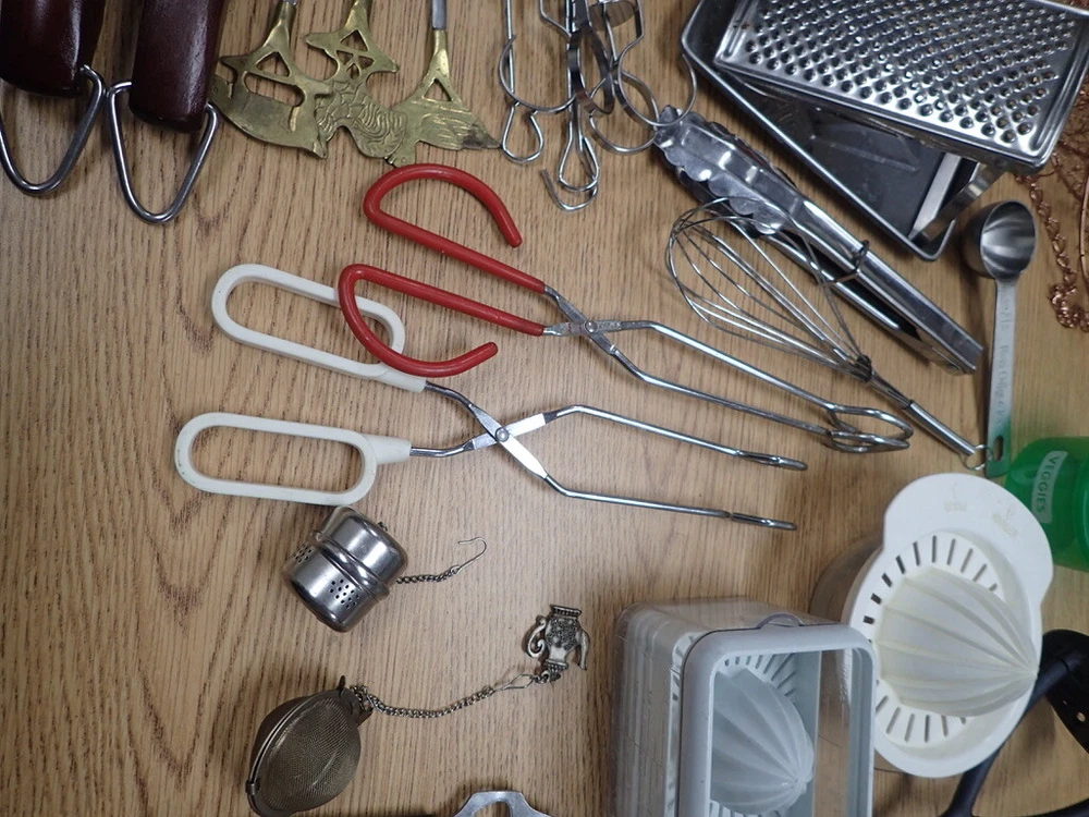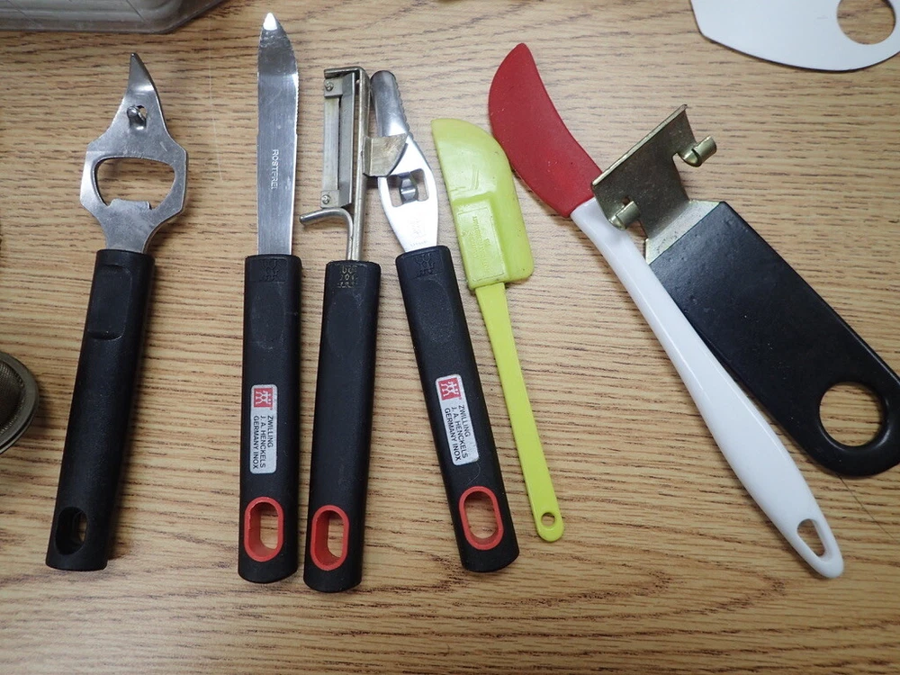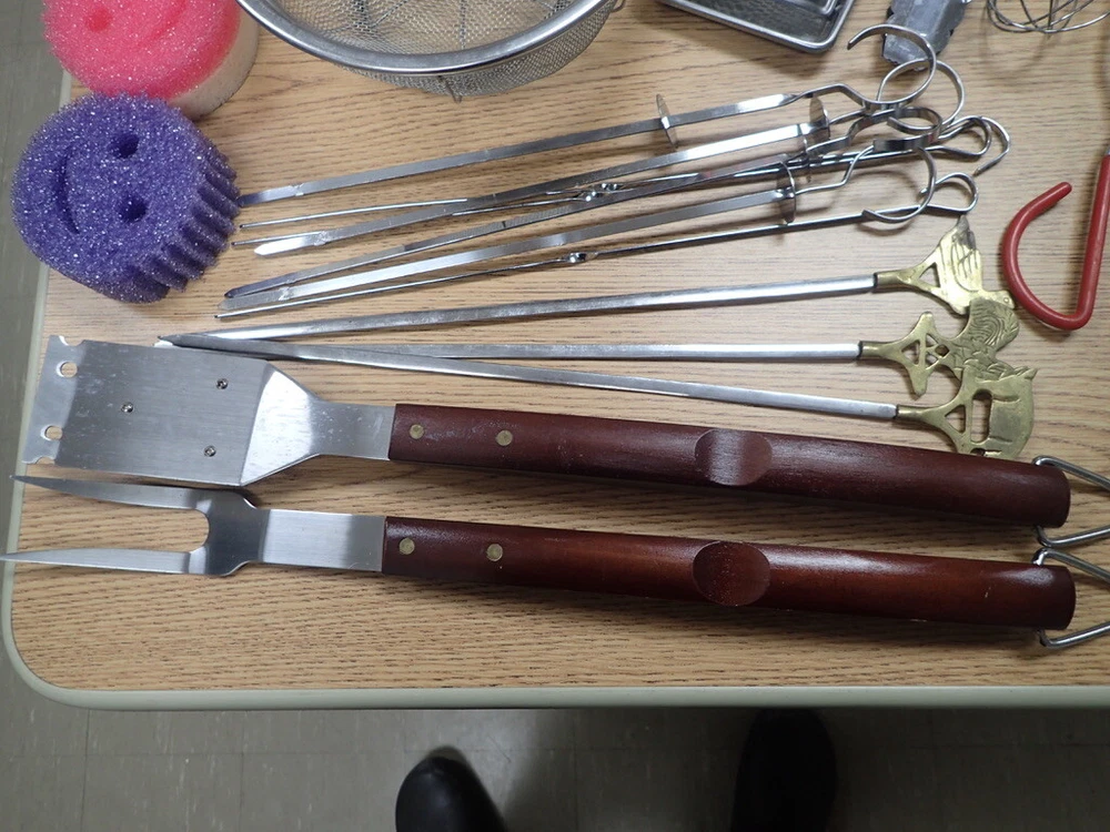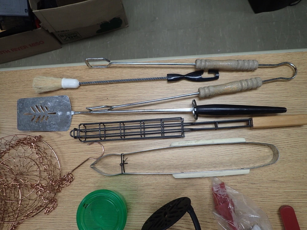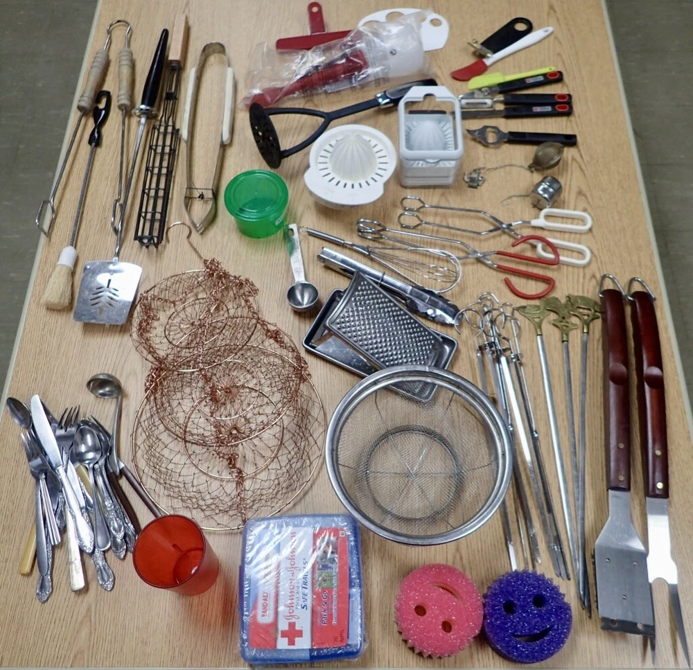 ITEM DESCRIPTION: A lot of vintage kitchen accessories and tools. ADDITIONAL INFORMATION: A variety of odds and ends silverware, a metal 3-tier hanging basket in a copper color, small Henckels tools, plastic gadgets, an assortment of grill tools and skewers, an unopened first aid kit, and much more. CONDITION: Very good, m Inor wear, as found. AGE: Unknown. COUNTRY OF ORIGIN: USA and foreign. LOTS: Due to logistic reasons we don’t break up lots. SHIPPING: We only use USPS, UPS, and FedEx. All items are safely packaged but they do still break on occasion. We buy insurance for fragile and/or valuable items. Street address required for FedEx and UPS deliveries. Bulky or very heavy items are listed for local pick-up only. INTERNATIONAL SALES: This item is available to international buyers only through the eBay Global Shipping program.