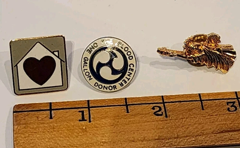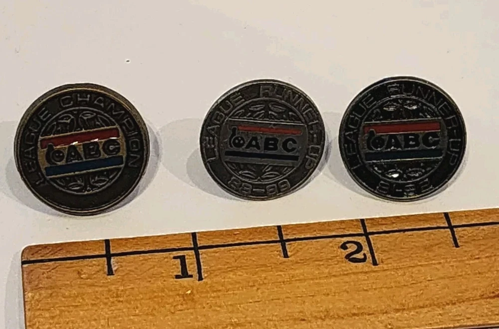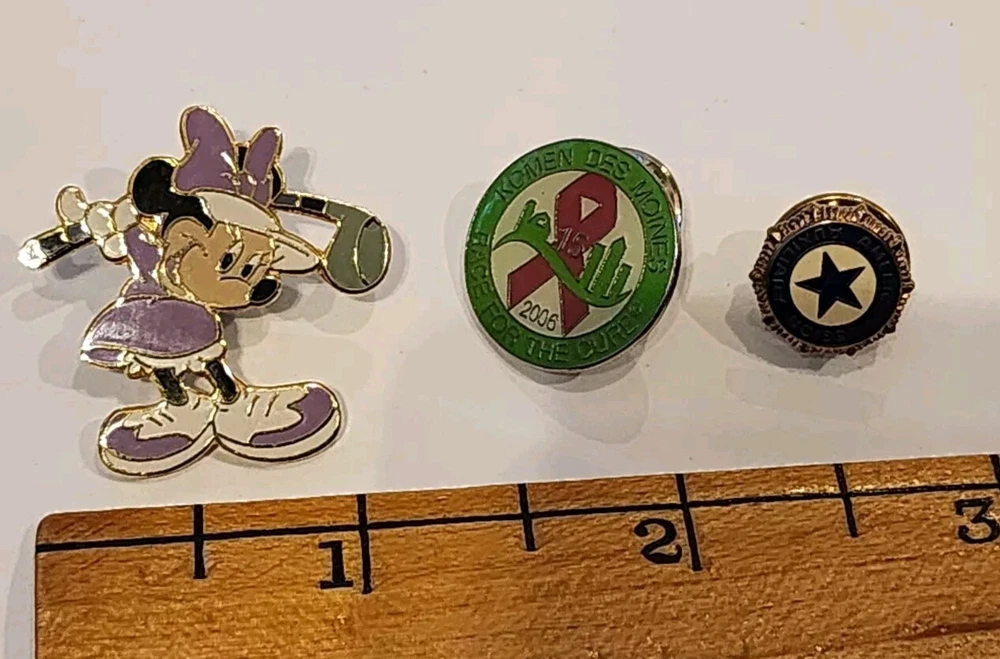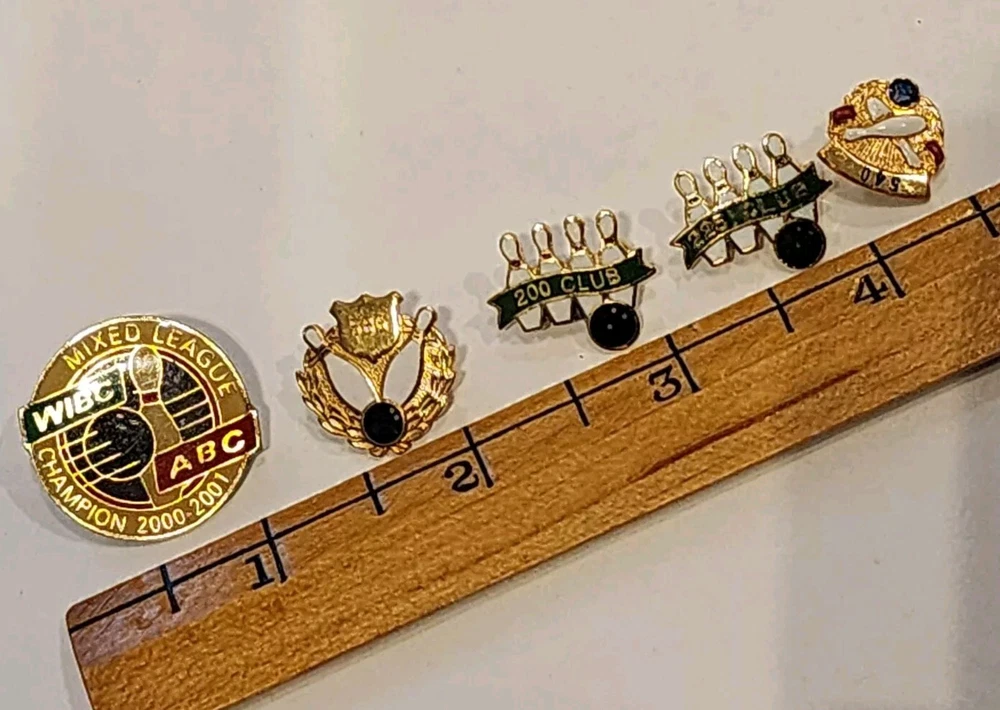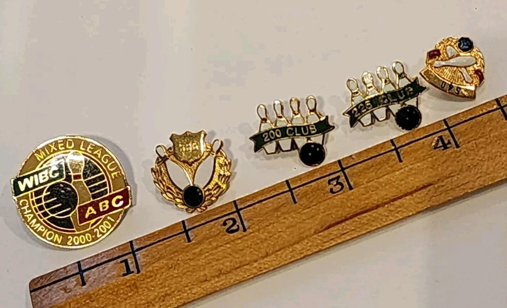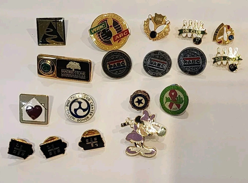 This is a group of lapel or hat pins. 3 round bowling pins ABC, League Runner-up '91-92, League Runner-up '88-89, League Champion 5 more bowling pins: 200 club, 225 club, 540 , 586, WIBC ABC Mixed League Champion 2000-2001 enameled Disney pin, Minnie mouse swinging a golf club. enamled house with a heart 3 in the shape of Iowa - LSS ( guessing Lutheran Social Services) One with a cross and a path one American Legion Auxilary The Blood Center one gallon donor Komen Womens Race for the Cure 2006 Statue of Liberty Madrid Home Coummnity Volunteer 100 hours, green stone. Buyer to pay shipping of $6.50