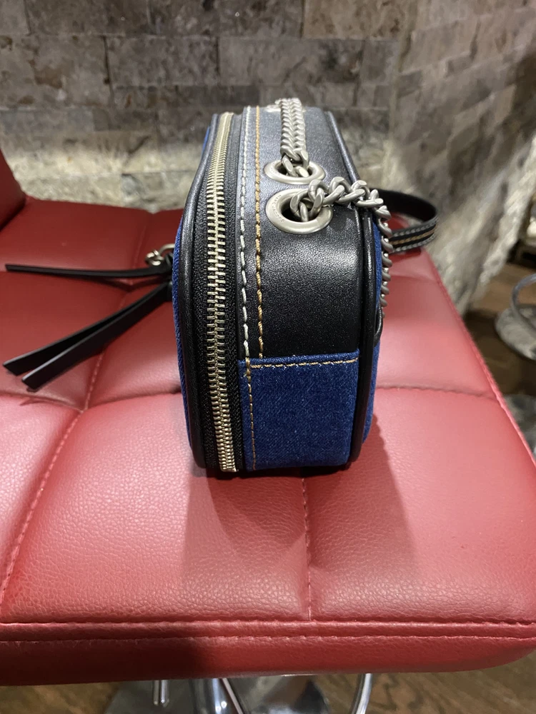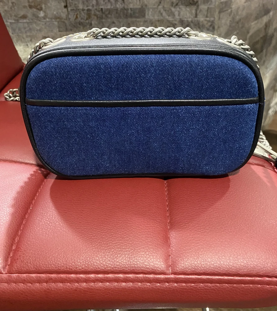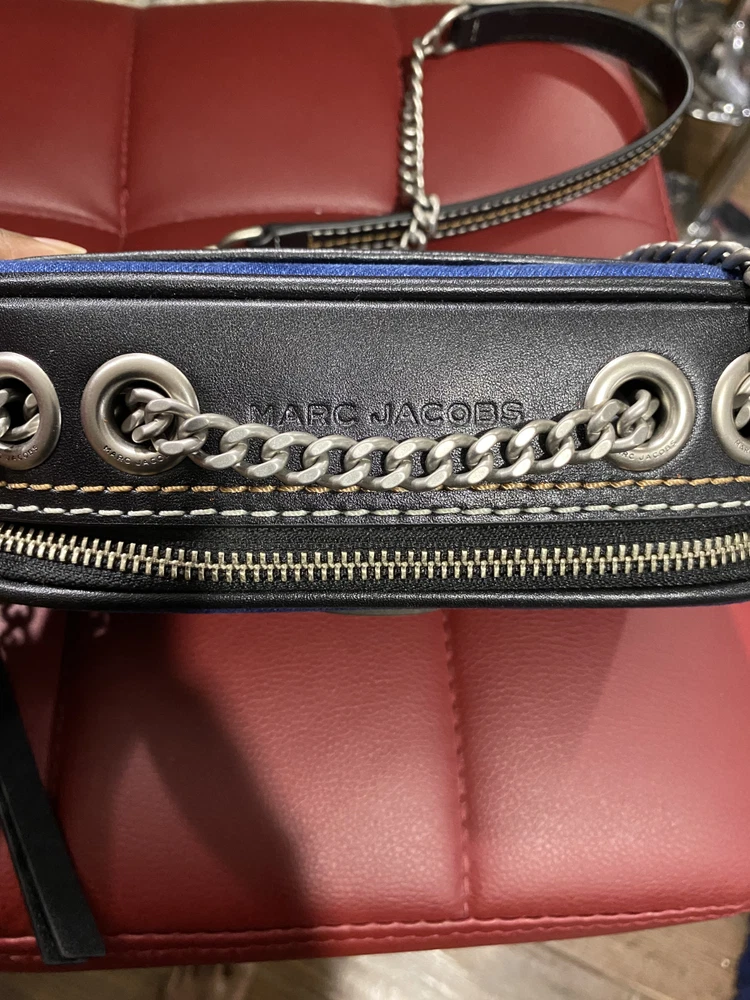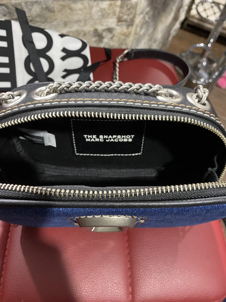 275.00This stylish Marc Jacobs crossbody bag is a must-have for any fashion-forward woman. The exterior is made of blue denim with a unique snapshot design, and the lining is a luxurious denim material. The bag features a medium size and a black leather handle/strap that adds a touch of sophistication to the overall design. The brand name is prominently displayed, making it a statement piece that will elevate any outfit. Perfect for everyday use or special occasions, this bag is sure to turn heads and make a statement.