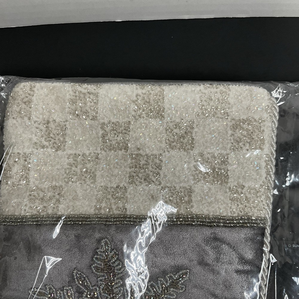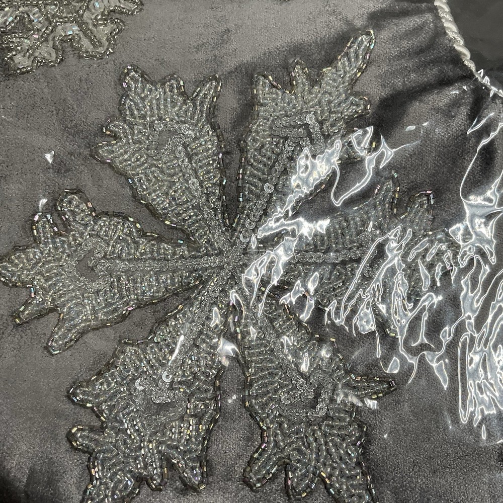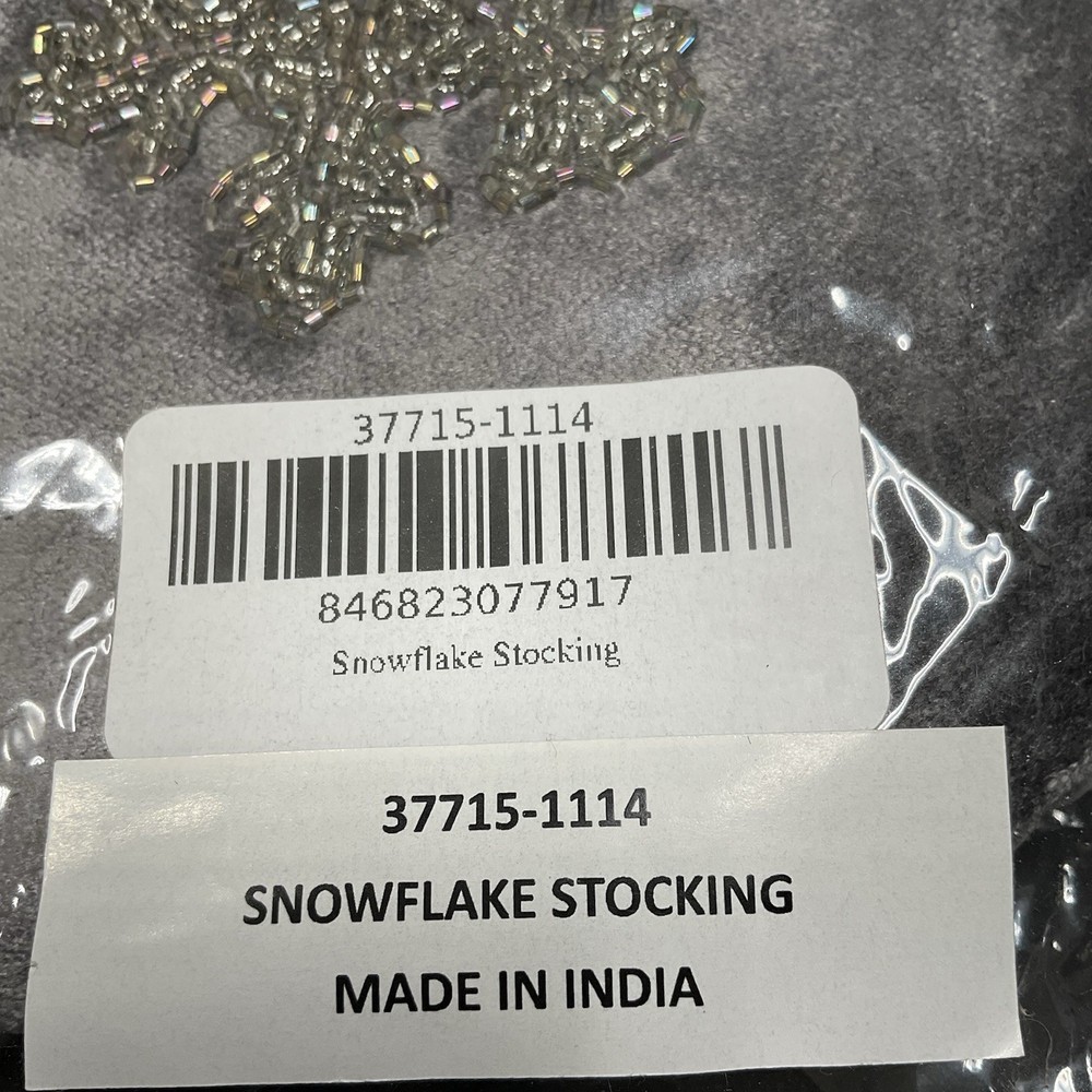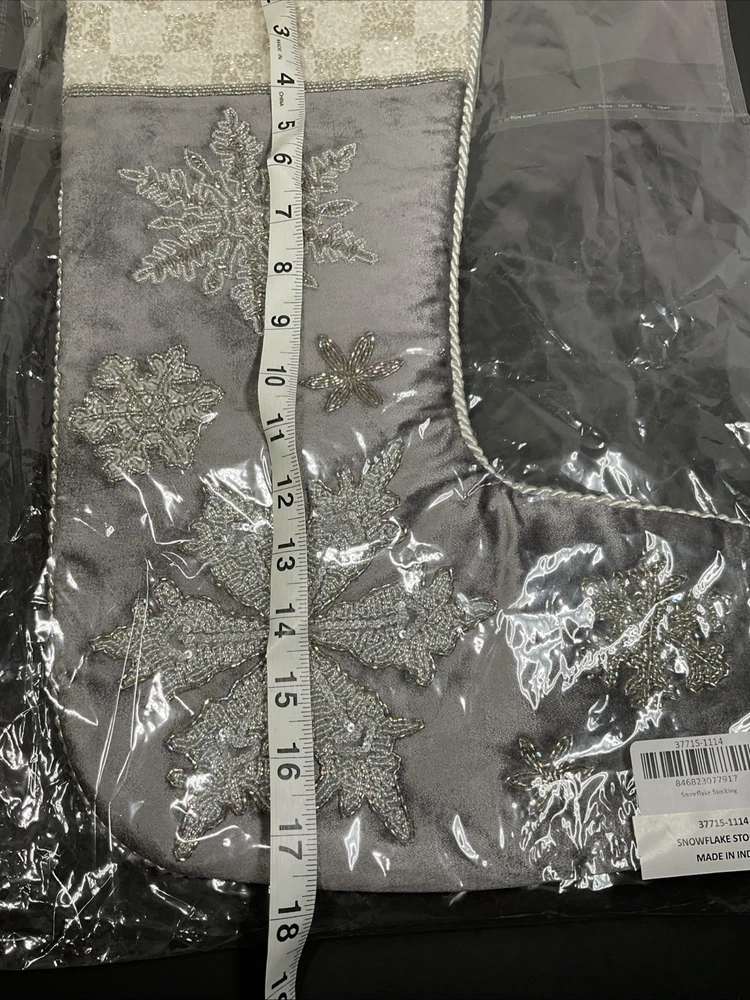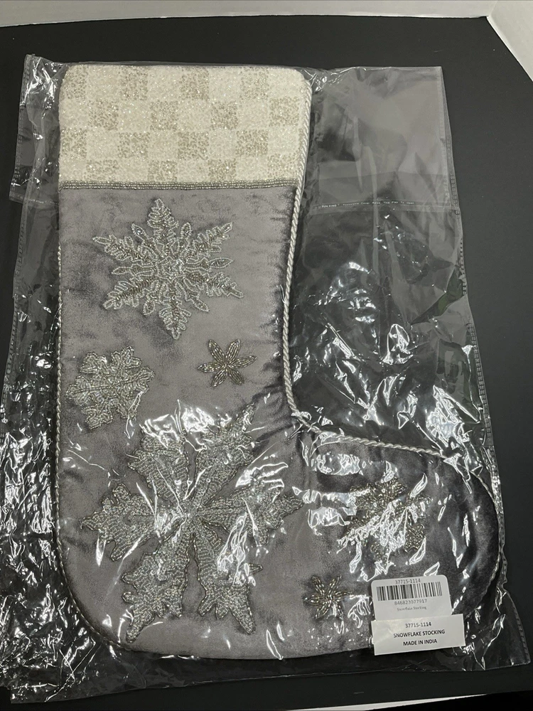 The MacKenzie-Childs Snowflake Stocking is a festive Christmas stocking featuring a gray color with a snowflake theme, perfect for the holiday season. Made in India, this stocking adds a touch of whimsy to your Christmas decor. With its unique design and high-quality construction, this stocking is a great addition to any holiday collection. Beaded snowflakes and trim still sealed in packaging