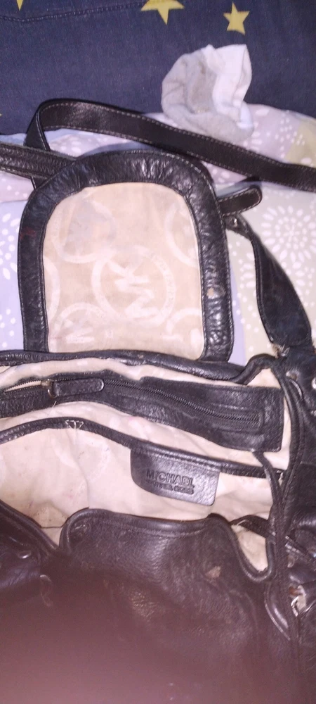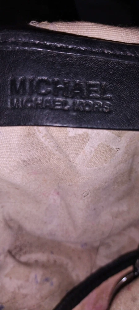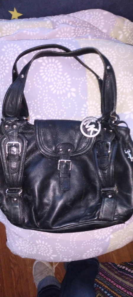 The Michael Kors handbag is a medium to Large -sized satchel/top handle bag made of black leather with vintage buckle accents on each side of the purse,this bag has a with a leather flap and button closure also it features two black handles made of genuine leather on each side. The inner lining is beige canvas clean with MK°symbol throughout the purse ((*has a small barely visible stain on the inside).I don't think it's permanent.The infamous MK © Symbol stamped initials in metal. This stylish bag is suitable for various occasions such as travel, weddings, parties, workwear, and business, catering to all pocketbook lovers ,designers, money-conscious, country, city, or plain,punk to preppy theme.!! Enjoy this great bag!!