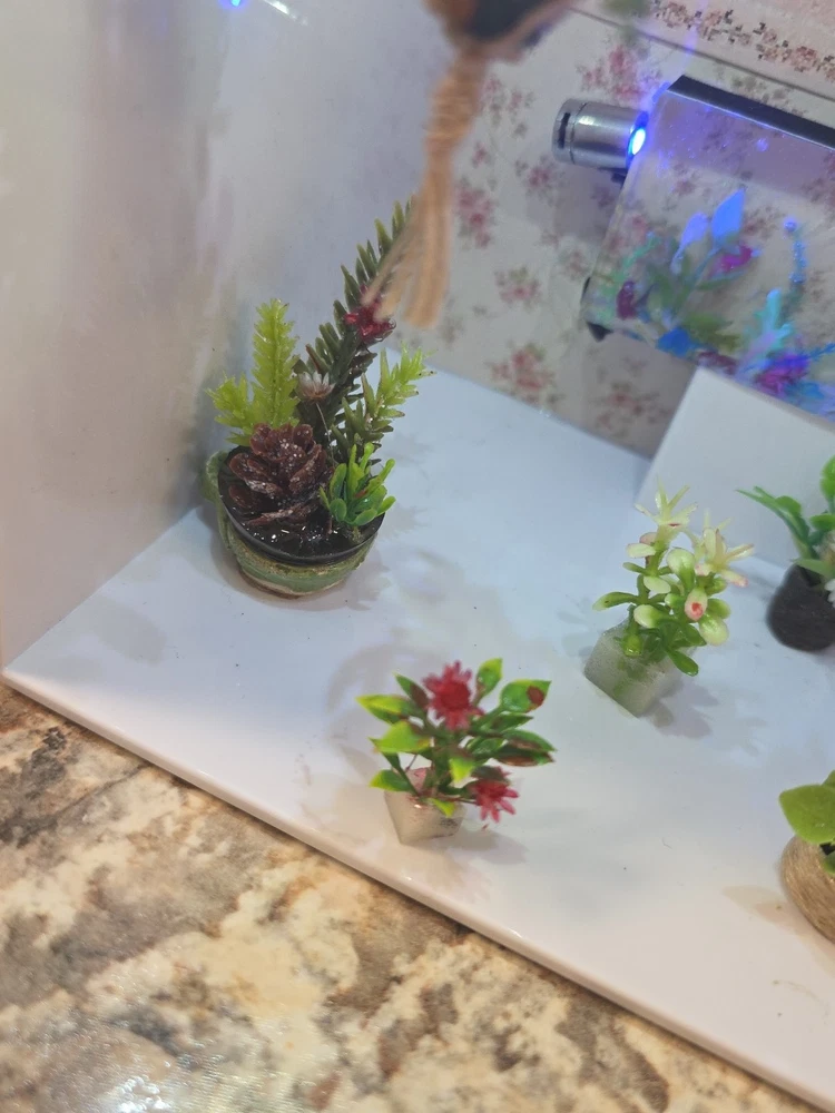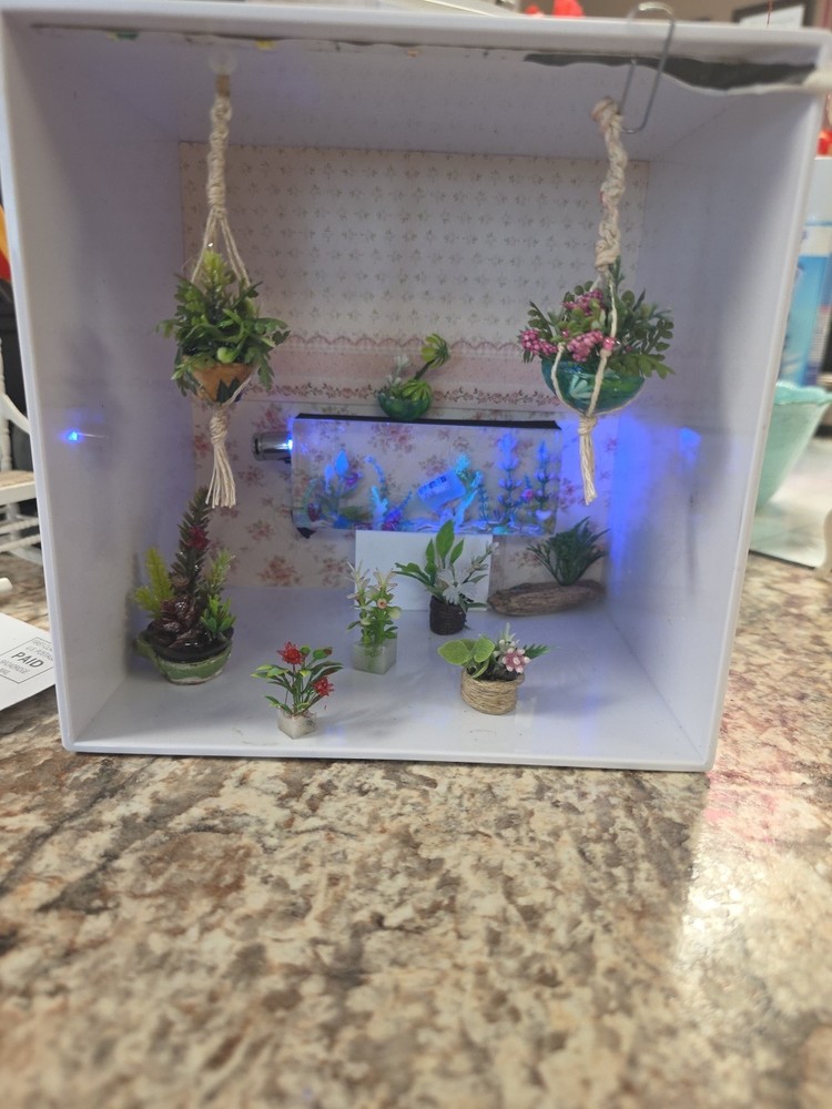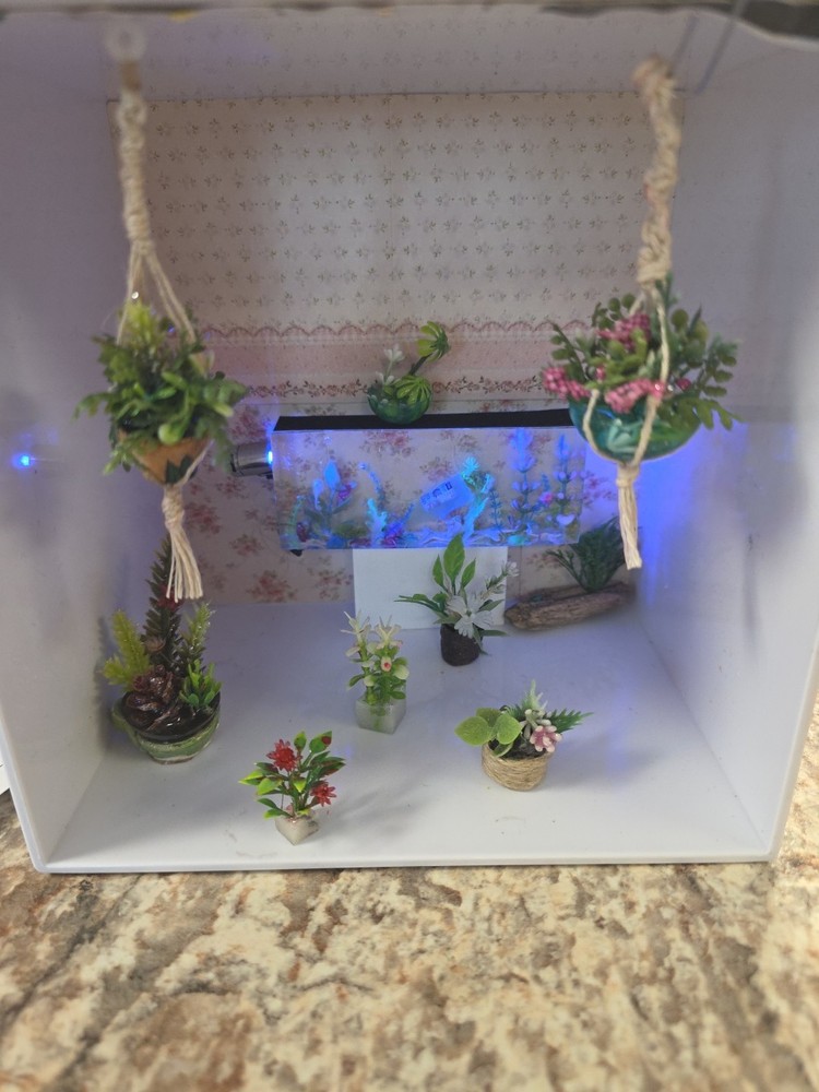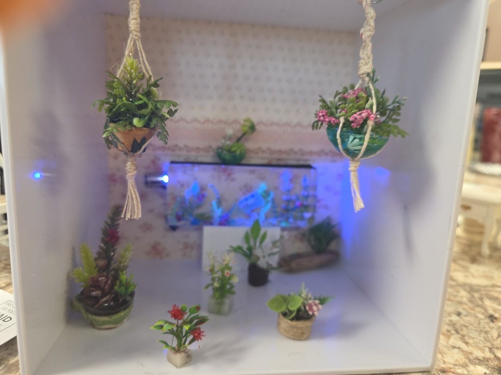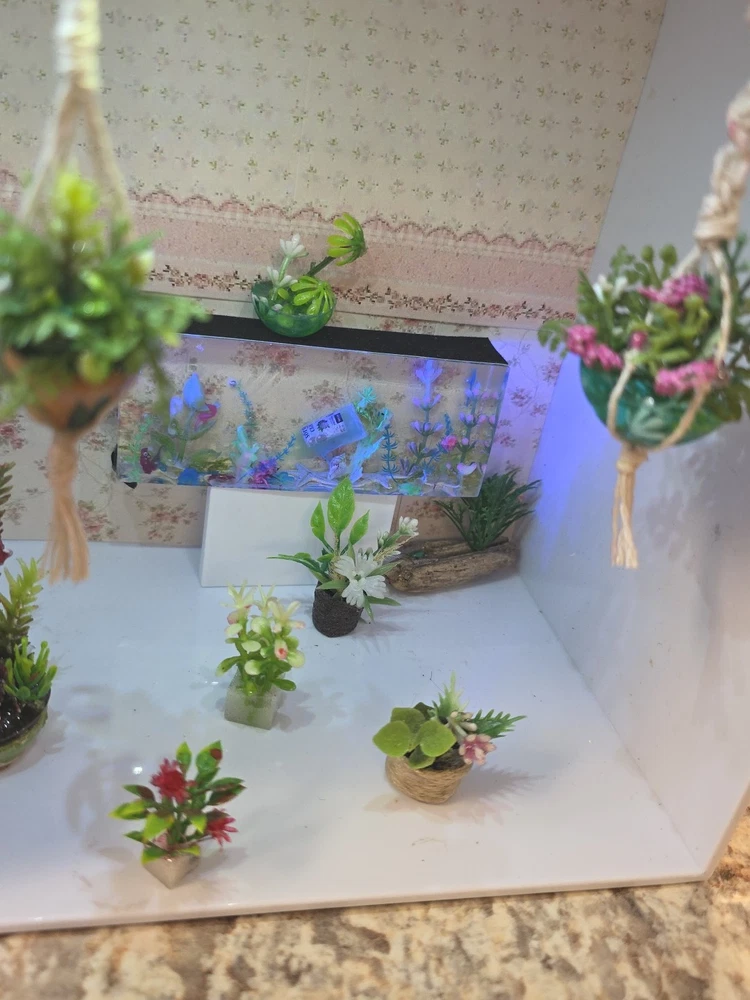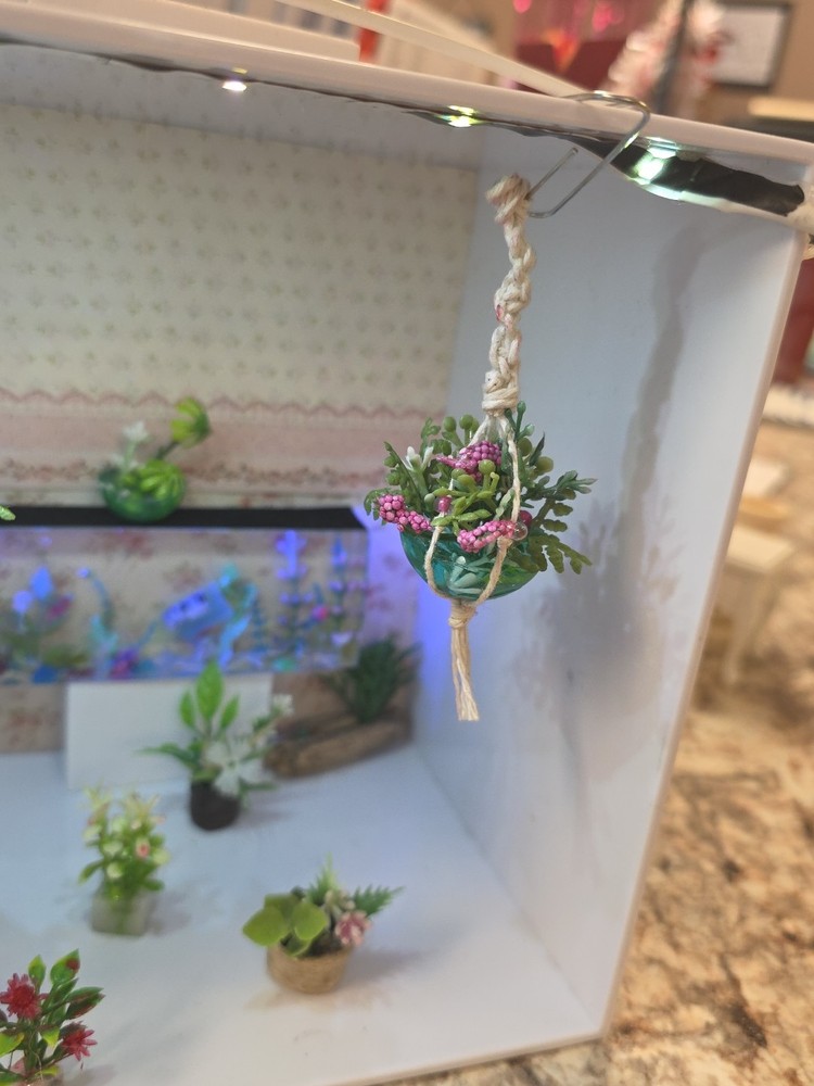 The Macromae plant hangers for dollhouses are designed in a 12:1 scale, making them perfect for dollhouse enthusiasts aged 12 and above. This lot of plant hangers adds a realistic touch to dollhouse décor, bringing a sense of nature and charm to miniature environments. The hangers are ideal for creating lush and inviting spaces within dollhouse settings, making them a must-have accessory for any dollhouse enthusiast looking to add a touch of greenery to their collection. Everything you see is included, even the fish tank